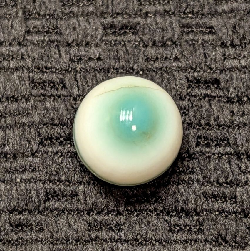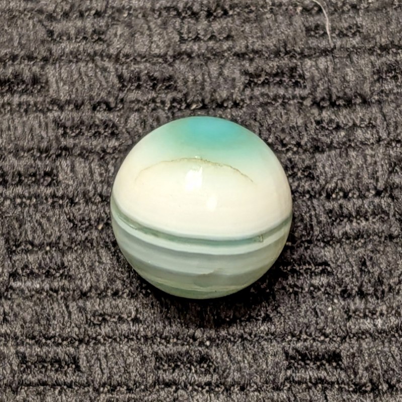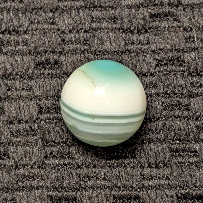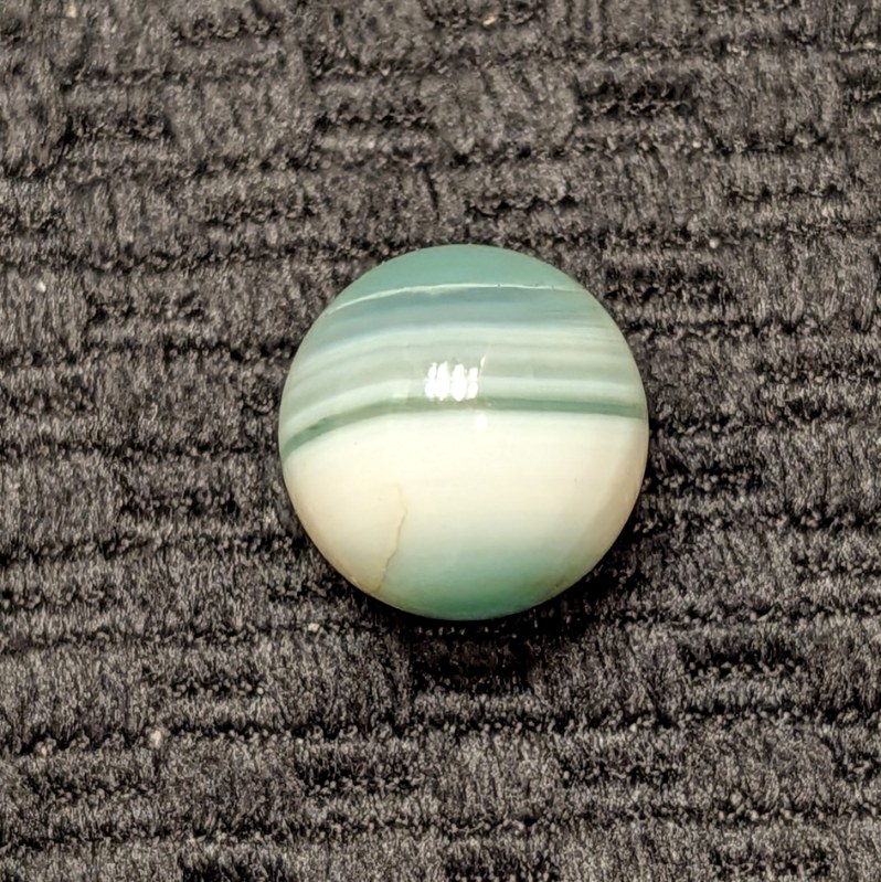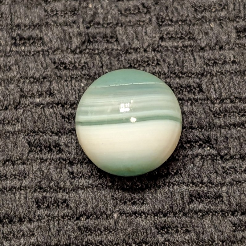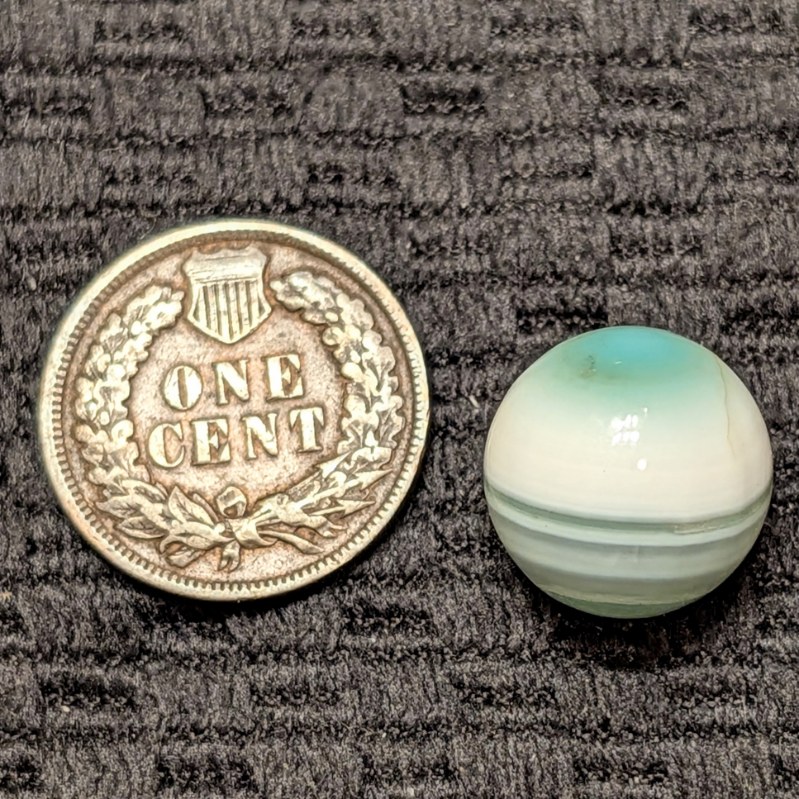 Small 1/2″+ RARE Green Dyed Agate w/ Rings and and Green Dot Eye. Old German Hand-Cut Agate with Tiny Facets on the Surface from being Rounded by Hand, and most workers died early of pneumocilicosis from breathing in the rock dust. Wet Mint original surface with natural cleavage planes and a tiny remnant of the cut surface of the original cube it was rounded from. No play damage at all.  Coin not included.
