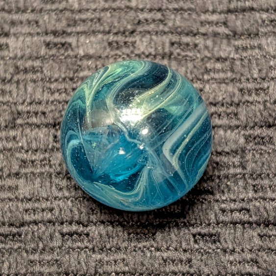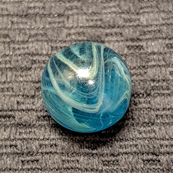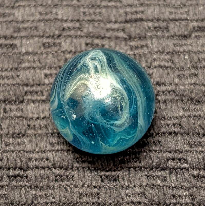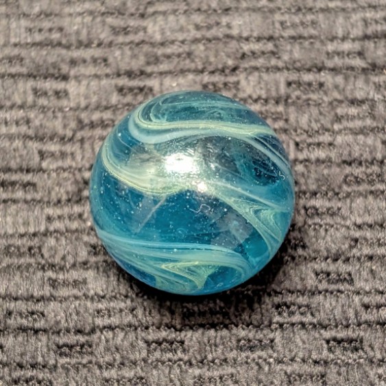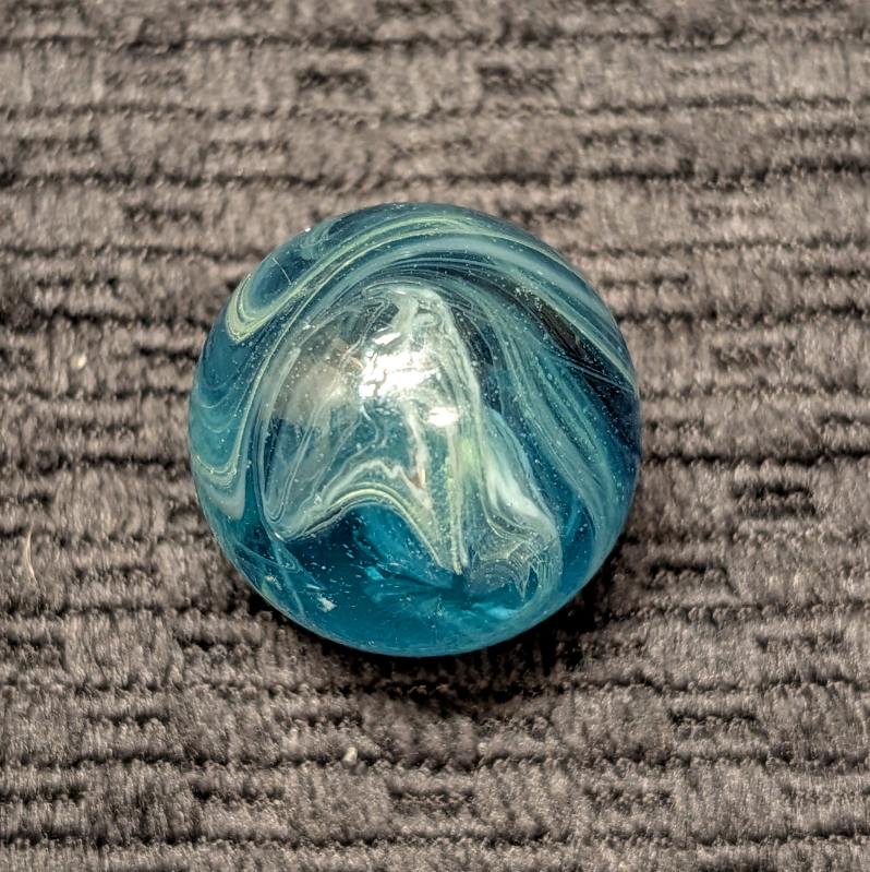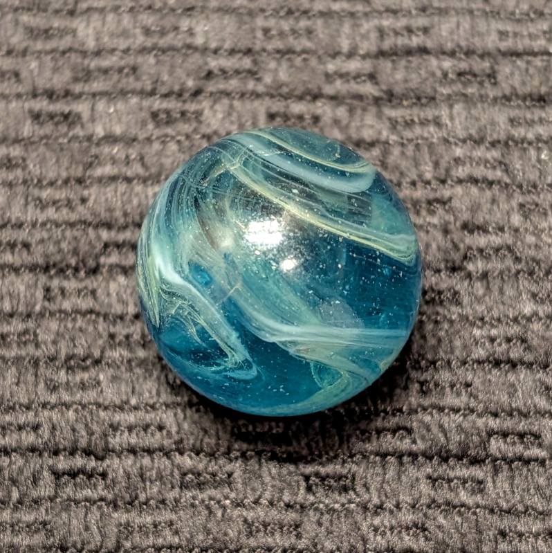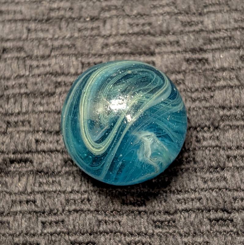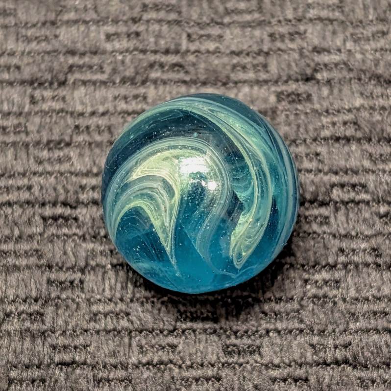 Rare Large Aqua Glass Single Pontil Hand-Gathered Greiner w/ Wispy Egg Yolk Swirls. One flea on this Greiner that’s larger than most at nearly 7/8″. Wet Mint.