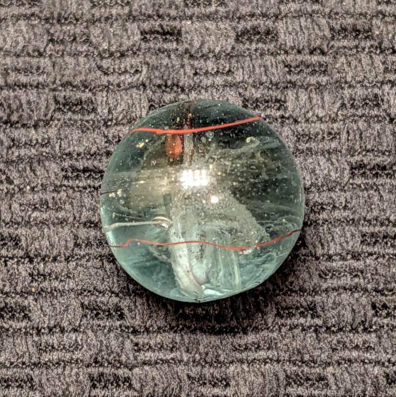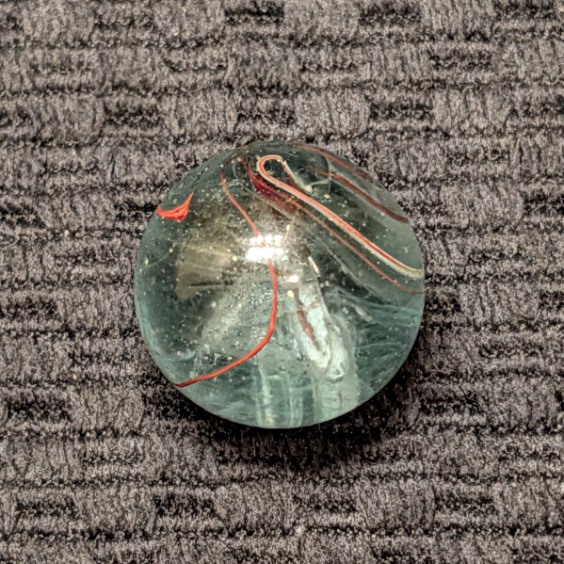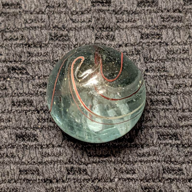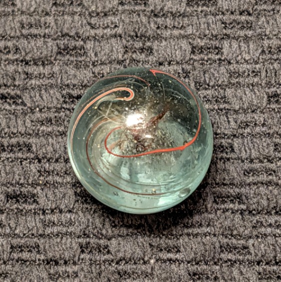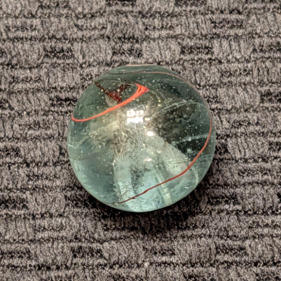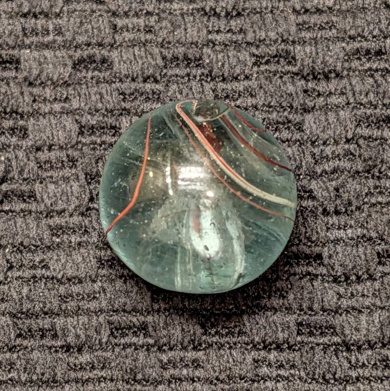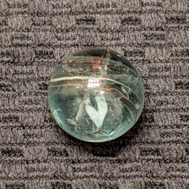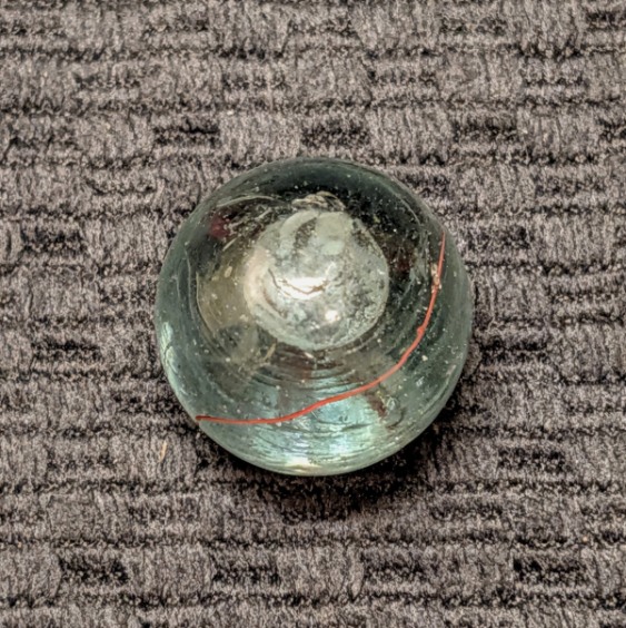 13/16″ Greiner w/ a Hint of Egg Yolk, an Internal Ghost Core and White Loops. This is a very early hand-gathered Silas Greiner German marble with a single faceted pontil, circa 1840-1860. Mint.
