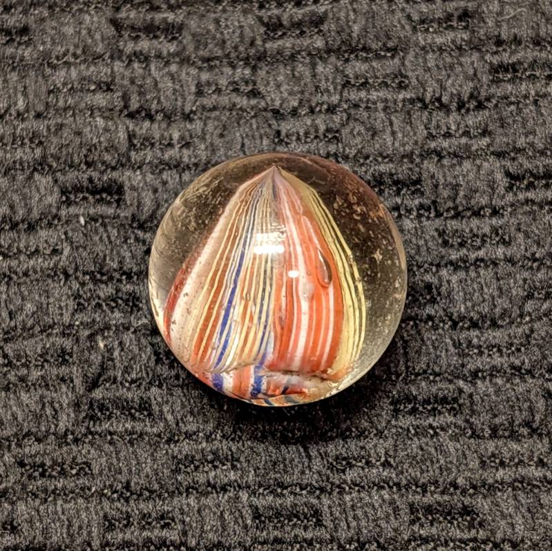 Rare End-of-Cane (1st off cane) Razor Ribbon of Stripes of Red-White-Blue, with 10 closely spaced Yellow Threads above the face of each ribbon, and narrow capping ribbons of Jelly Red Stripes over White Suspended along the edge of the ribbon. A Single Faceted Pontil Marble that Flares and comes to the surface on the opposite side! Mint- original surface with tiny tic.