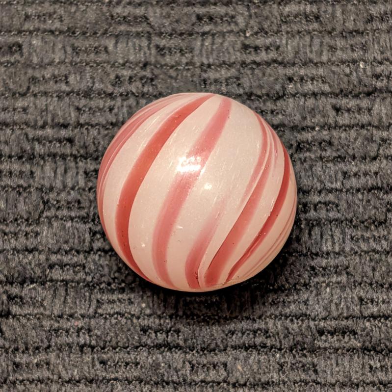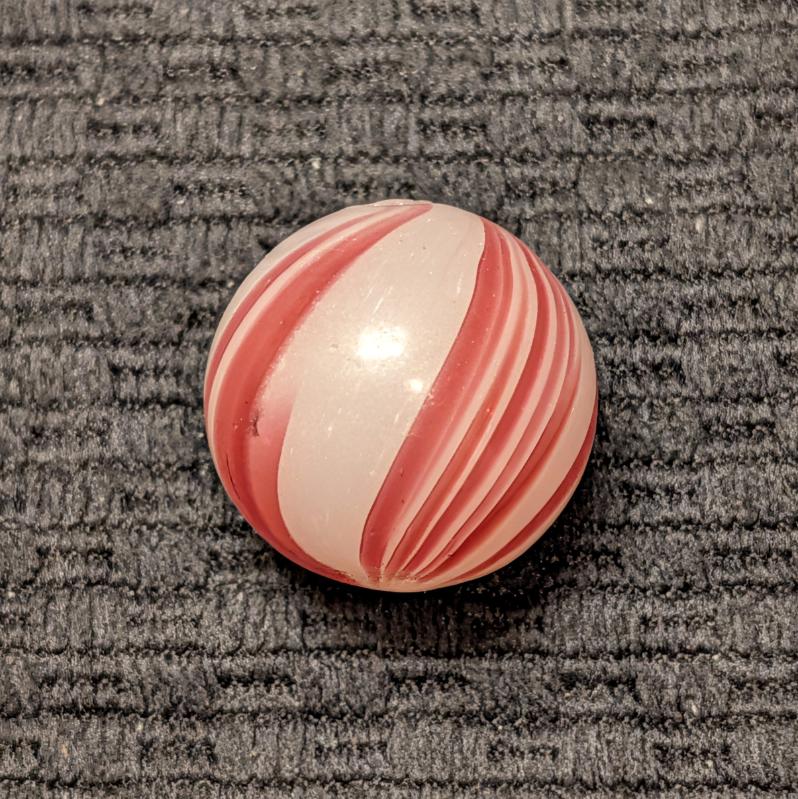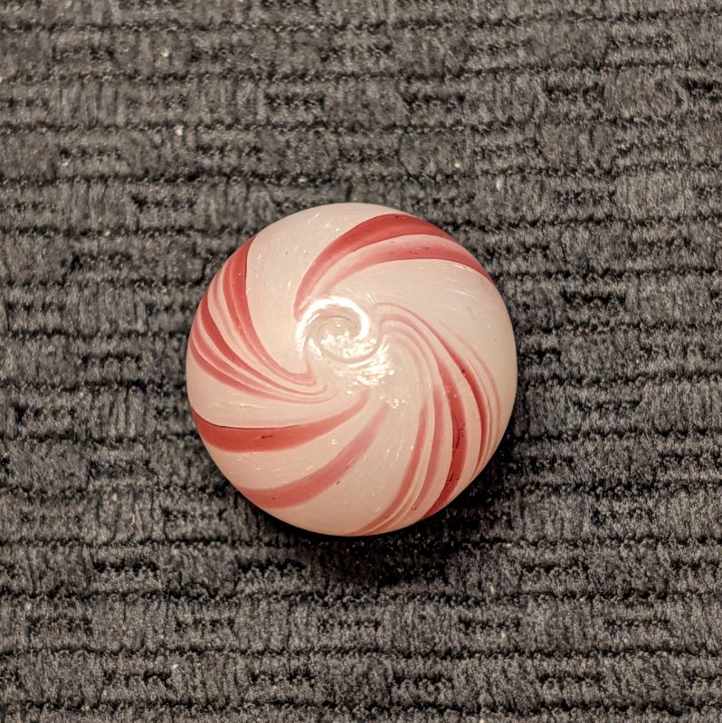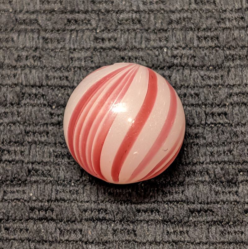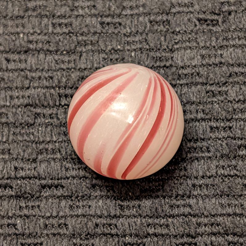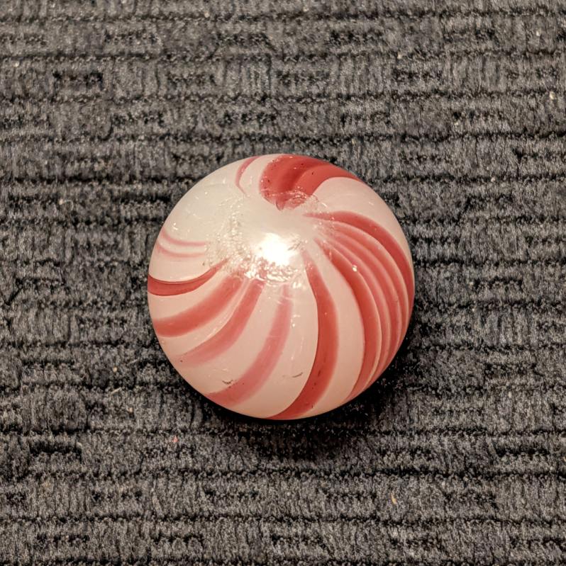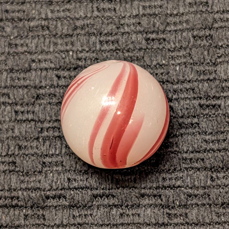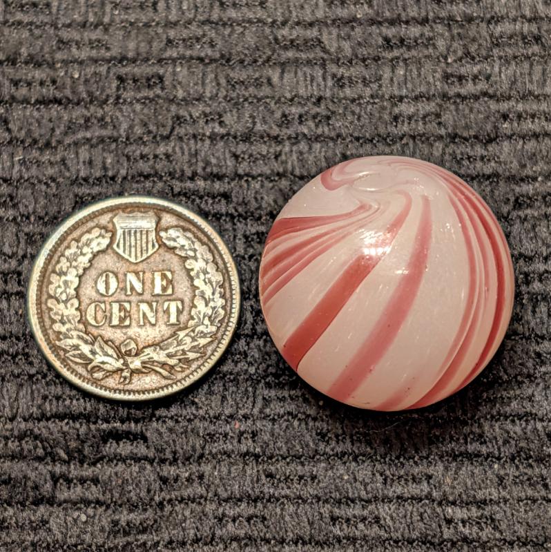 VHTF Big 7/8″ Banded Opaque of Red over White. The red bands are spread over the vast majority of the surface.  These big ones are incredibly hard to find this nice, it’s in exceptional shiny original surface condition with a faceted pontil dating this to around 150 years old, or possibly more. Wet Mint- with only a tiny tick near the cupped pontil. Coin not included.