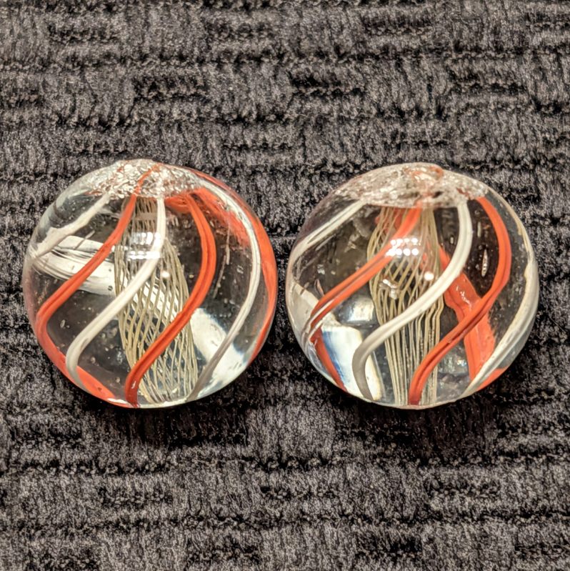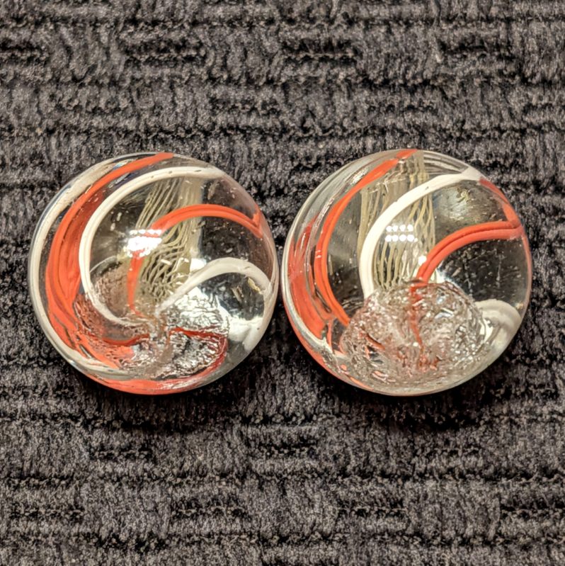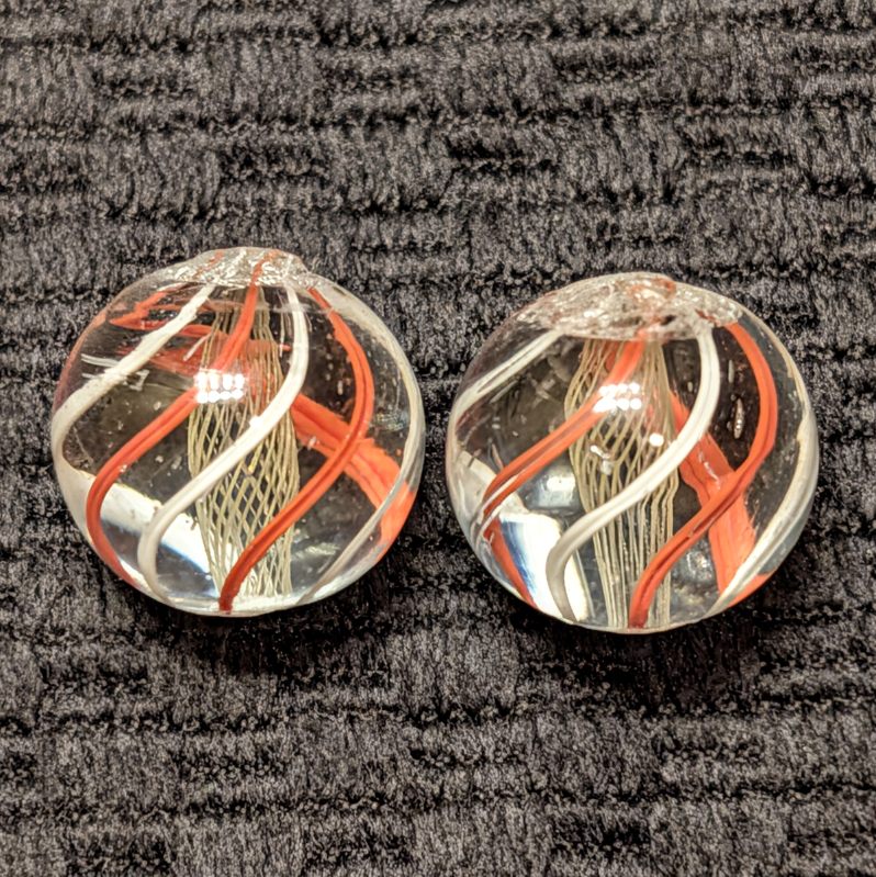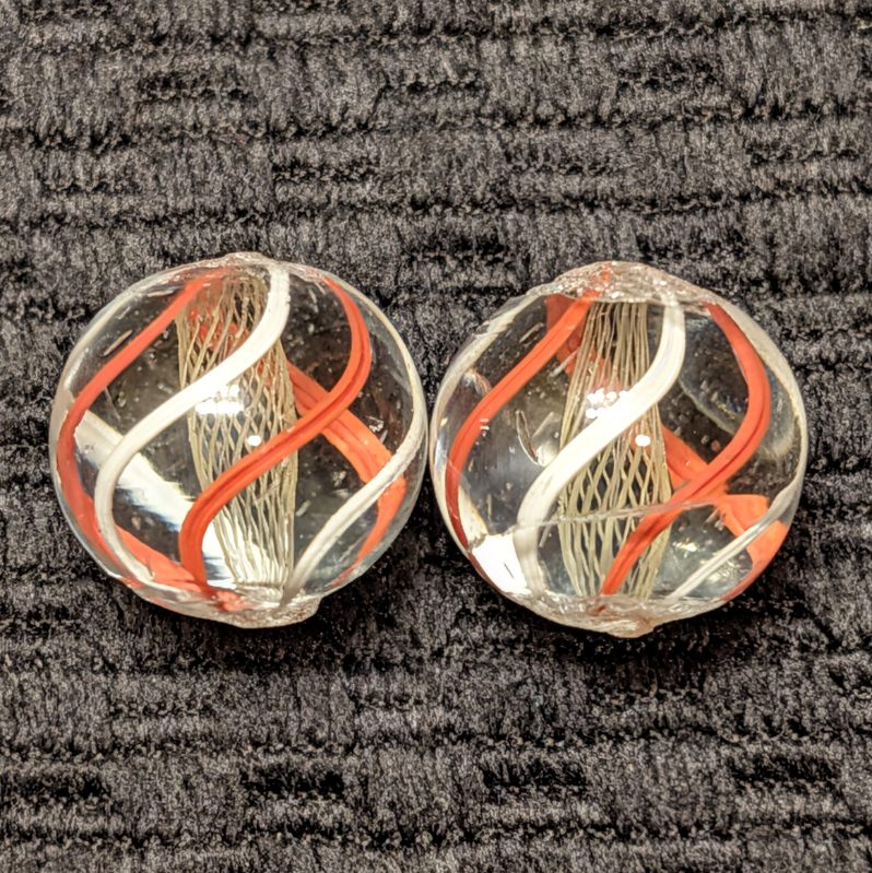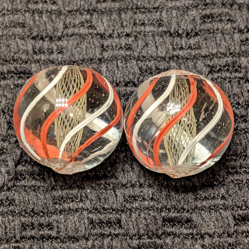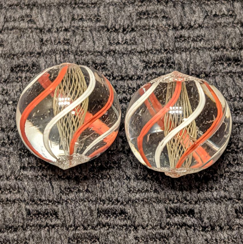 Same-Cane Set of Fine Yellow Latticino Net-Like Latticino Swirls with exceptionally executed craftsmanship. There’s 6 evenly spaced outer single color ribbons of orange and white alternating. These have stayed together since they were made well over years ago! Wet Mint.