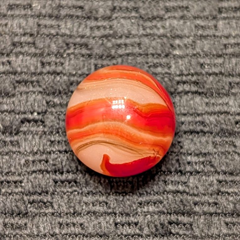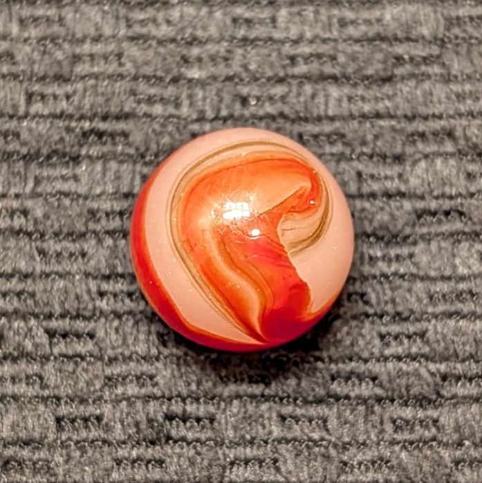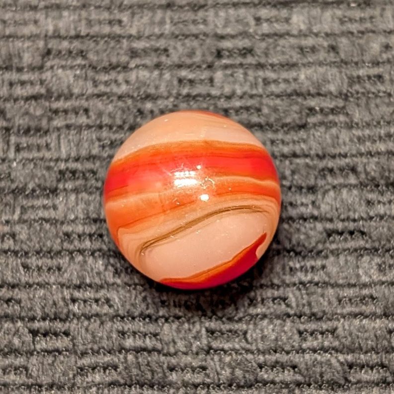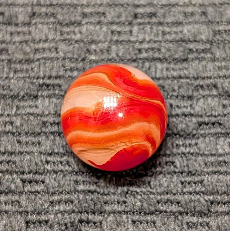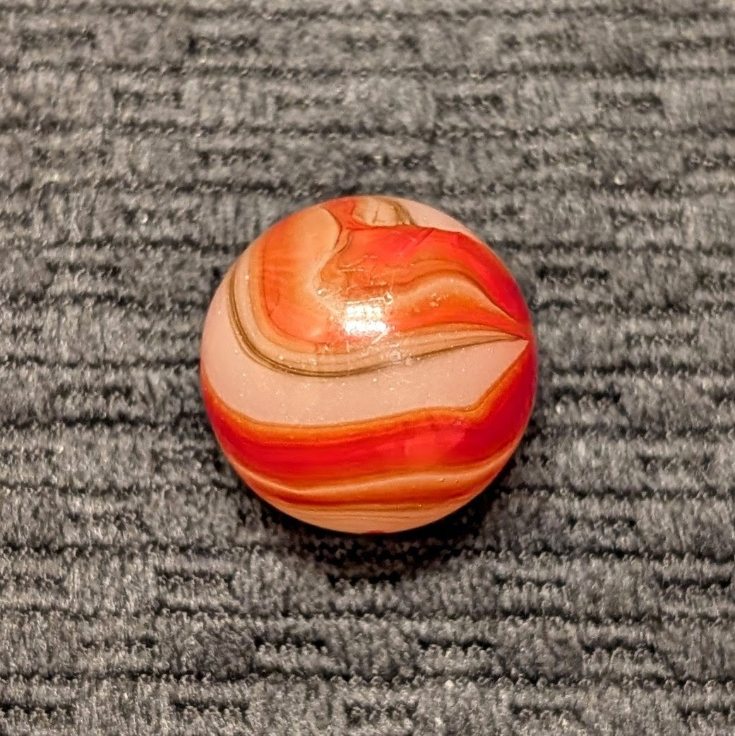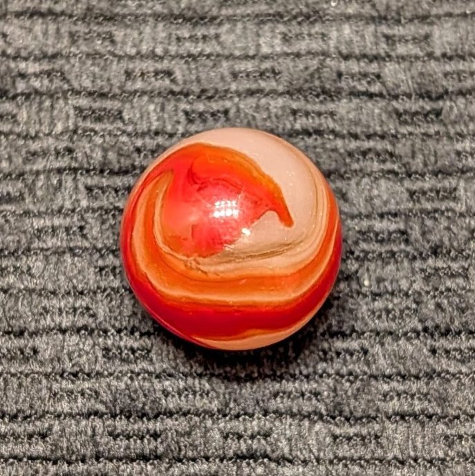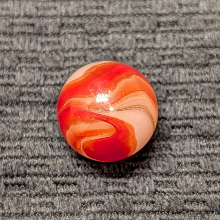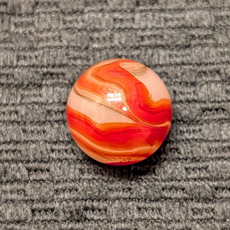 Shooter 3/4″ Twin Orange Corkscrew w/ Wispy Oxblood Tracer over Moss Agate Base. Only one reflection and flea on a Wet Mint surface.