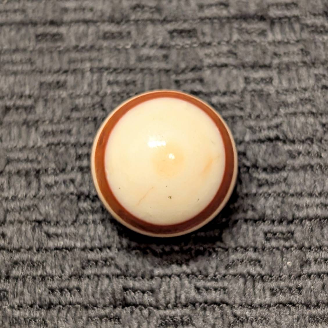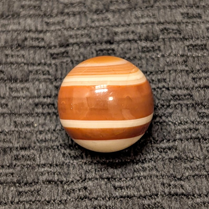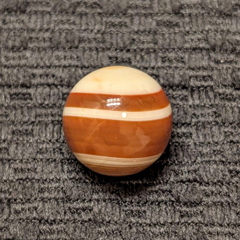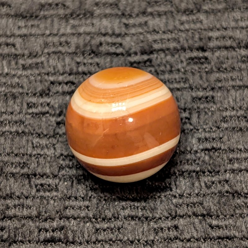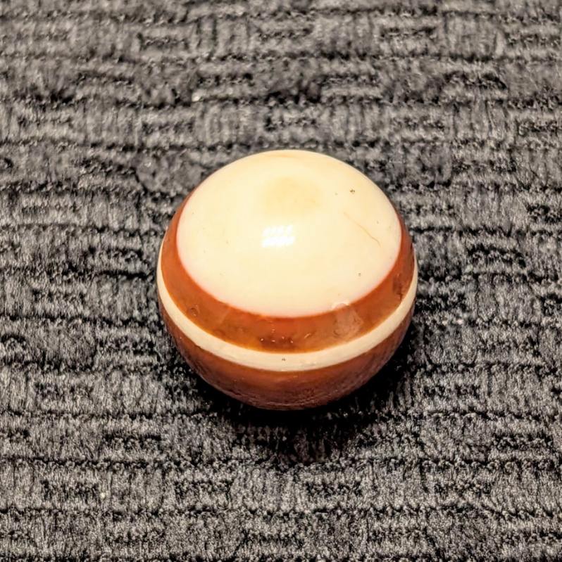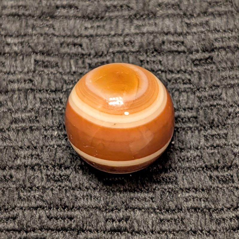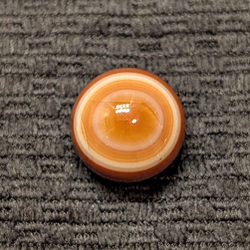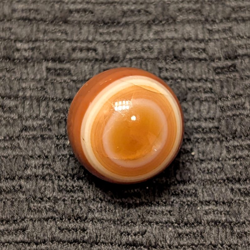 Attractive Well-Made Shooter Size 3/4″ Hand Faceted Bullseye Carnelian Agate of Red, Brown & White Rings and Circles. Circa mid 1800’s. Wet Mint.
