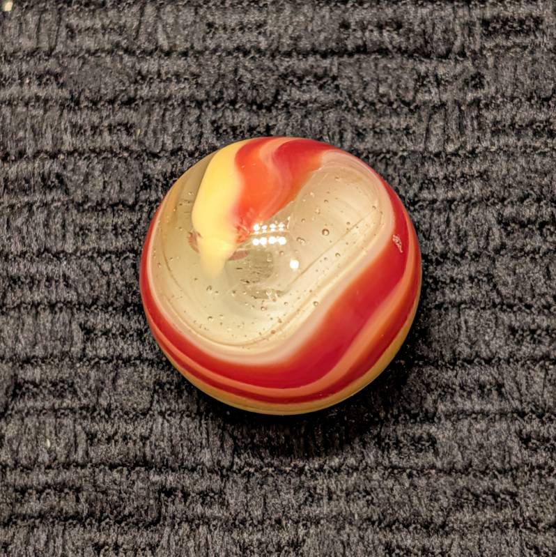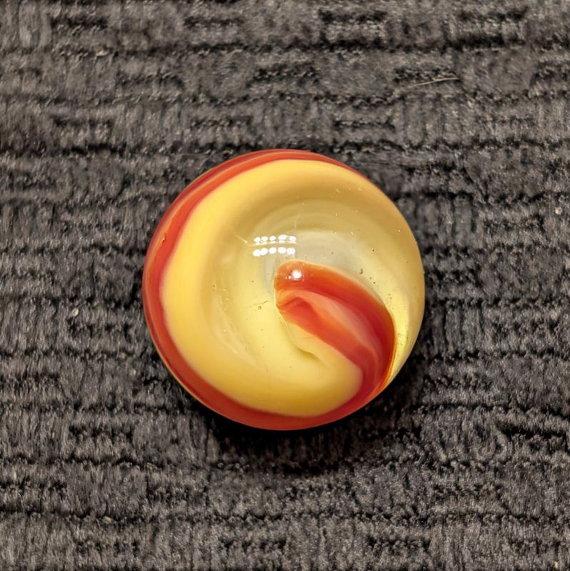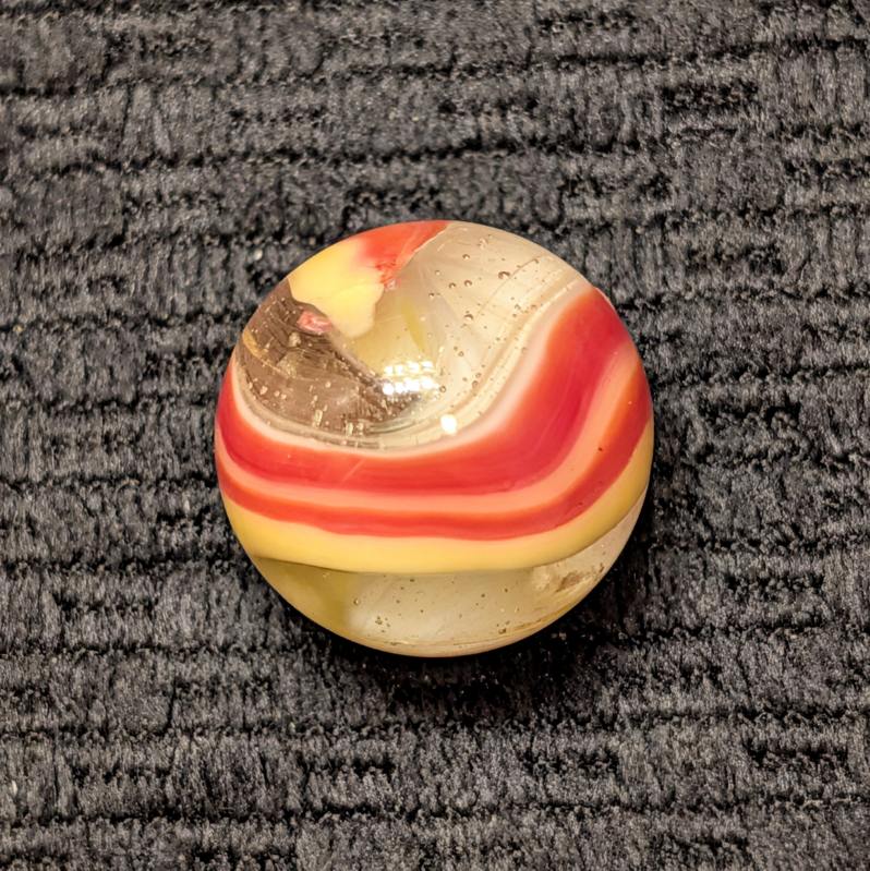 23/32″ Shooter Popeye with Double Striped Tomato Red & Yellow Pattern with White and Clear. Not a lot of stringy white with a micro barely visible annealing line. Probably wouldn’t even know it’s there but I report everything. It’s a non-issue in my opinion. Wet Mint-.