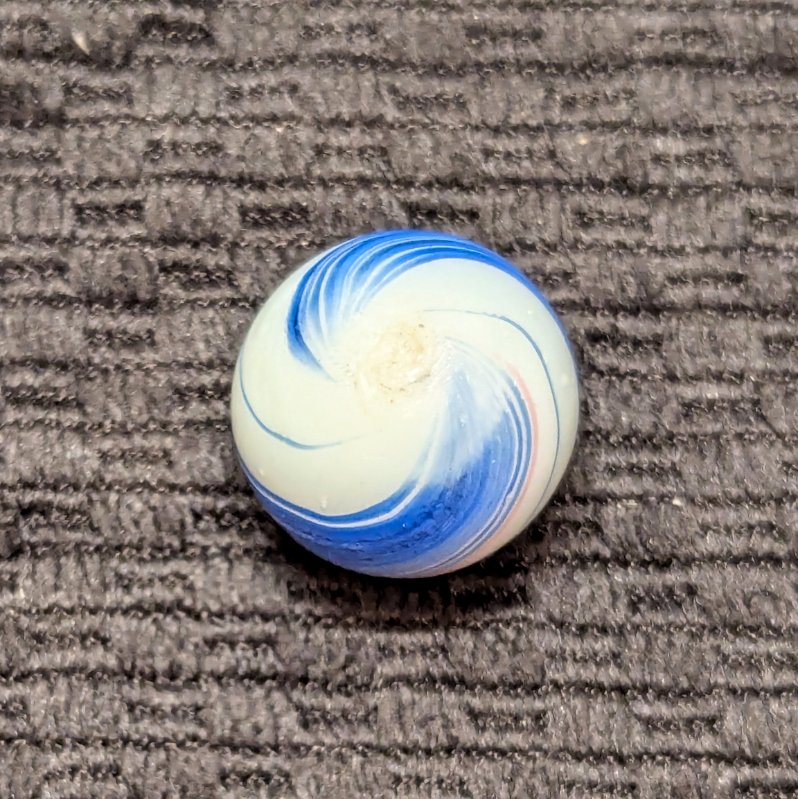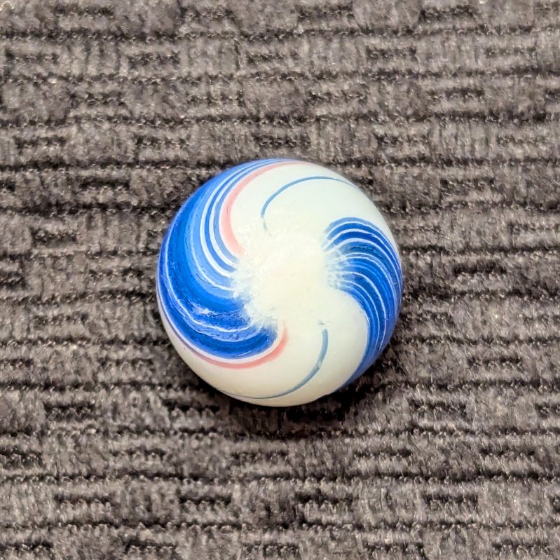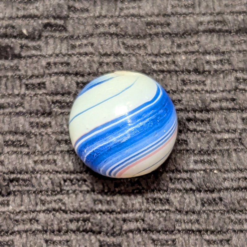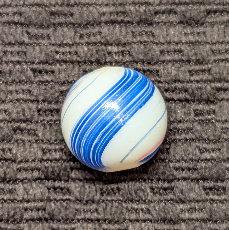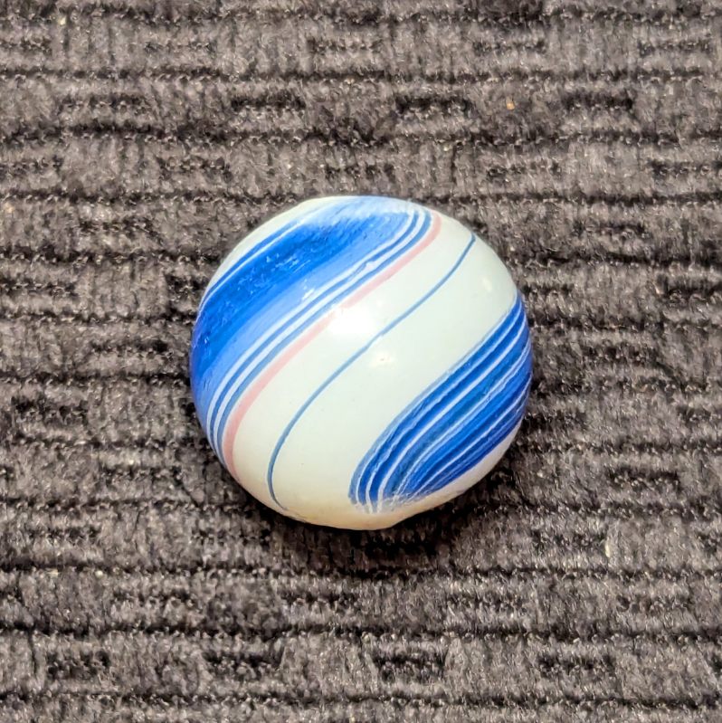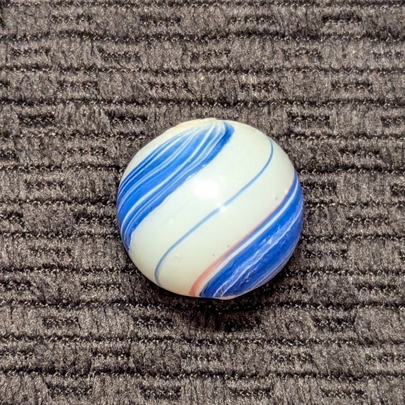 Shooter Size 3/4″ Banded Opaque w/ Wide Blue & Red Bands over a White Base. Nice unusually large size. Mint- with minimal evidence of handling.