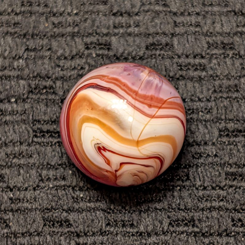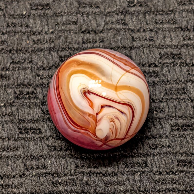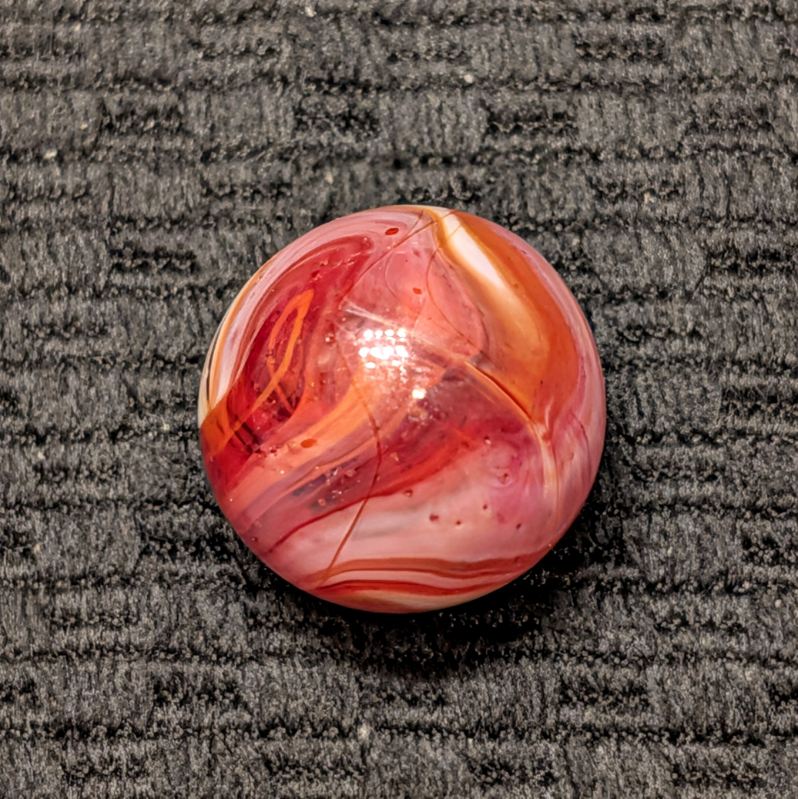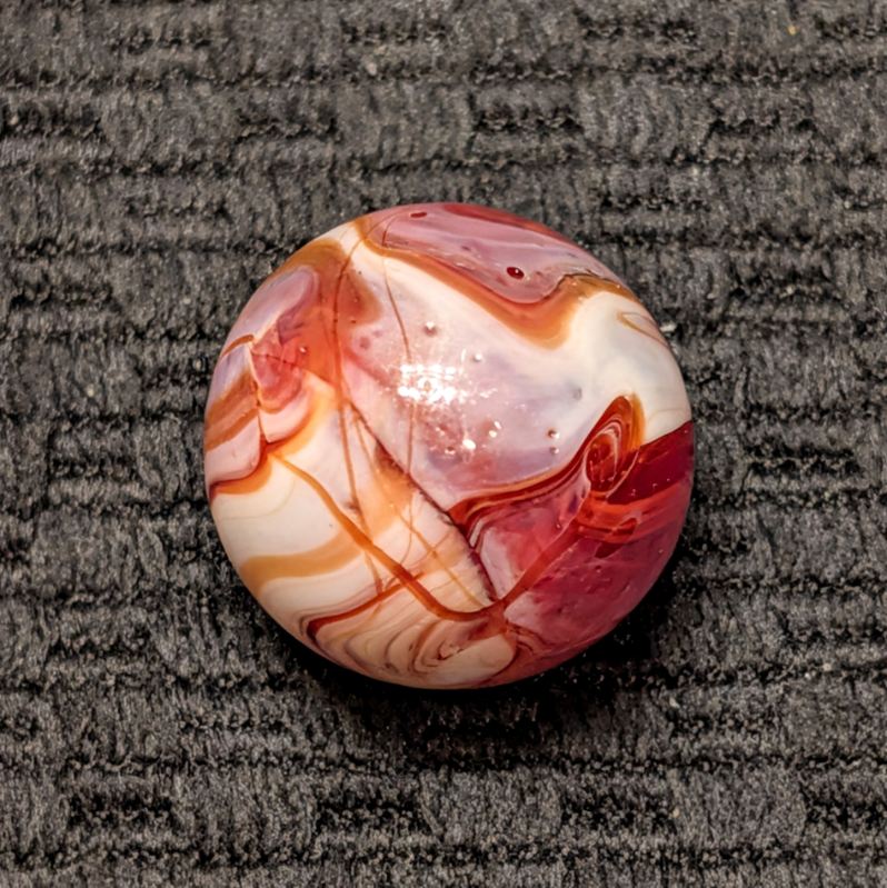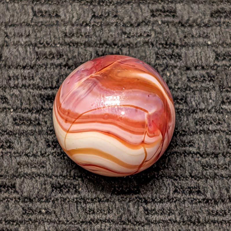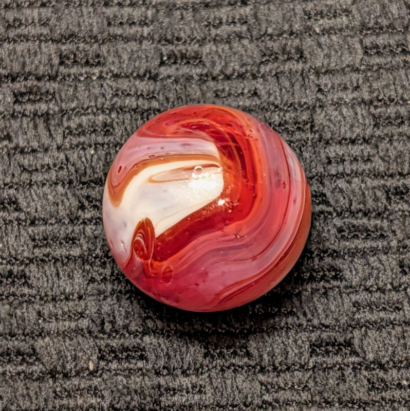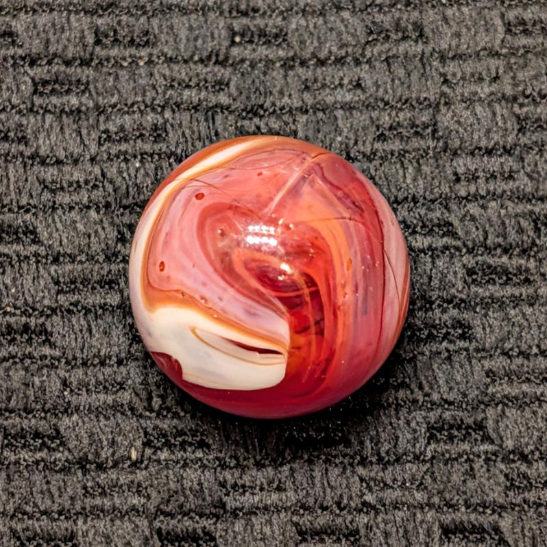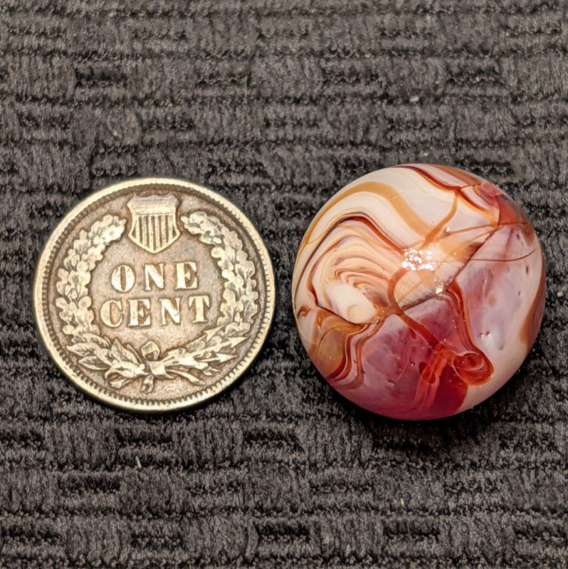 Unusual Shooter Size 3/4″+ CAC Red & Orange Slag w/ Swirling “9” Pattern, Tail, Cut Line & Drizzle! Wet Mint. Coin for size comparison, not included.