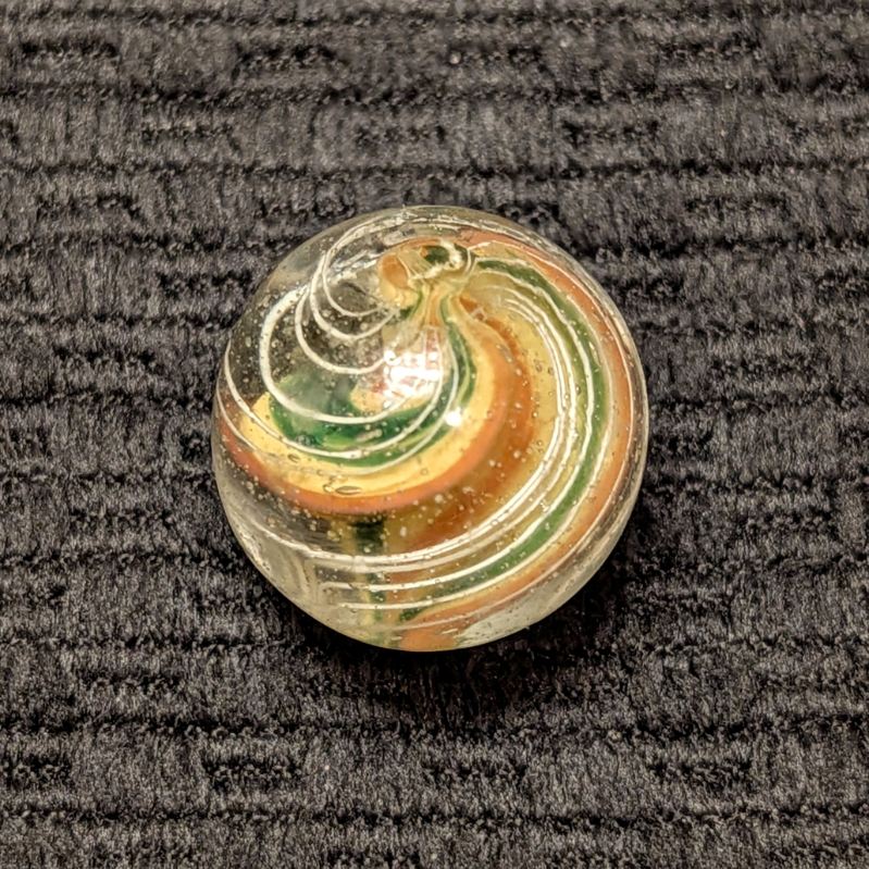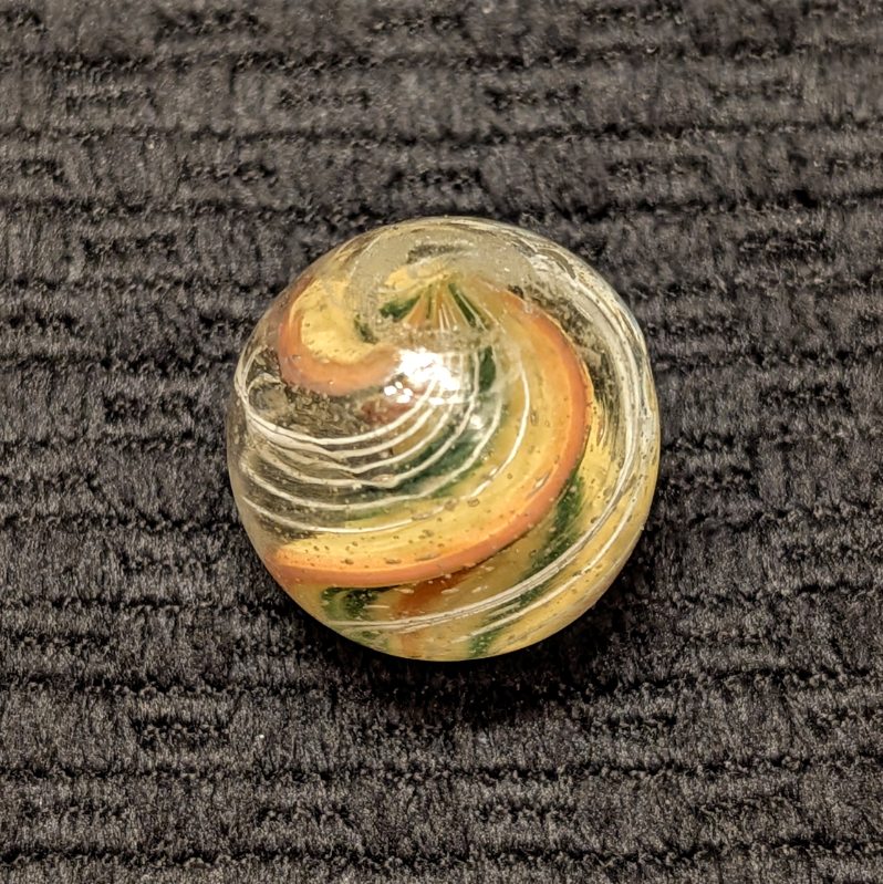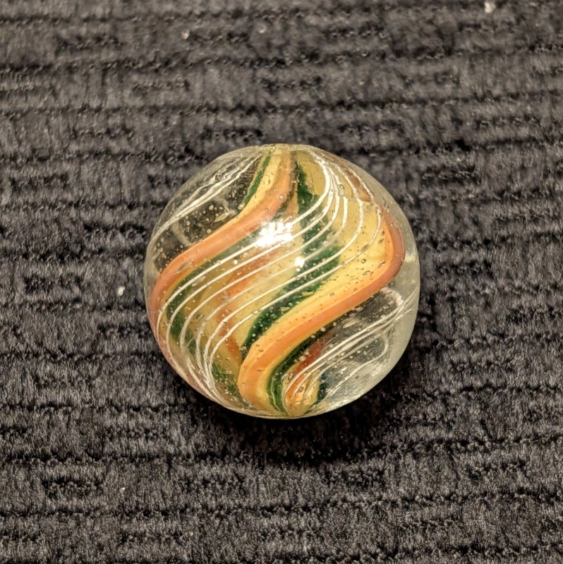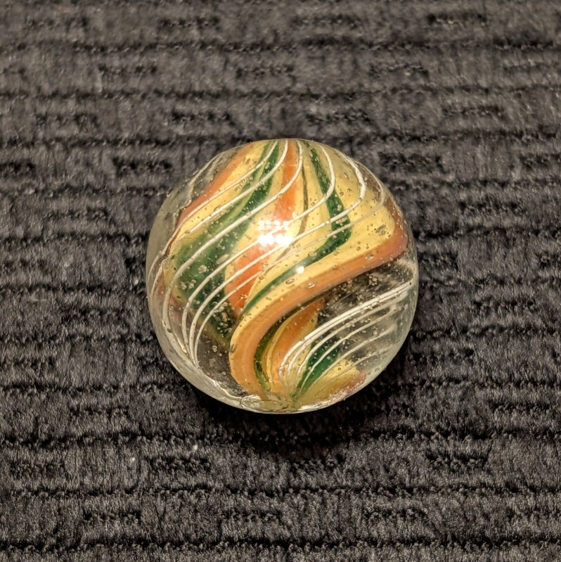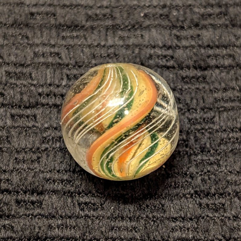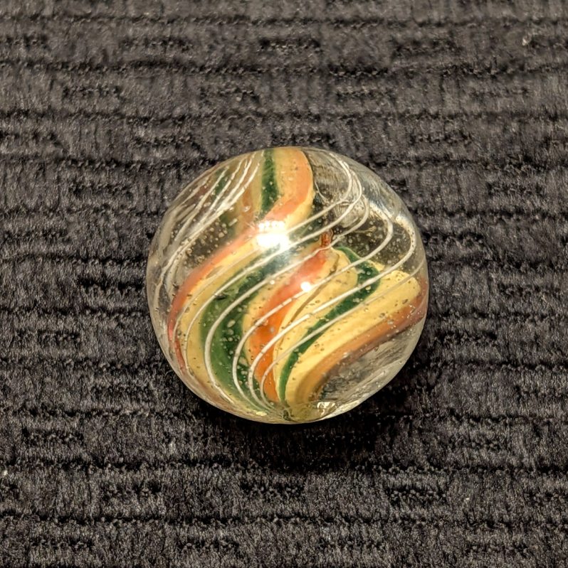 Shooter Size 3/4″- Yellow Ribbon Core Swirl with Green and Orange Stripes, and Edged in Orange. Suspended over the face of each ribbon are groups of 6 thin white treads. The pontil is an early faceted one, dating this from between 1850 to before 1880. Nice twist, beautiful craftsmanship and eye appeal. Mint Condition.
