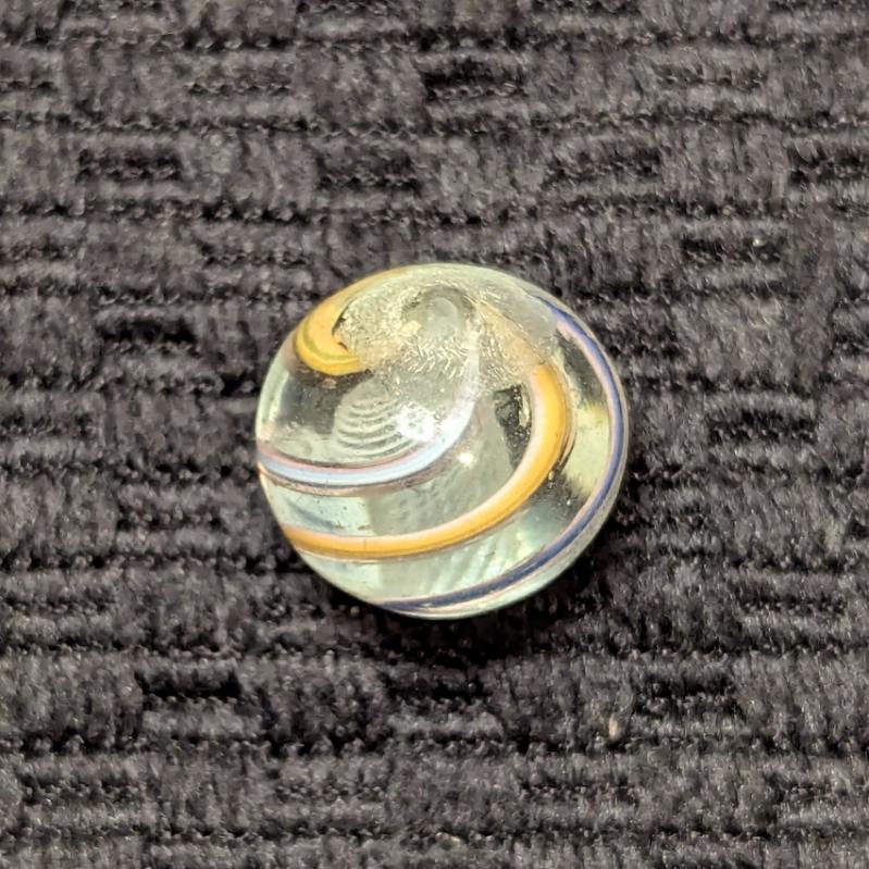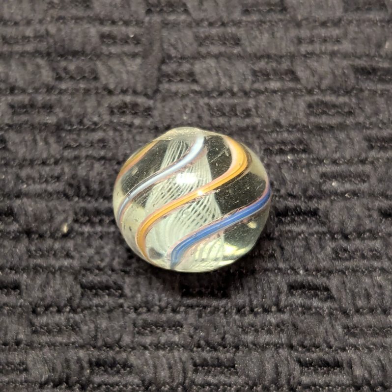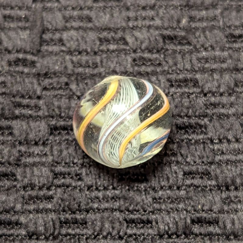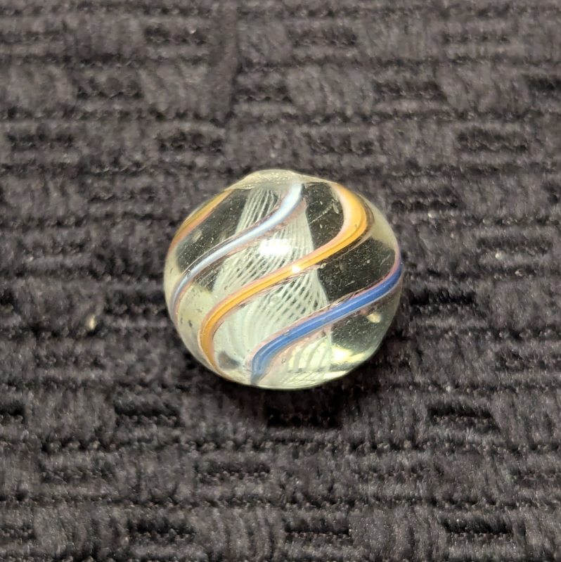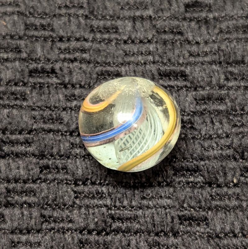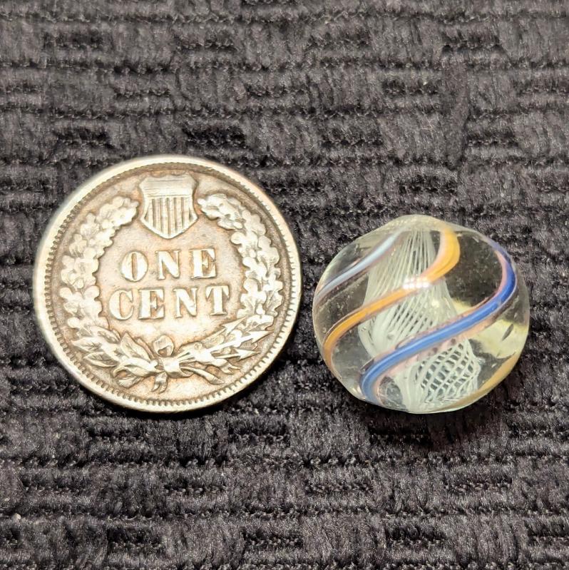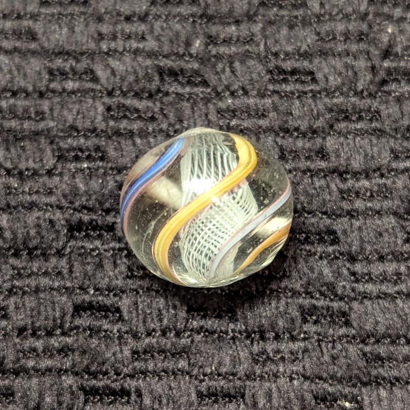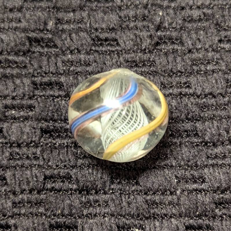 Small Tight White ‘Net-Like” Latticino Core Swirl with outer ribbons of red-yellow-green and red-white-blue stripes, and lot’s of jelly (transparent) bands in the ribbons. Shiny mint original surface. Coin not included.