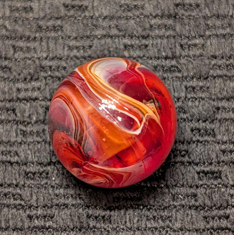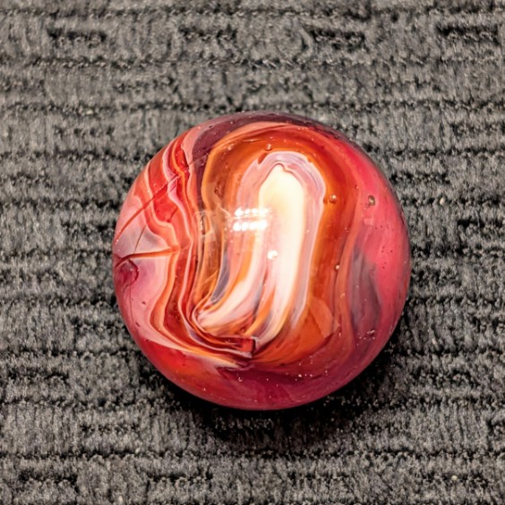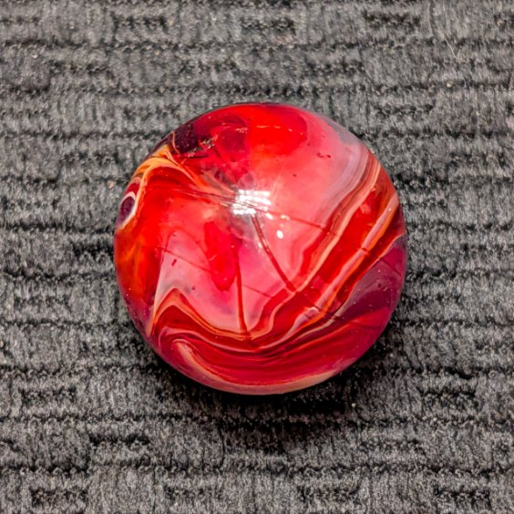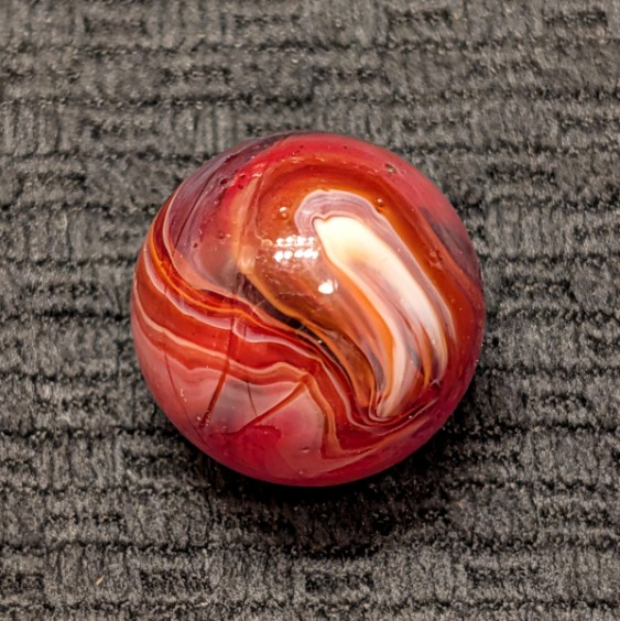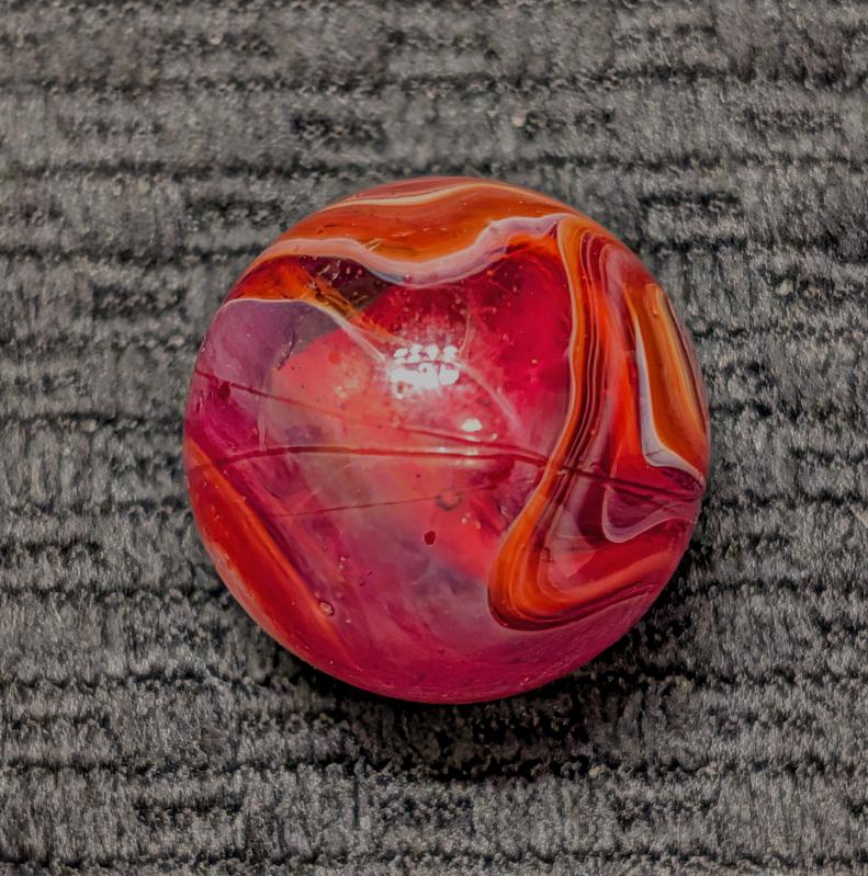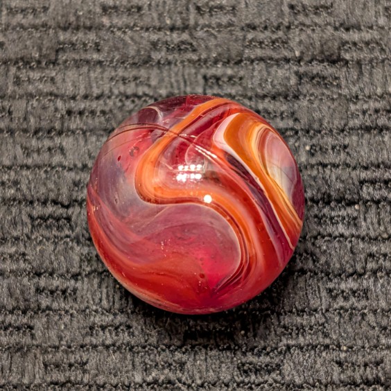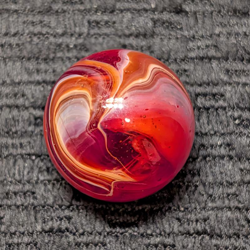 Uncommonly Large 13/16″+ CAC Hand-Gathered Cherry Red Slag with Nice Long Tail & Drizzle. These are early CAC hand-gathered marbles that were made before their automated machines came in that made the single and double seam CAC marbles we see the most, circa 1925-6. Wet Mint.