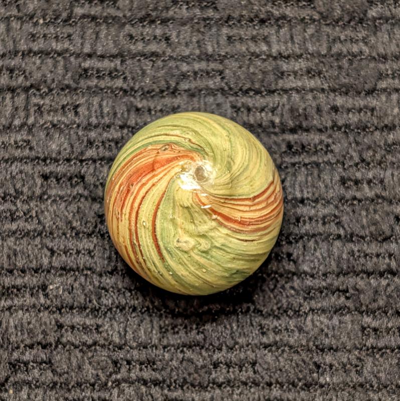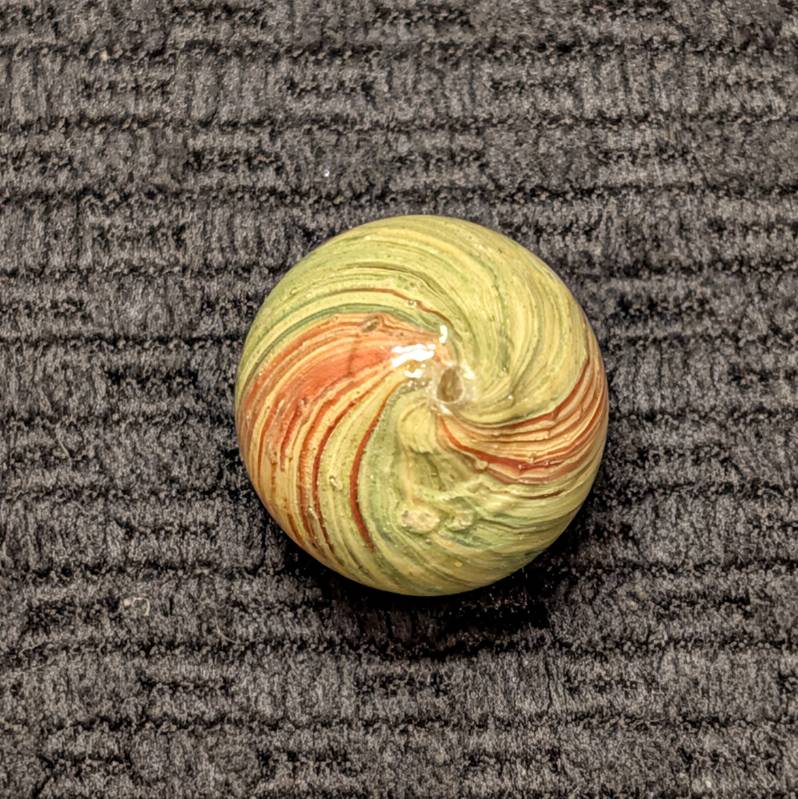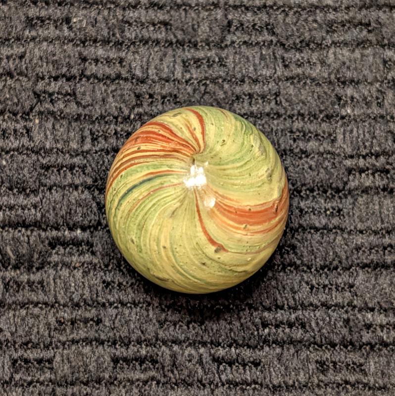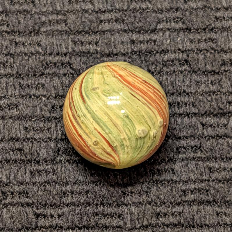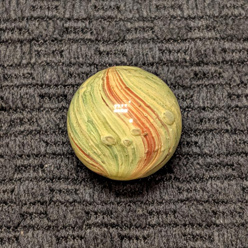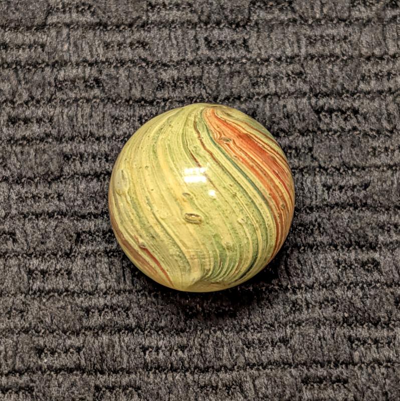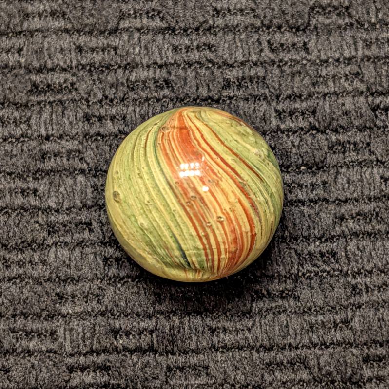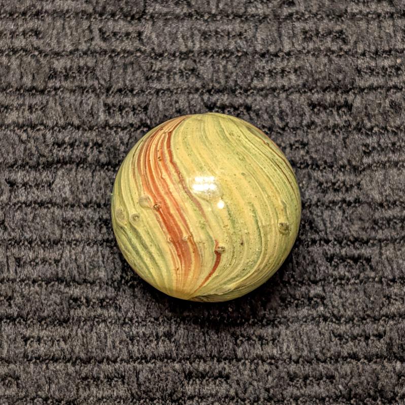 Desirable & Hard-to-Find Strong Left Twist (counter-clockwise) 4-Panel Onionskin with Lime over Yellow and Orange over Yellow Panels that have a Fine Line and Bubbly Look to it. Immaculate Wet Mint Condition with an early (circa pre-1880) delicately faceted pontil. This marble is Amazing!