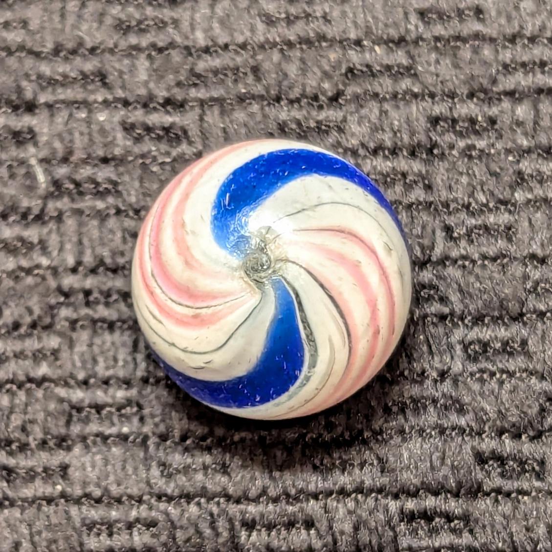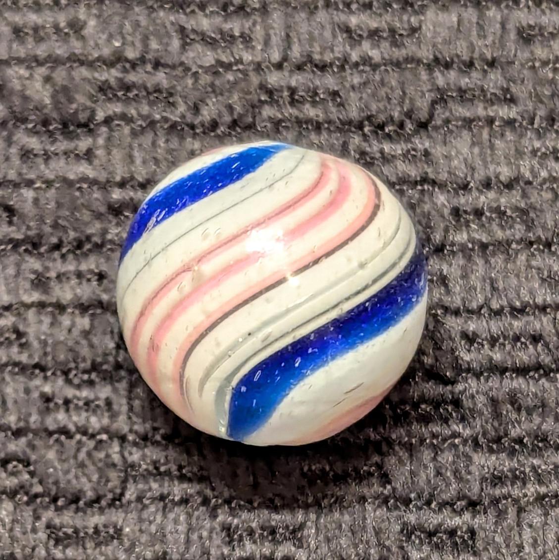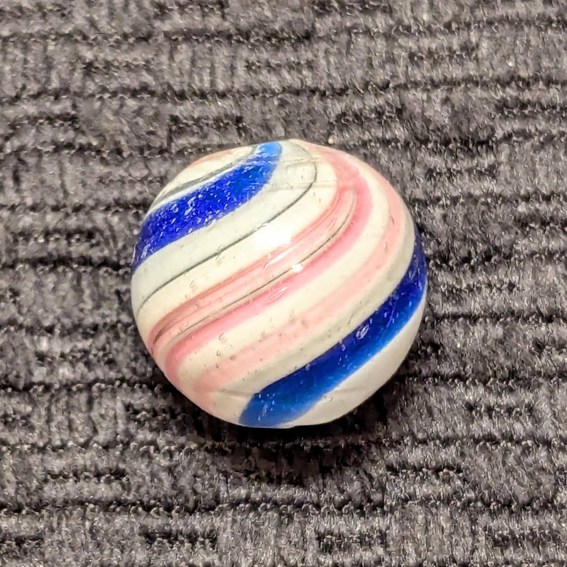 Peppermint Swirl w/ sets of 3 red (pink) lines. Nice balance of line symmetry, spin, and visual appeal. Mint original surface condition.