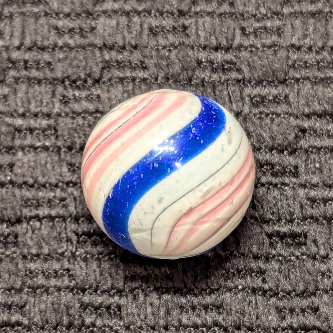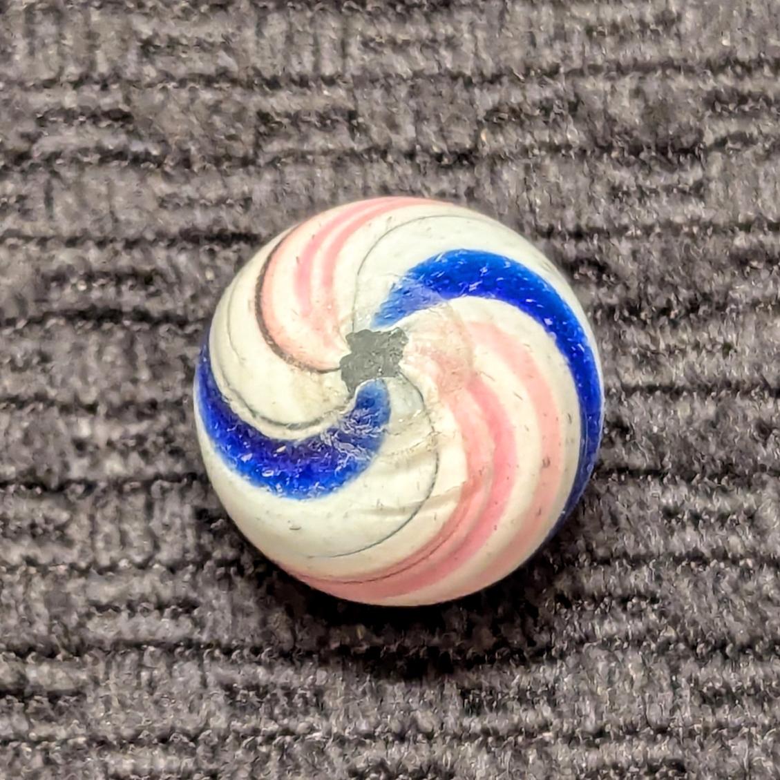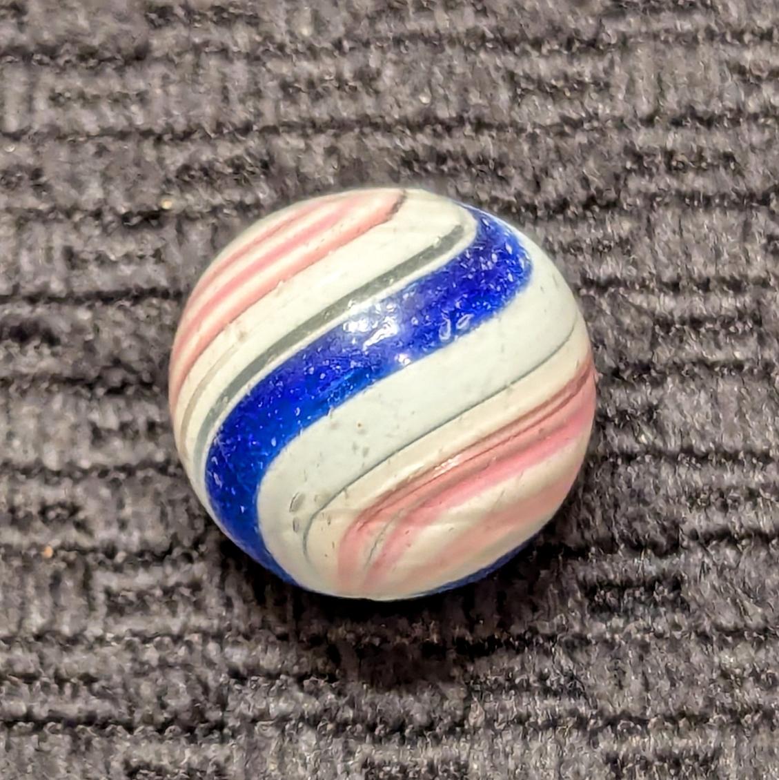 Peppermint Swirl w/ sets of 3 red (pink) lines. Nice balance of line symmetry, spin, and visual appeal. Mint original surface condition.