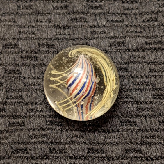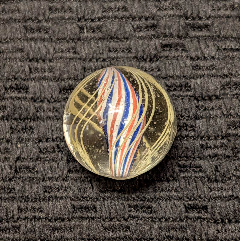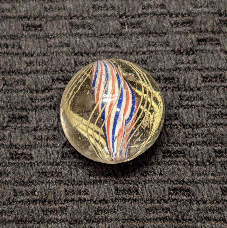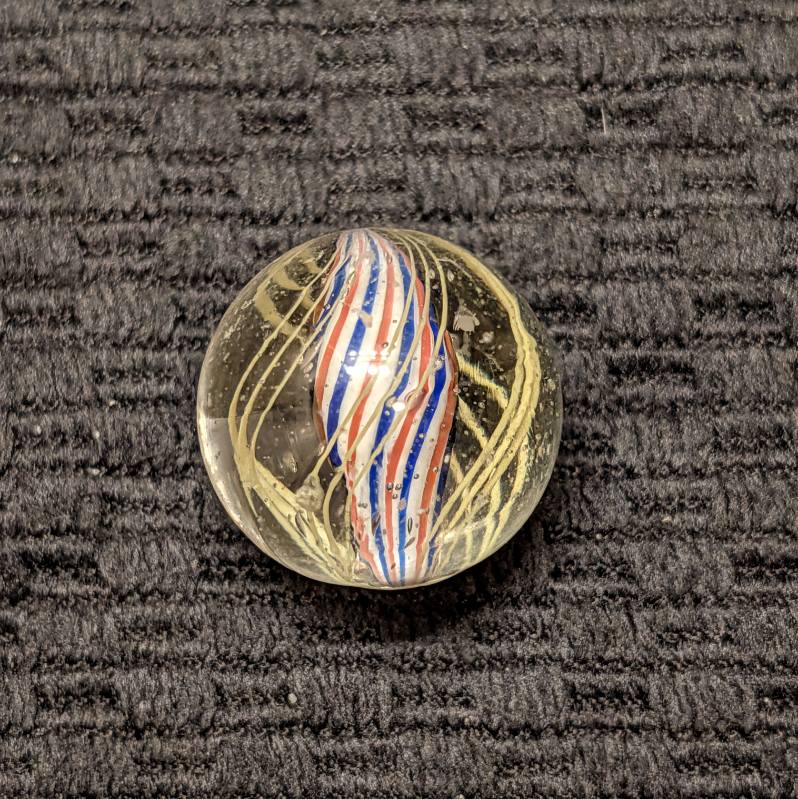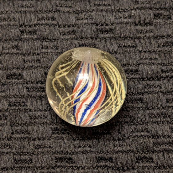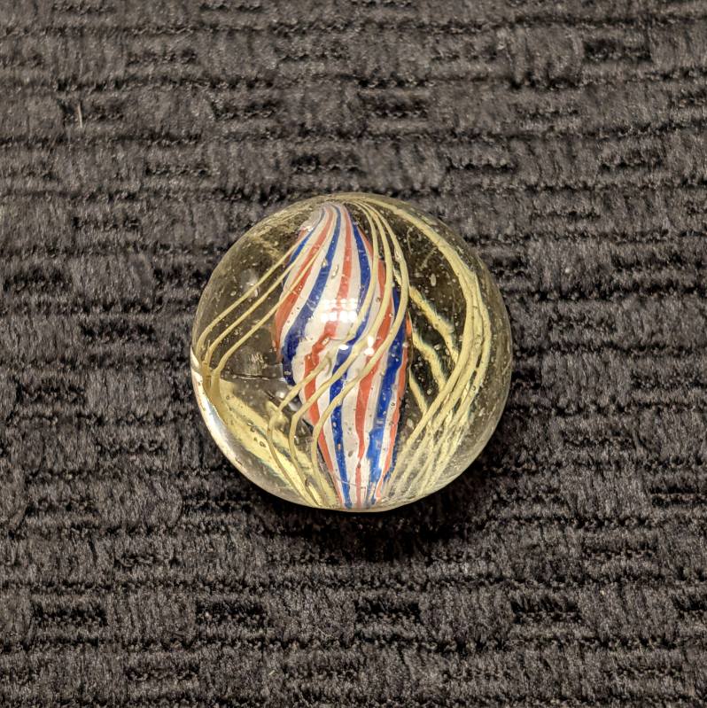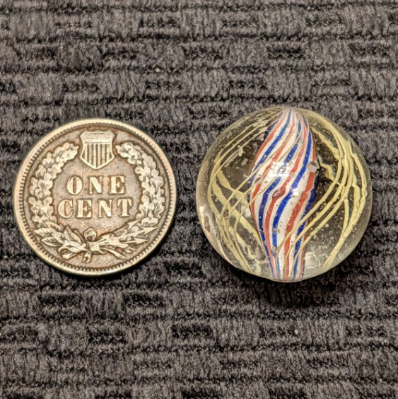 Shooter Size 25/32″ Fine Line Red-White-Blue Striped Solid Core Swirl. 4 Sets of triple yellow outer threads. Wet Mint. Coin not included.