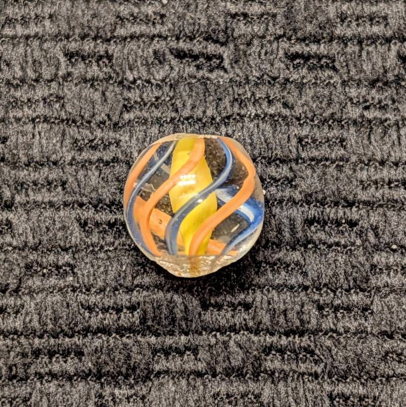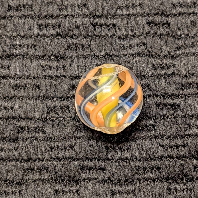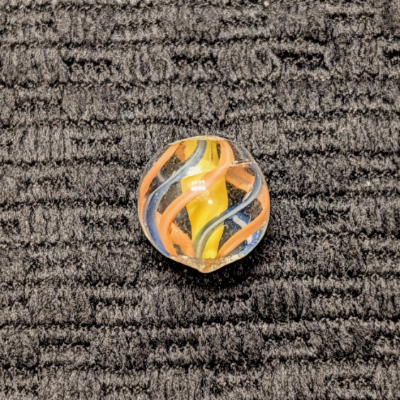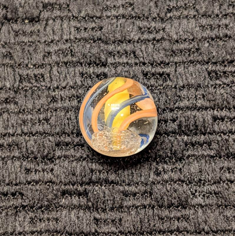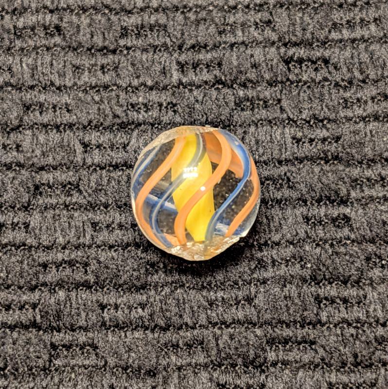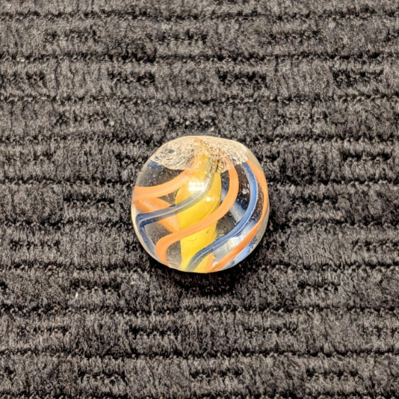Micro Peewee 15/32″- English Style Yellow Solid Core Swirl with 3 Blue & 3 Orange Outer Ribbons. Wet Mint. Coin not included, it’s just to show the tiny size of this beautiful gem.