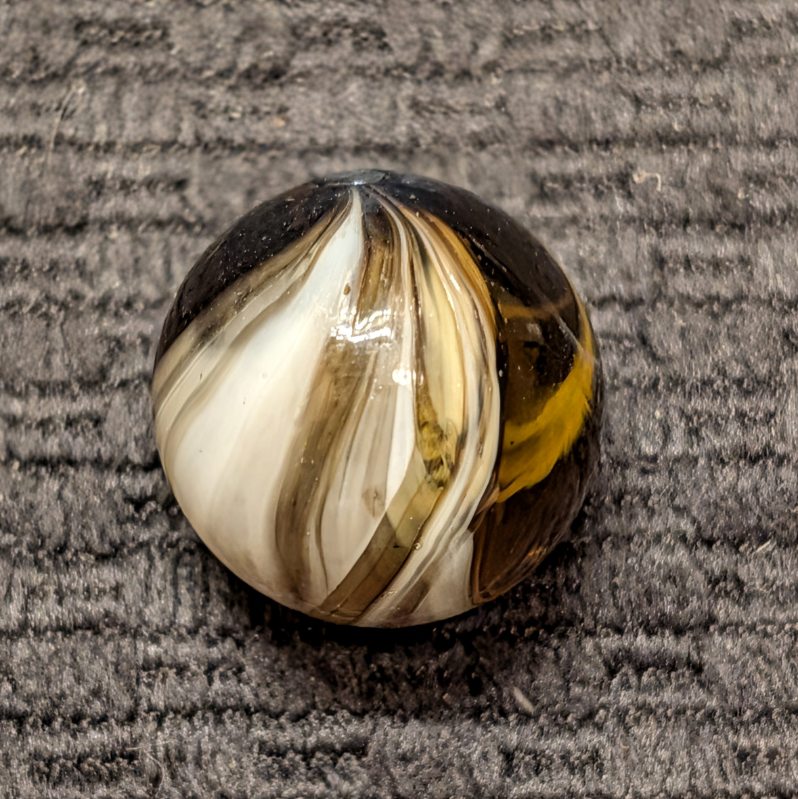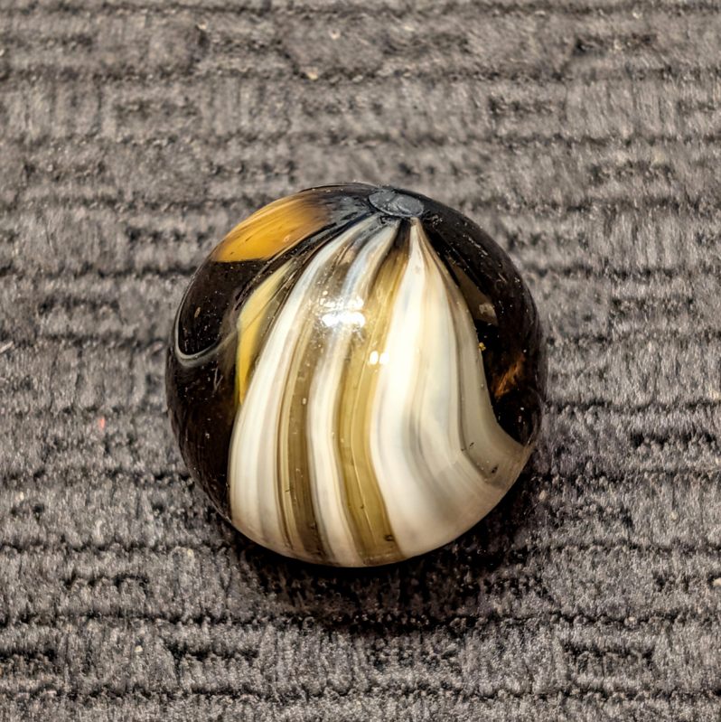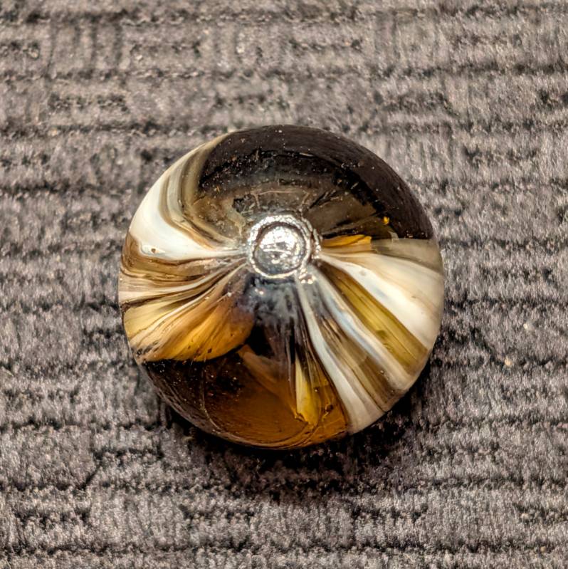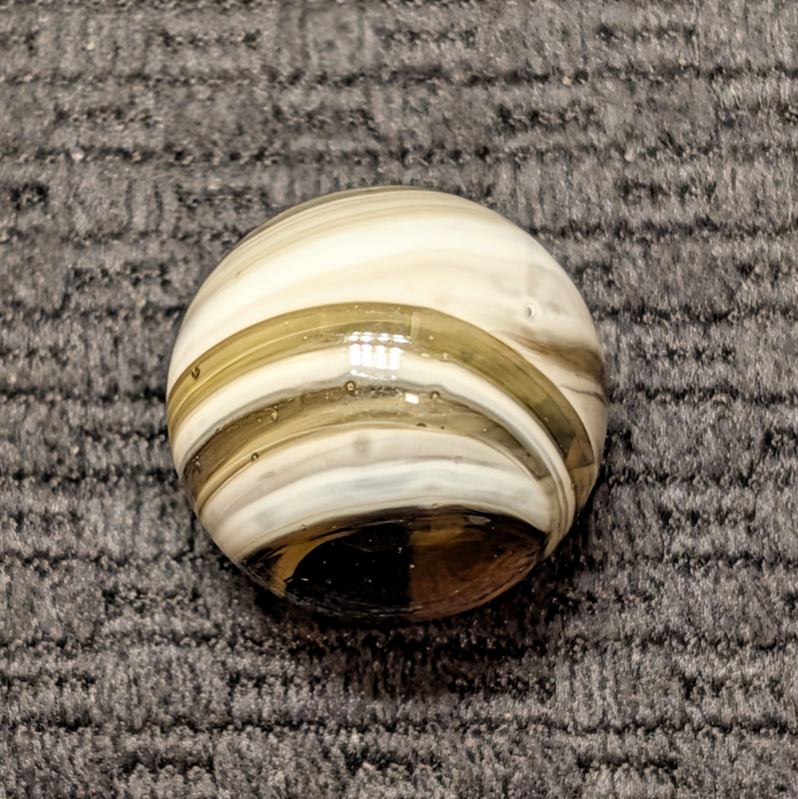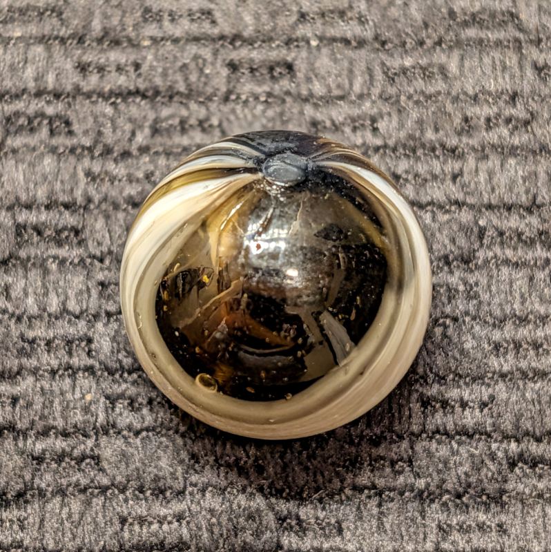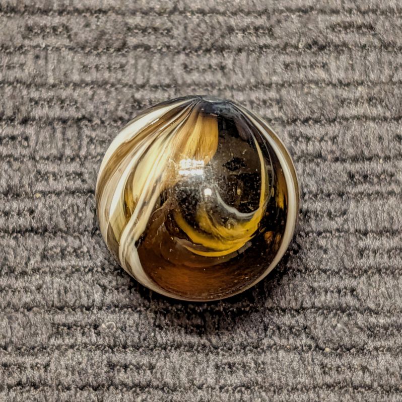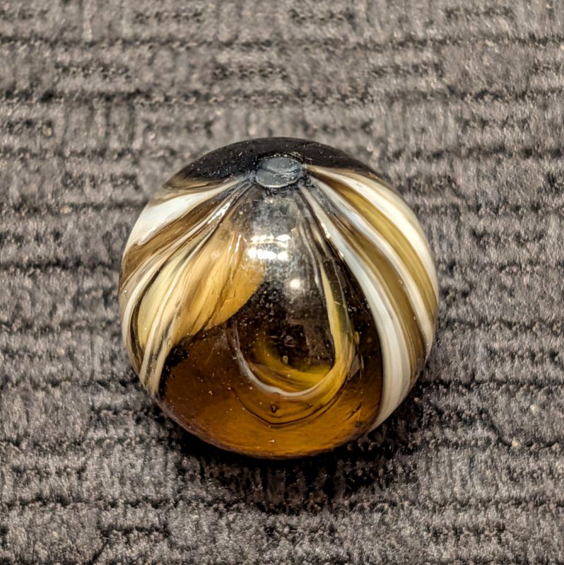 Spectacular 3/4″ Looped White Navarre in Clear Root Beer Glass! The eye appeal of this gem is off the charts! From my wife’s personal collection! Definitely one of the nicest examples you’ll see, I’m surprised she let loose of this beauty. Wet Mint original surface.