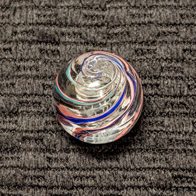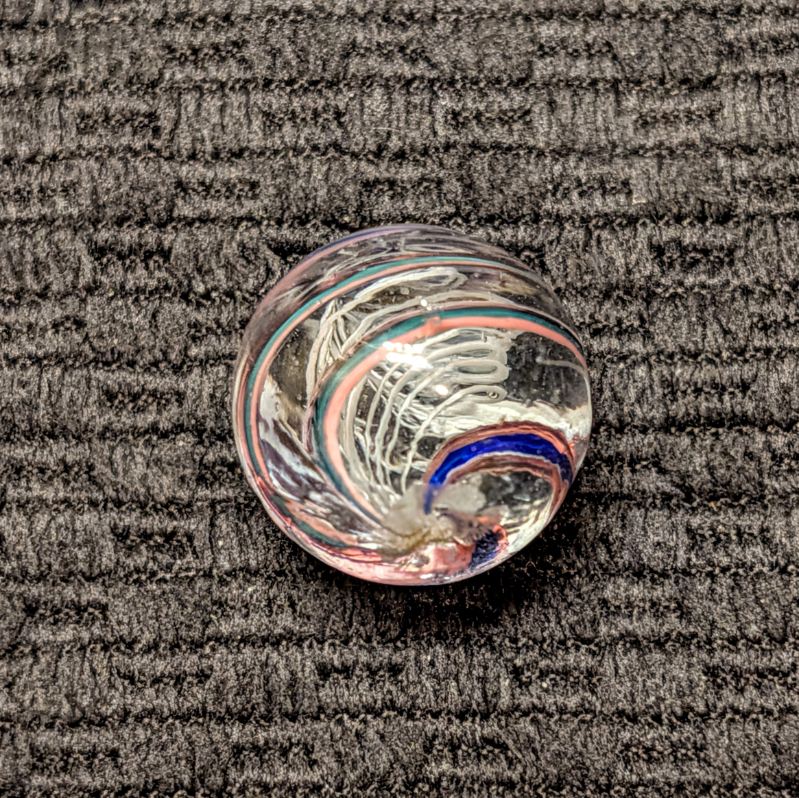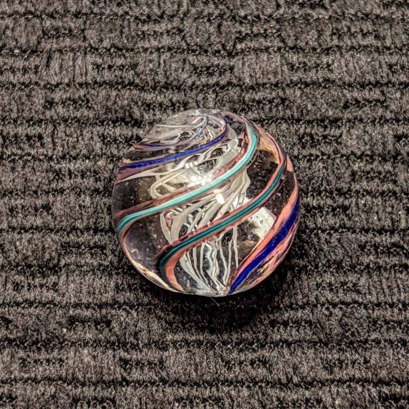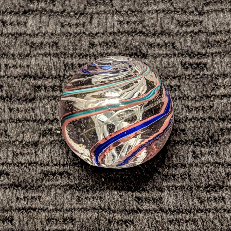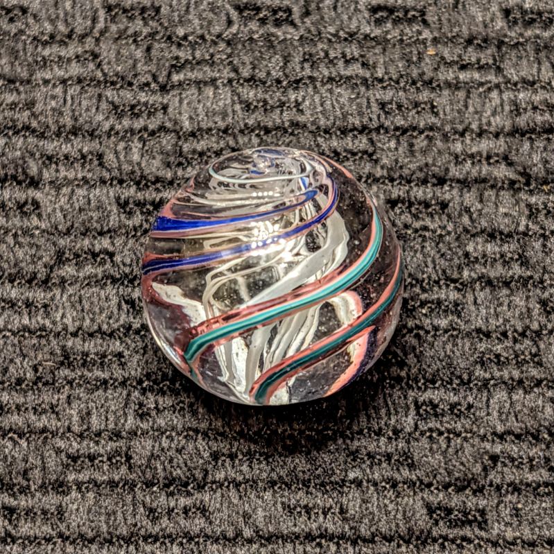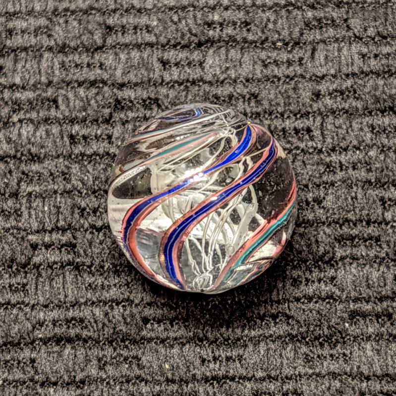 Tornado Twist White Latticino Swirl with a pair of Red-Aqua-White Ribbons and a pair of Red-Cobalt Blue-White outer ribbons (not alternated like usual). Wet Mint.