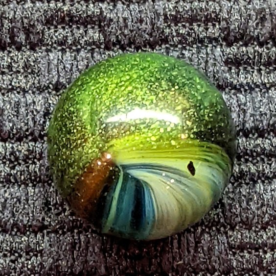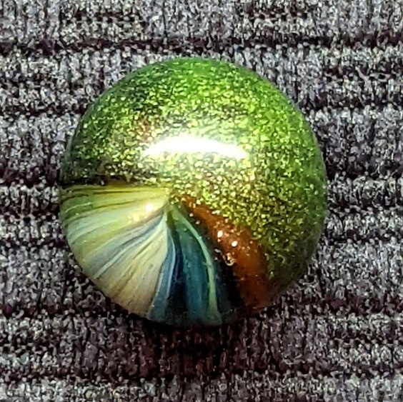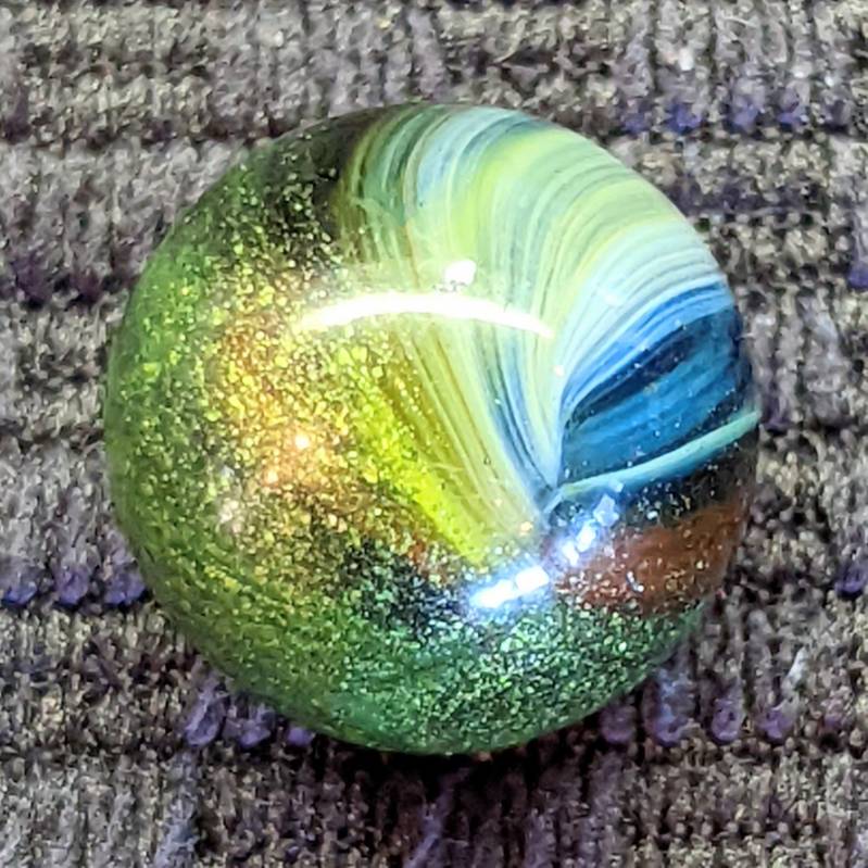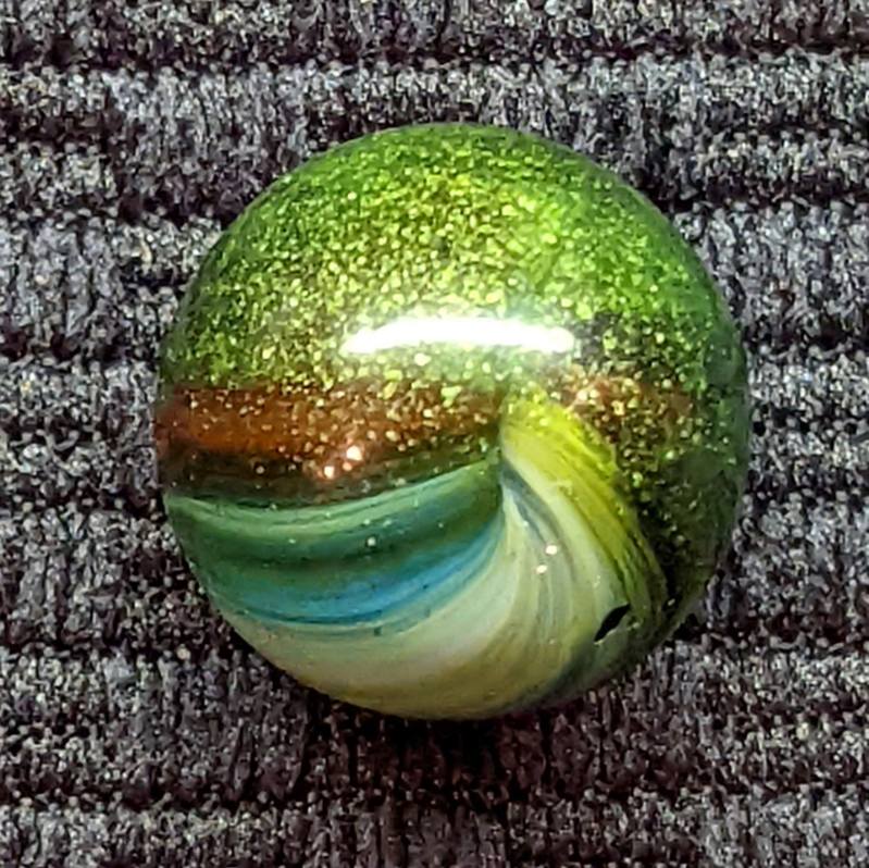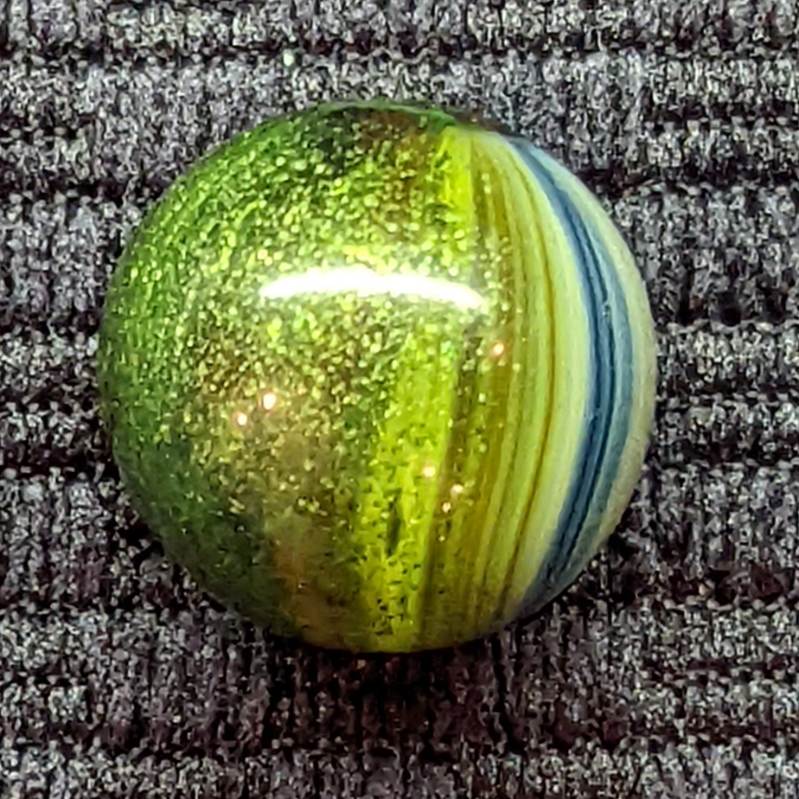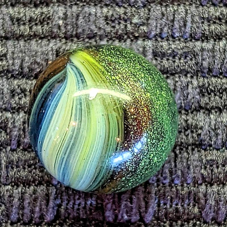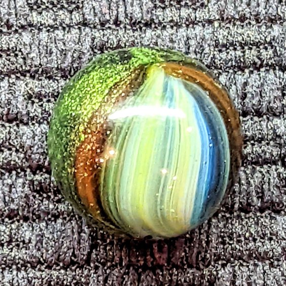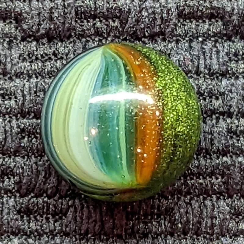 Extremely Rare AKRO Sparkler w/ Oxblood & 60-70% Heavy AV Blizzard Coverage. This is one of the rarest AKRO marbles. There’s a dark subsurface inclusion that I believe is a huge piece of AV. Multicolor with blue, white, yellow and oxblood. A lesser NM version with a crack sold Feb 2025 for $1,250, and the seller told me there were 3 interested parties for it at that price. This one is perfectly MINT!