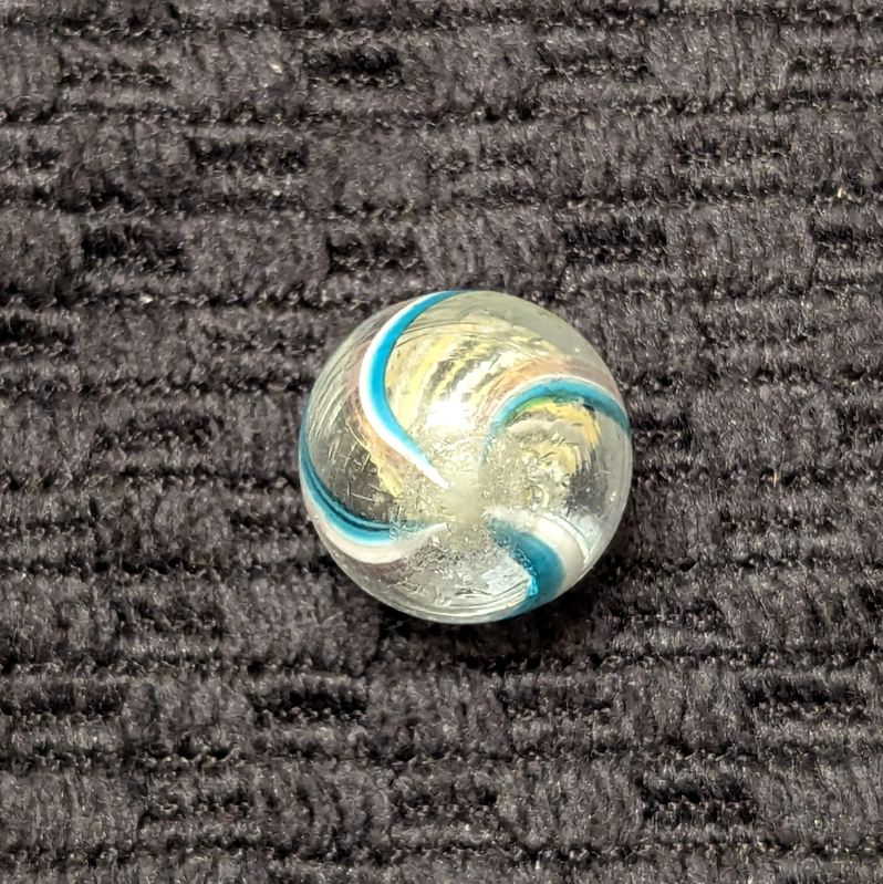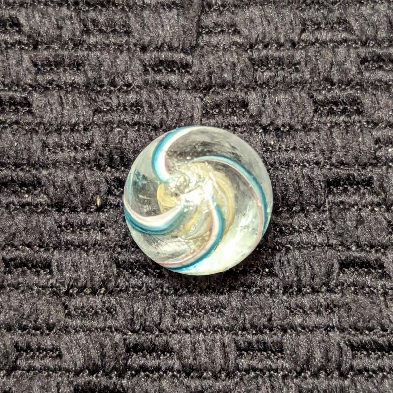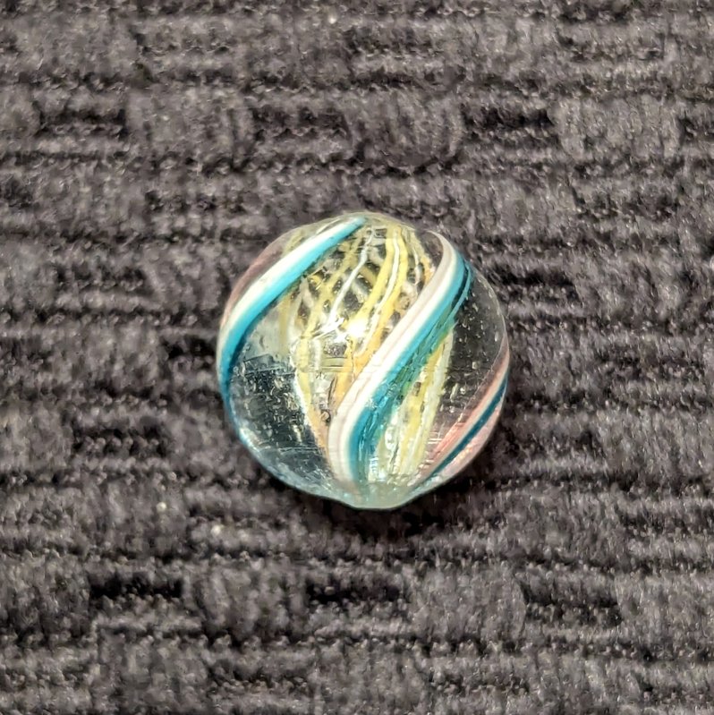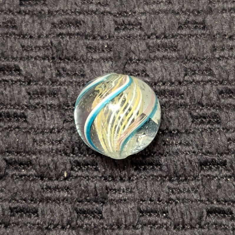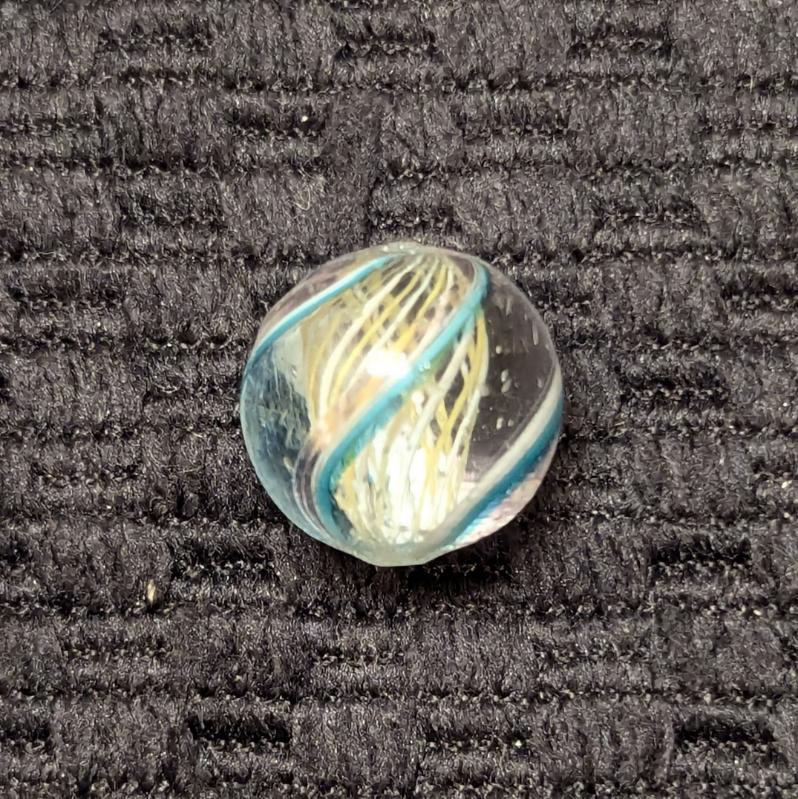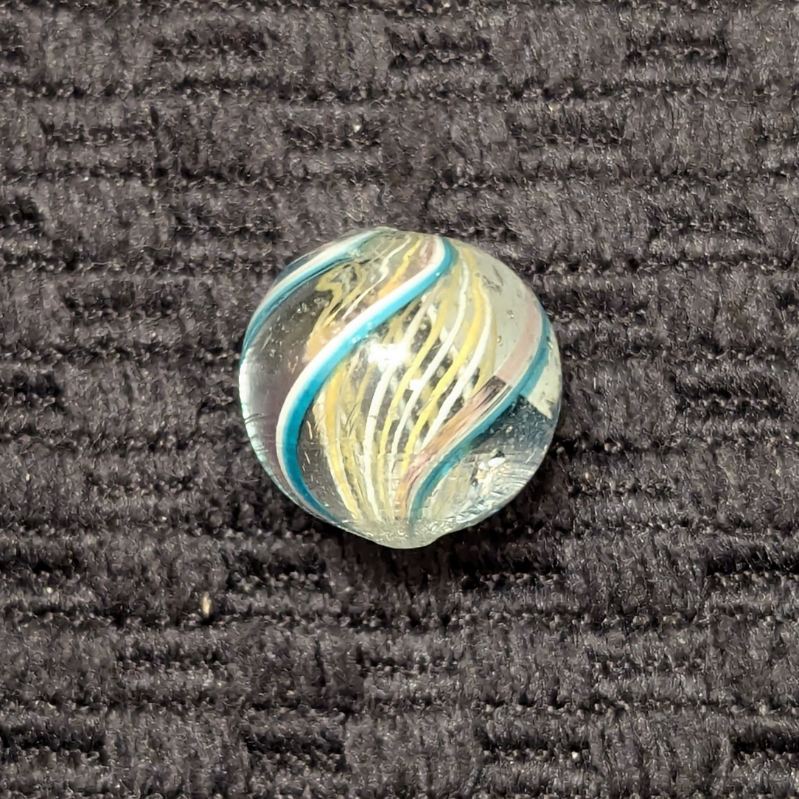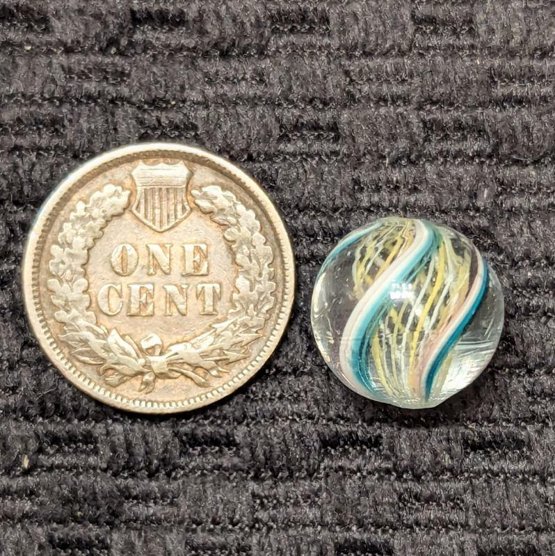Uncommon 1/2″ Peewee Yellow & White Latticino Swirl with alternating colors. There’s 4 identical outer ribbons of green, white and faint transparent pink along one edge. Wet mint original surface. Coin is not included – for size comparison purposes only.