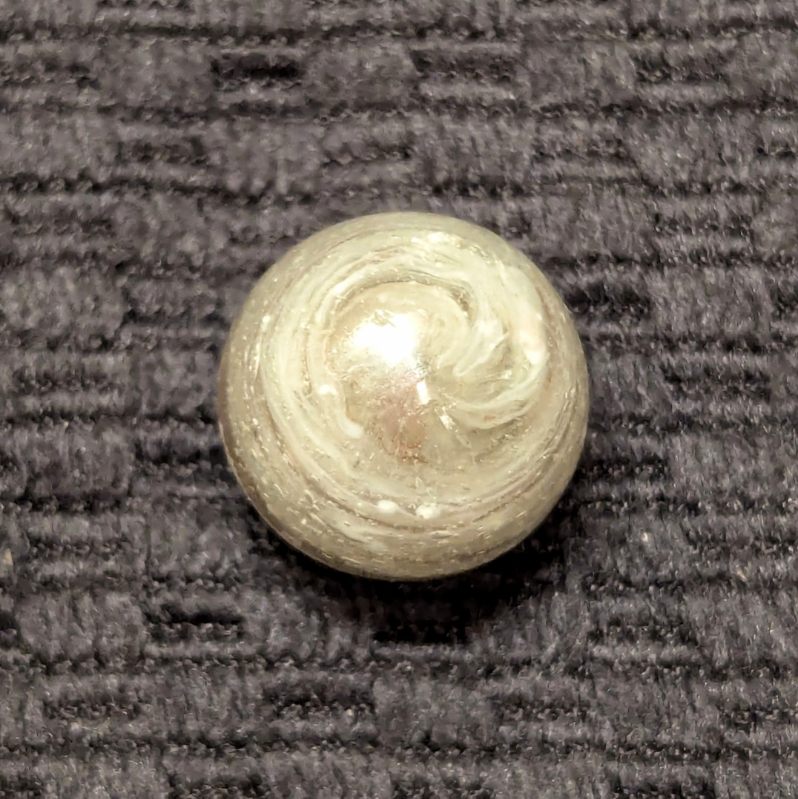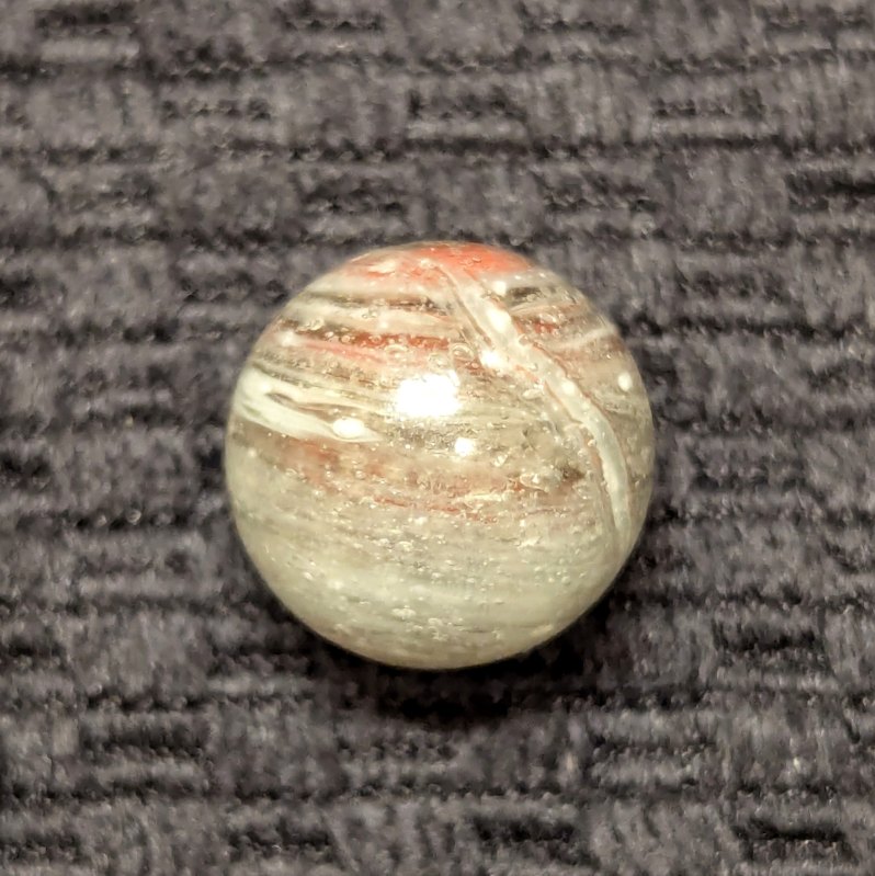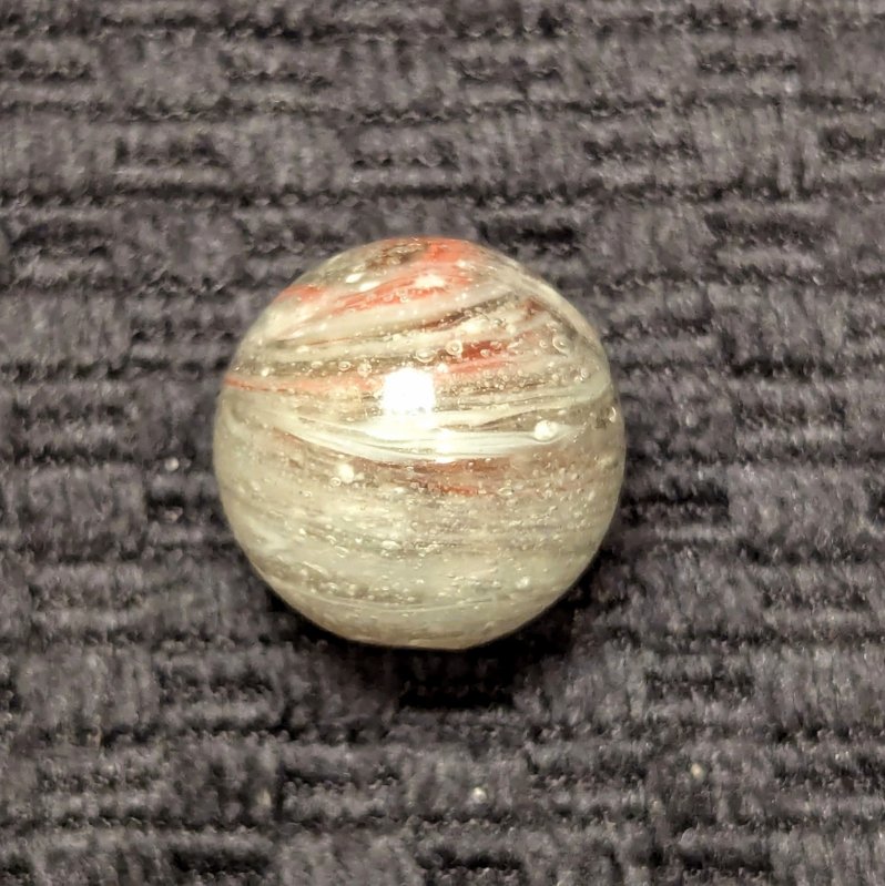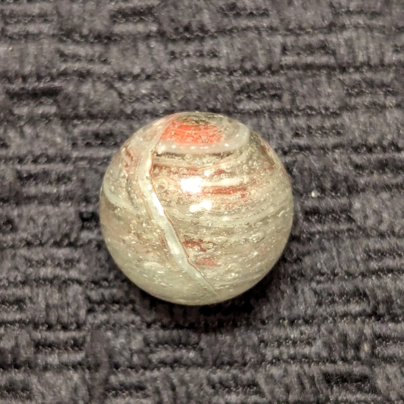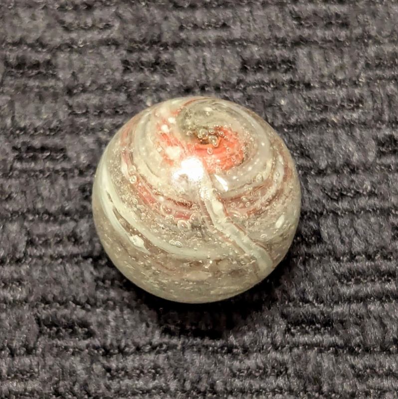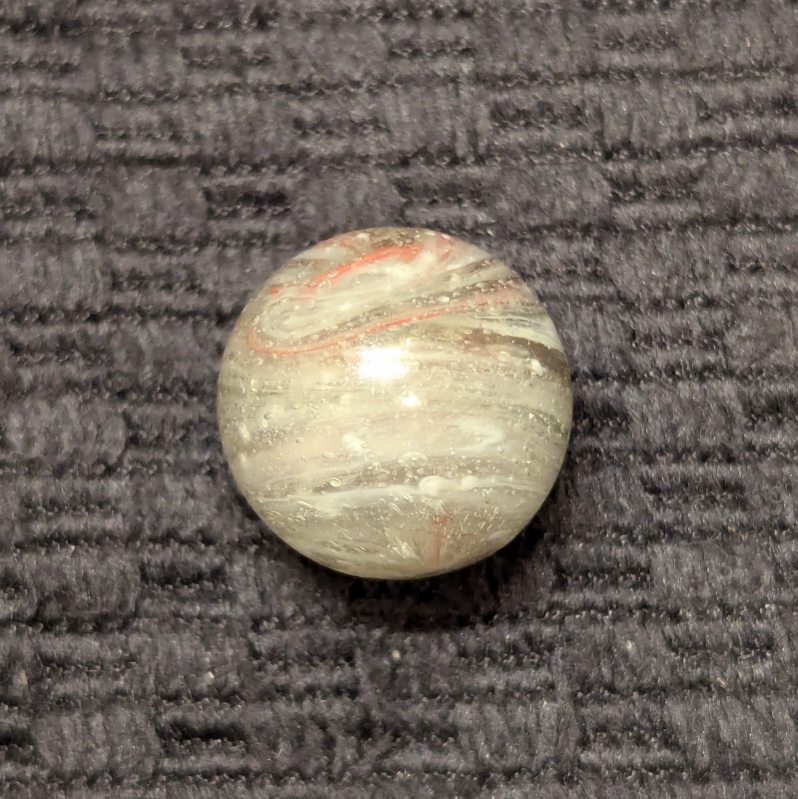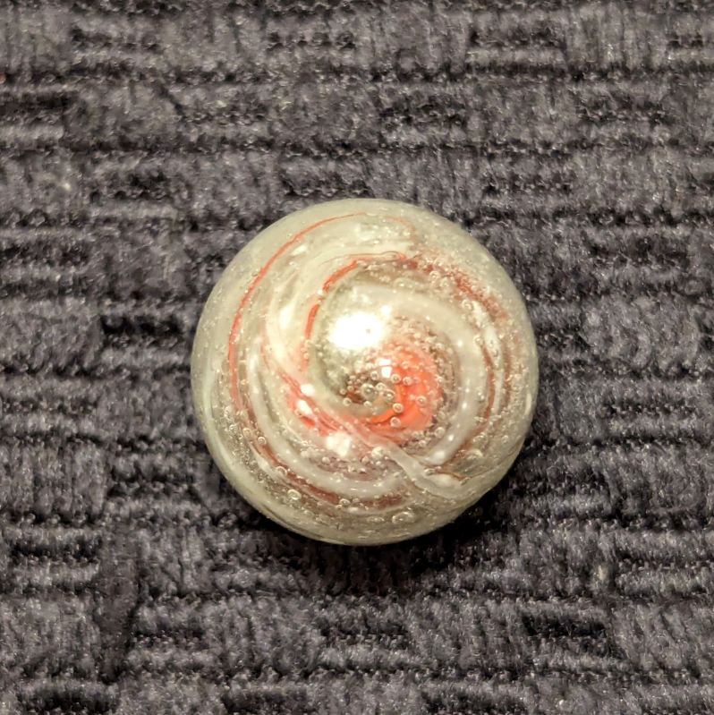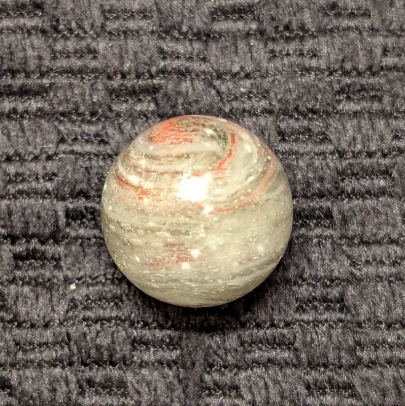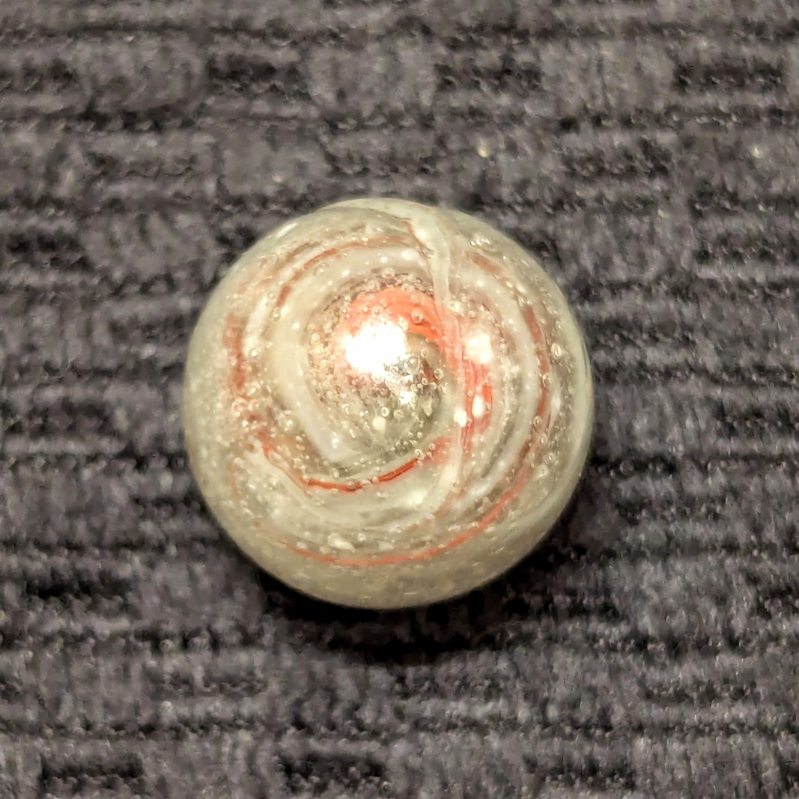 Uncommon size 5/8″ Greiner with spiraling Oxblood in a heavily whipped matrix glass of bubbled clear, white and light eggyolk. A nice long tail extends from the pontil to across the “9” of oxblood at the top. Single faceted pontil. This type is the earliest of German glass handmade marbles, circa 1840-60. Wet Mint original surface.