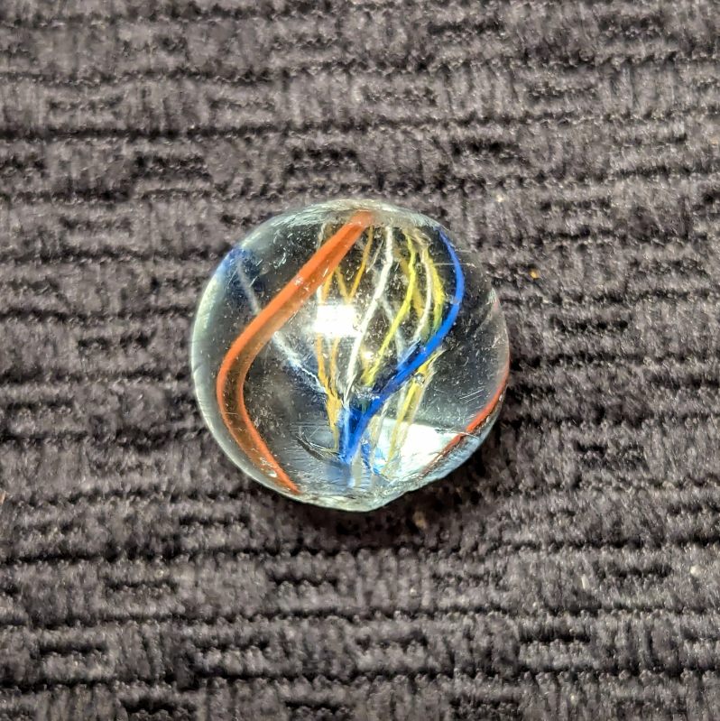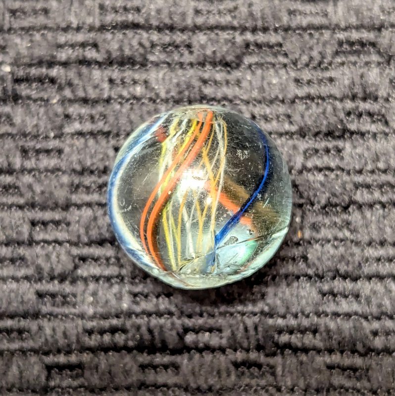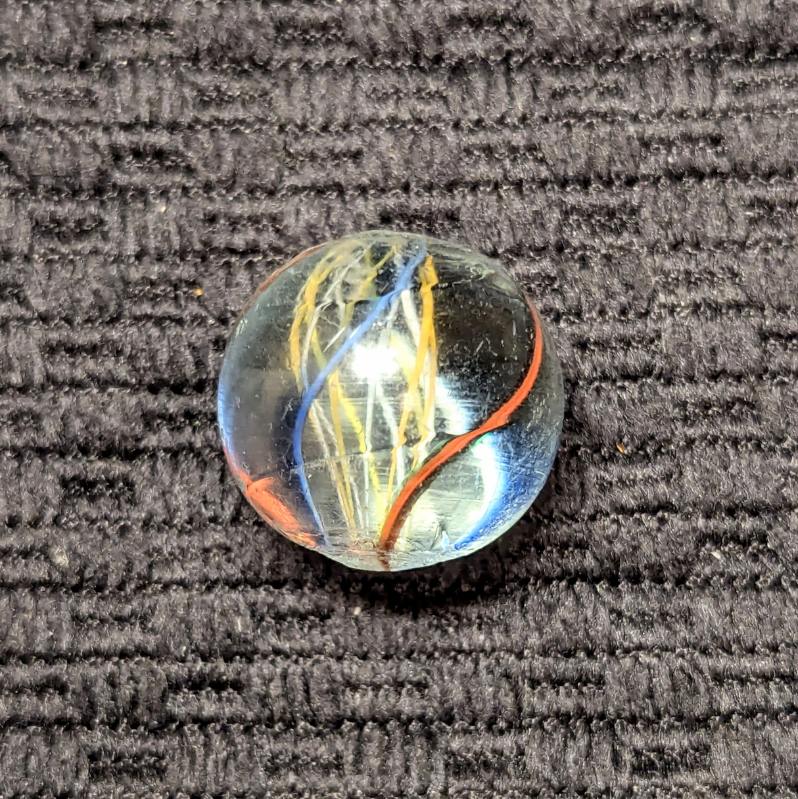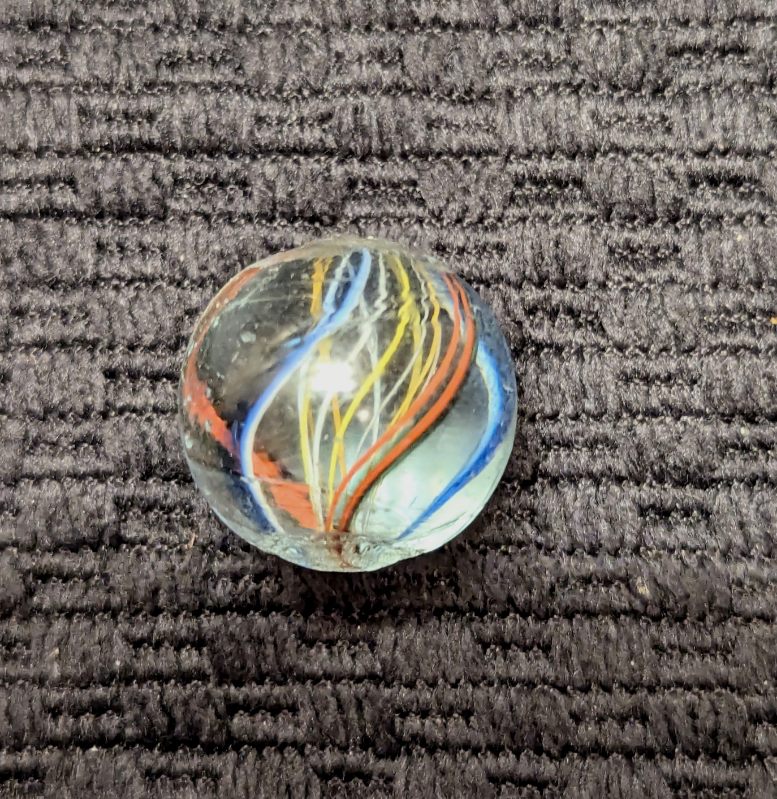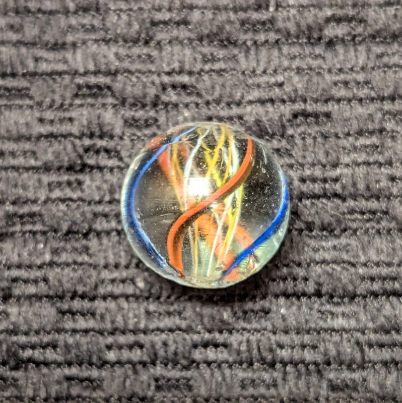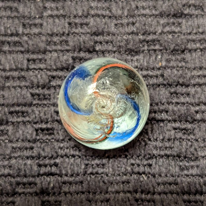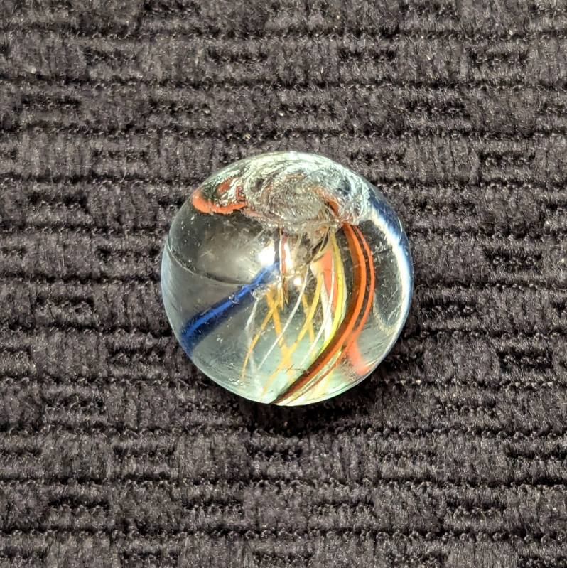 Uncommon Orange & White Latticino Core Swirl of Alternating Colors. There are 2 red trimmed in blue ribbons and 2 blue backed with a white stripe outer ribbons. Very few of these were produced. It’s definitely an orange latt in hand but photographed a little more yellowish than it is. Mint.