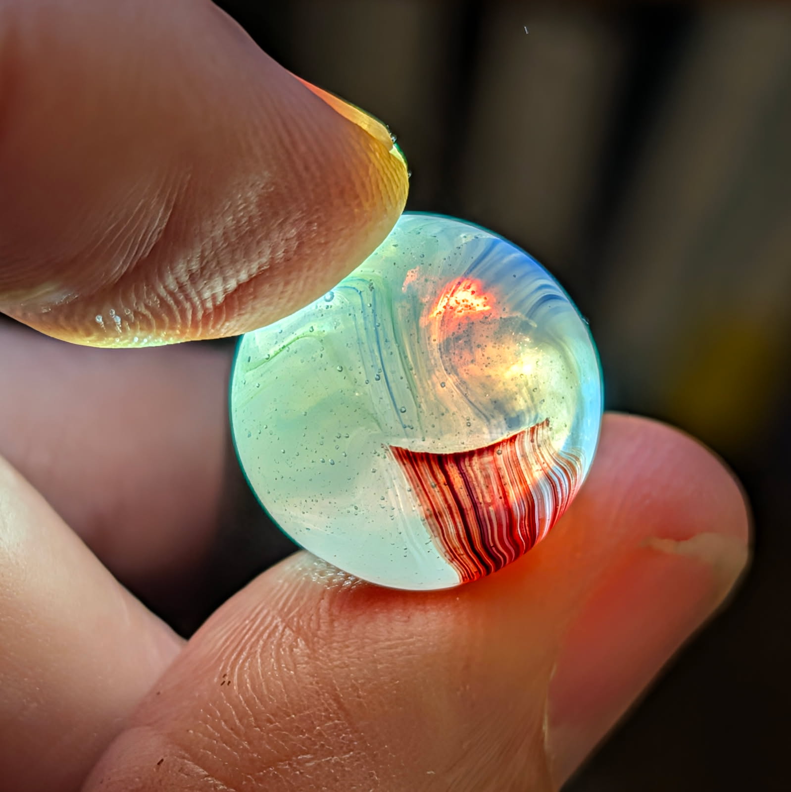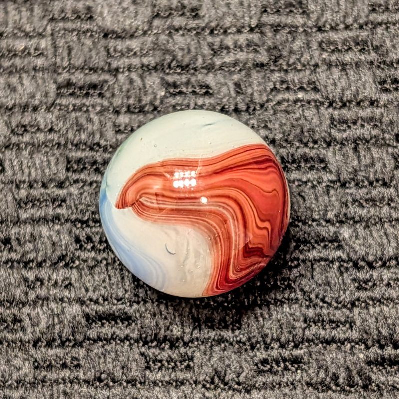 AKRO Oxblood Swirl with Strong Oxblood Coverage over a Translucent Base w/ Opalescent Qualities. Wet Mint.