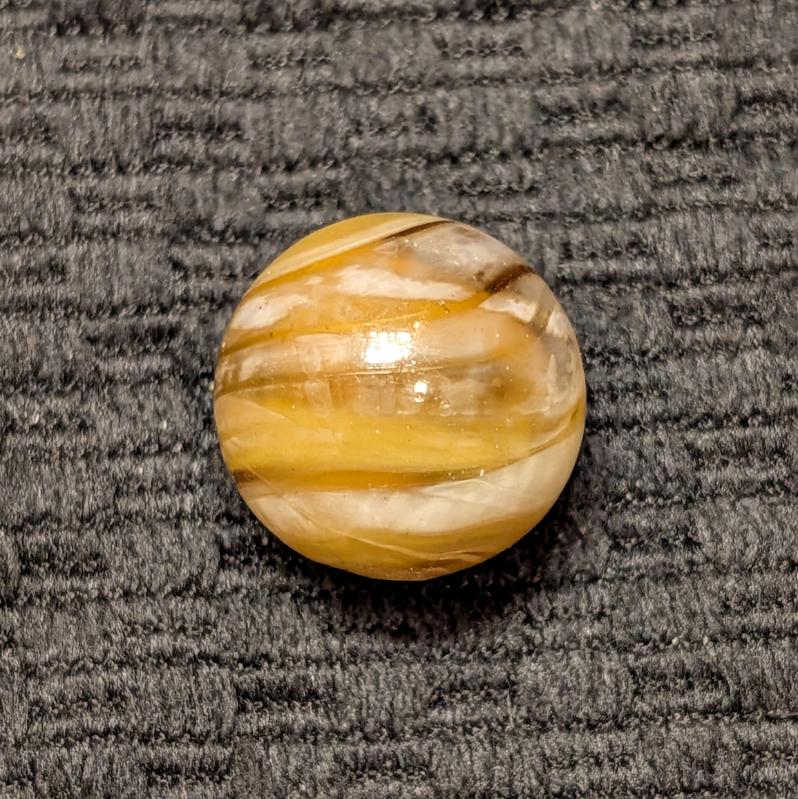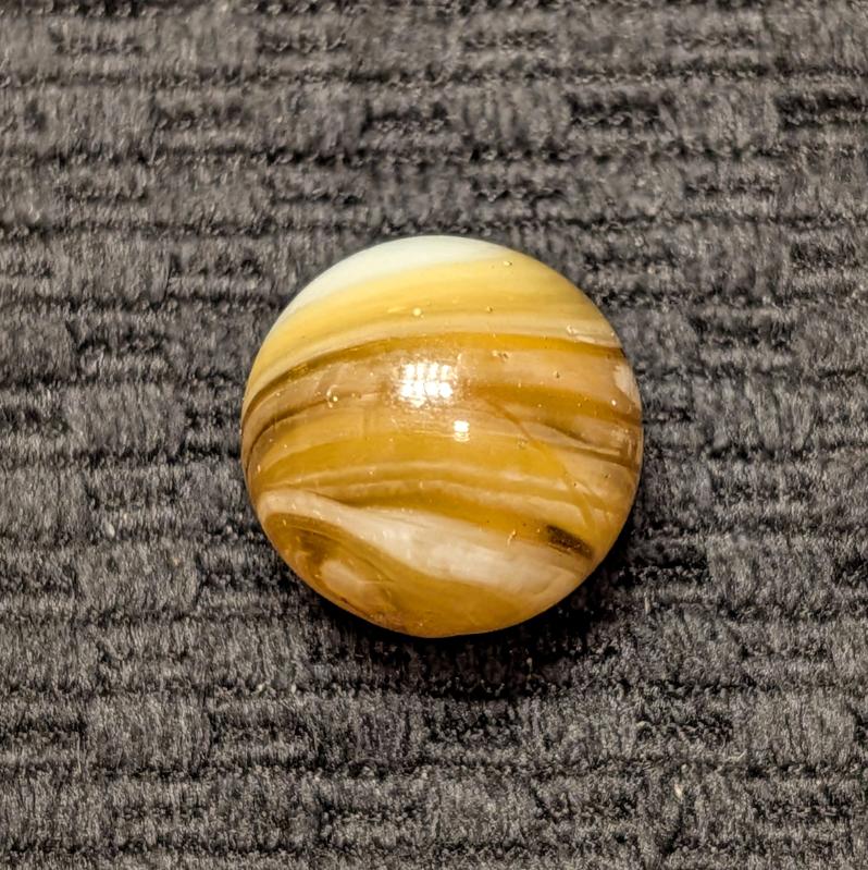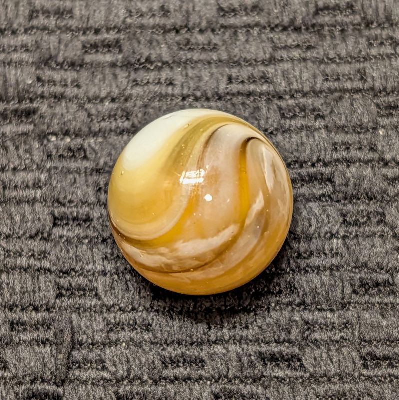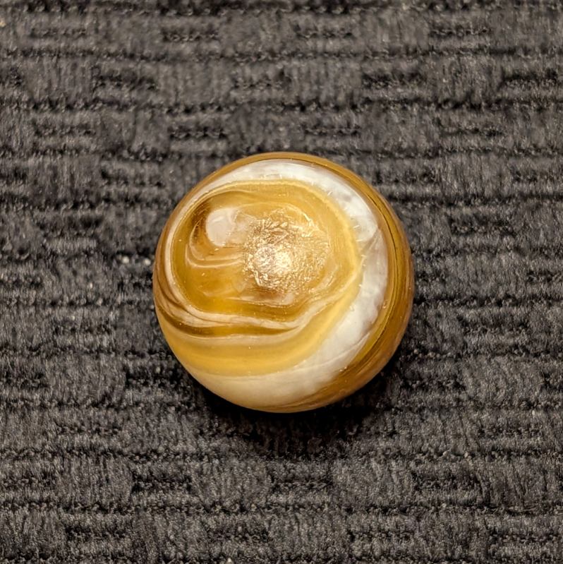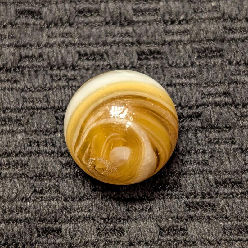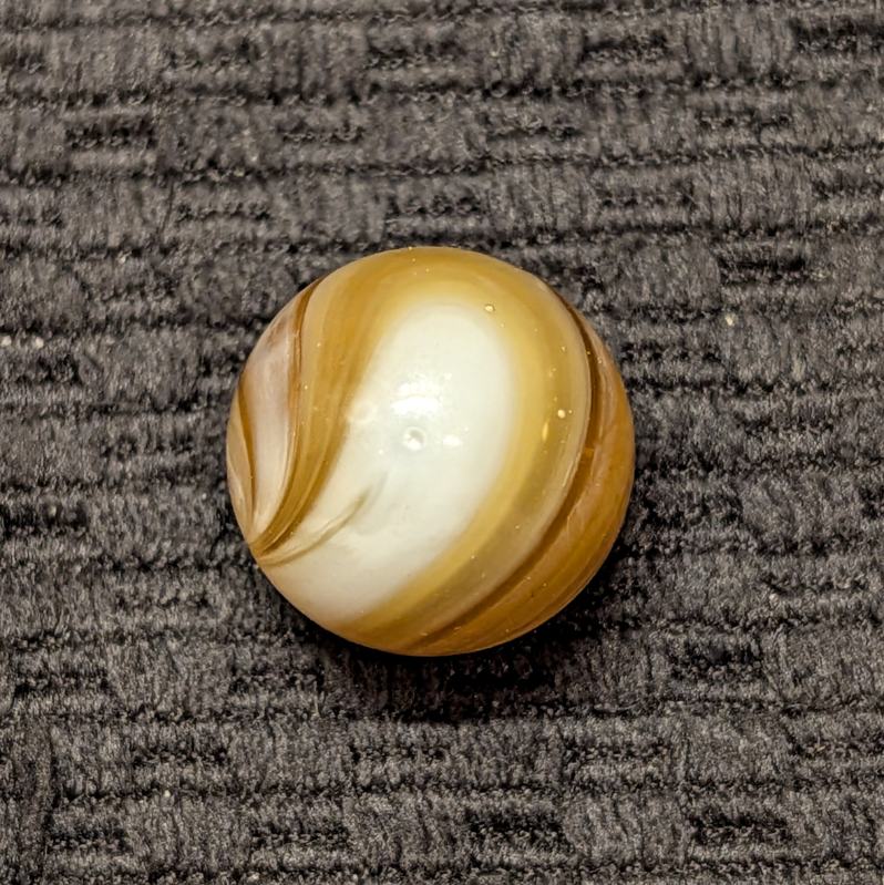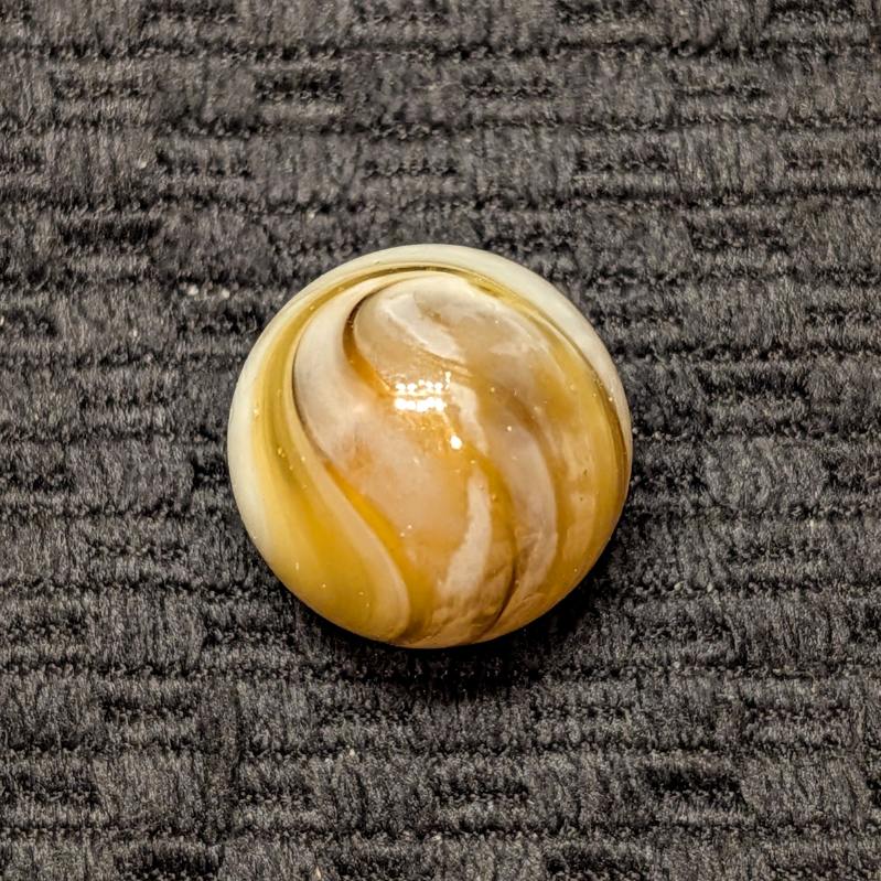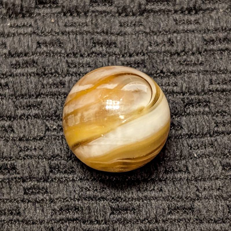 Unusual Caramel & White Hand-Gathered Navarre Swirl w/ the classic patented circular melted pontil, specific of all Navarre Swirls. Lighter than most and easily mistaken as a MFC or AKRO Slag, but it’s rarer than either of those and from a much earlier production period of James H Leighton’s Navarre Glass Marble & Specialty Company, circa 1897-1901. Mint.