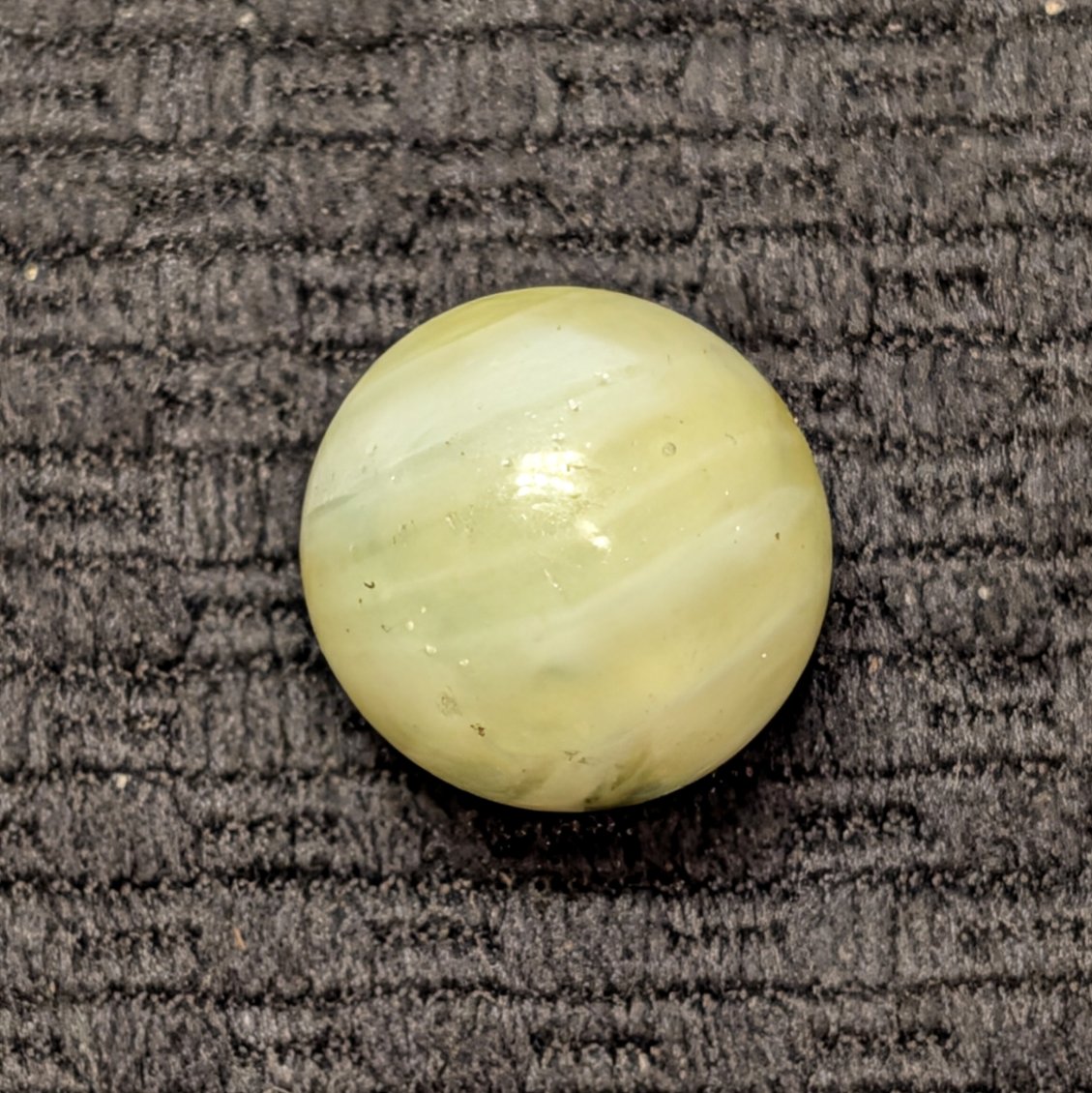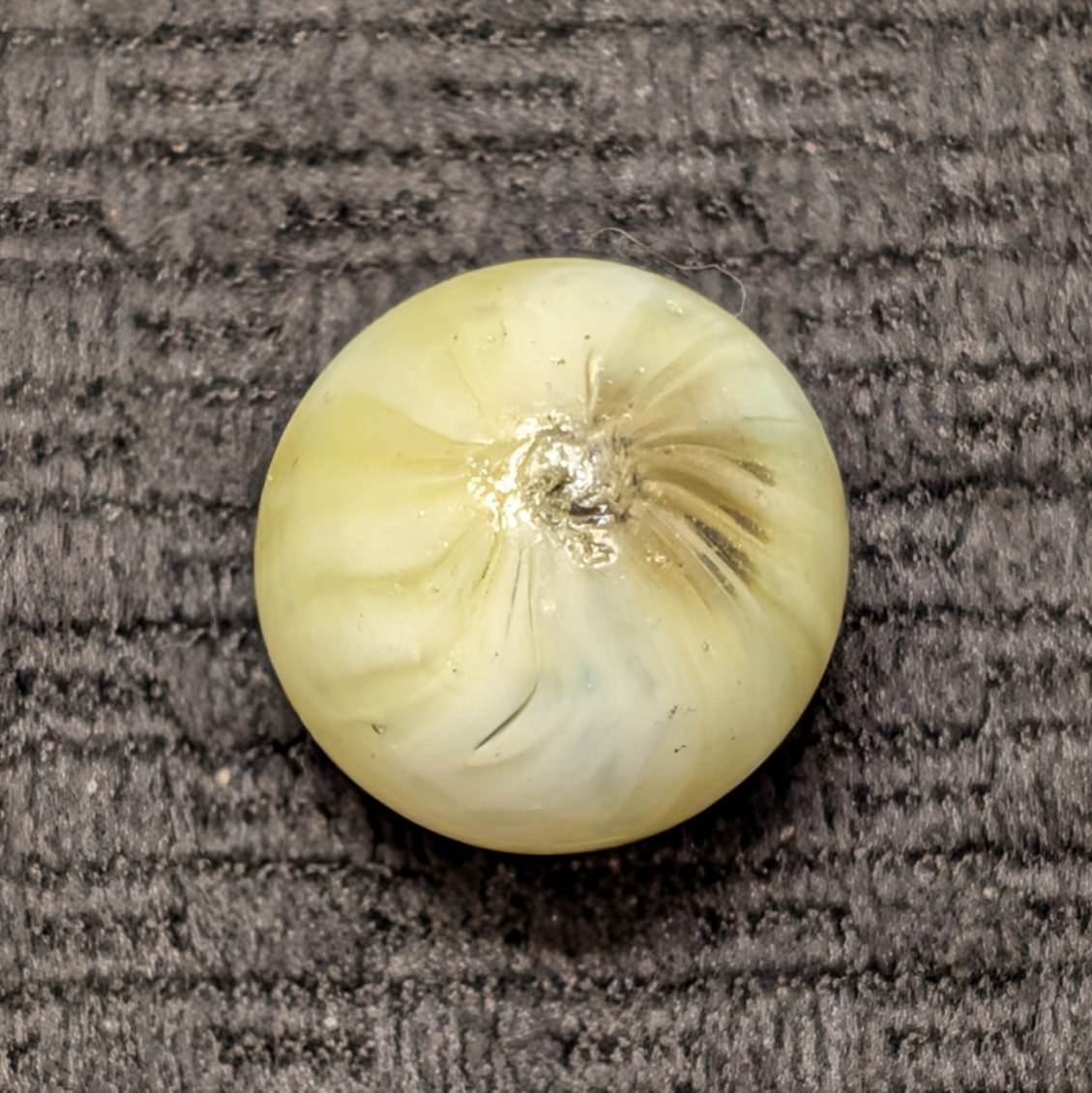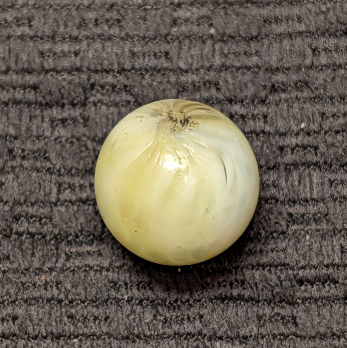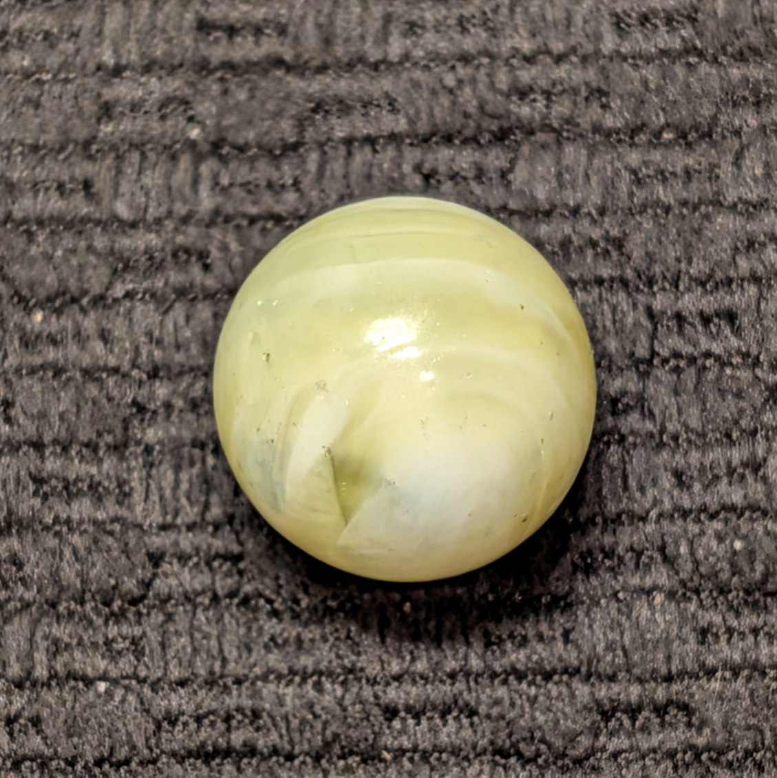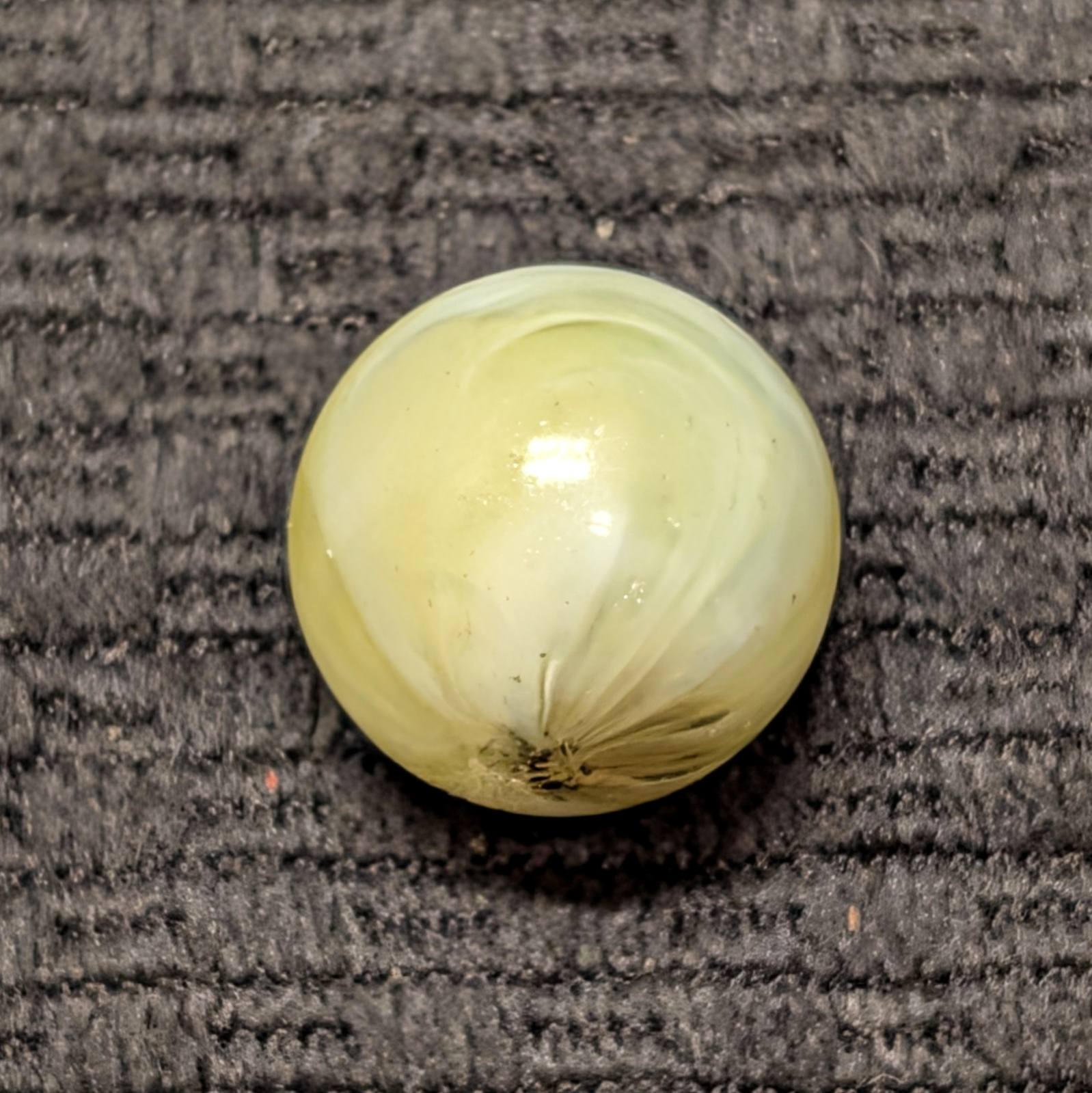 Unique Looped Hand-Gathered Yellow Navarre (less common color) with the classic patented circular melted single pontil. From James Leighton’s Navarre Glass Marble Company in Navarre Ohio, circa 1890’s (America’s first marble company). Wet Mint.