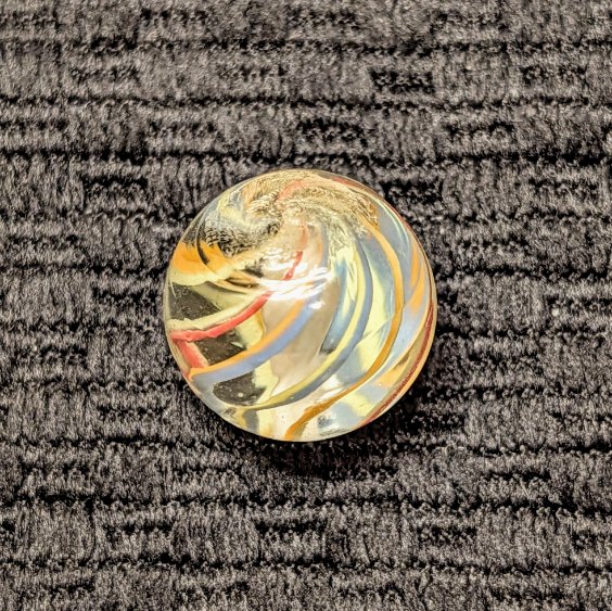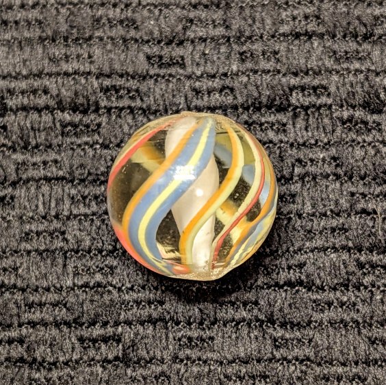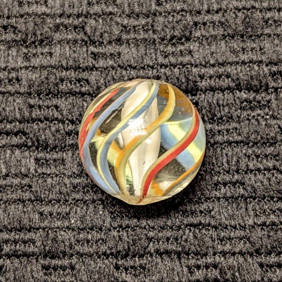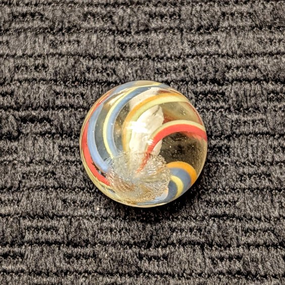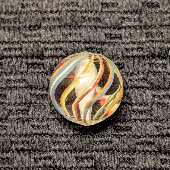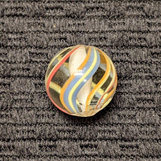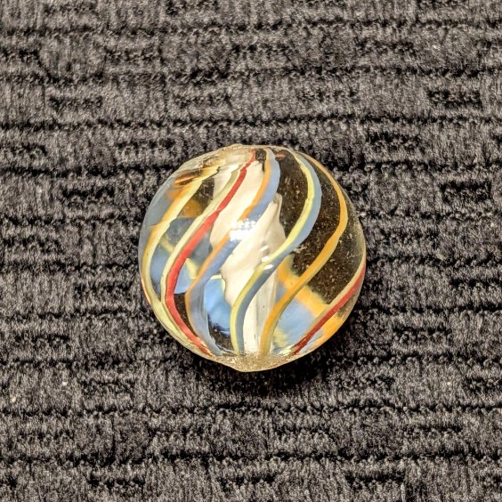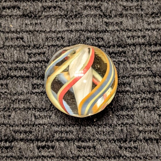 Unusual White English Style Solid Core Swirl w/ Repeating Bi-Color Ribbons of Red/Lime, Lime/Orange, Blue/Yellow, Blue/Orange. Wet Mint.