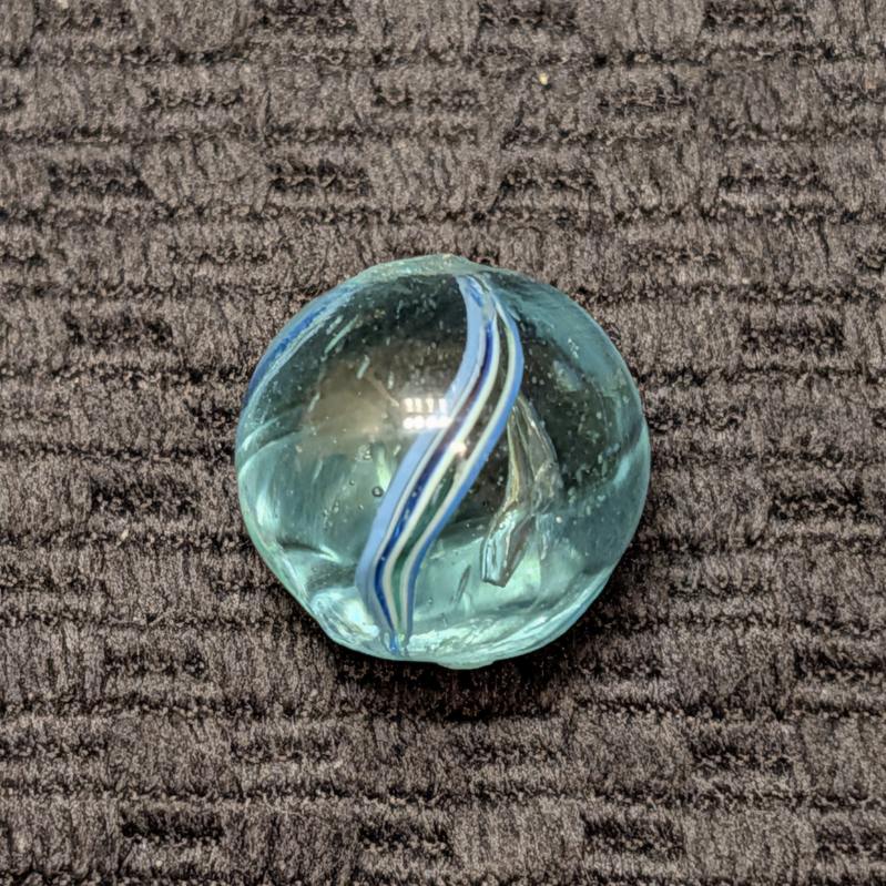 21/32″ Attractive Coreless Swirl w/ Unusually Colored Triple Ribbons of Periwinkle Blue, White, Jelly Lime Green & Dark Blue and an elongated internal bubble. Wet Mint with minor as made surface Cold Rolls.