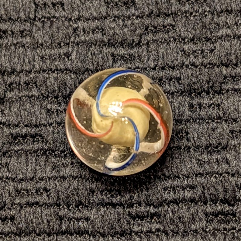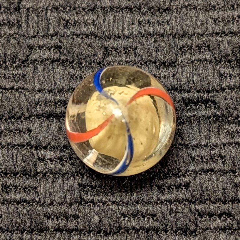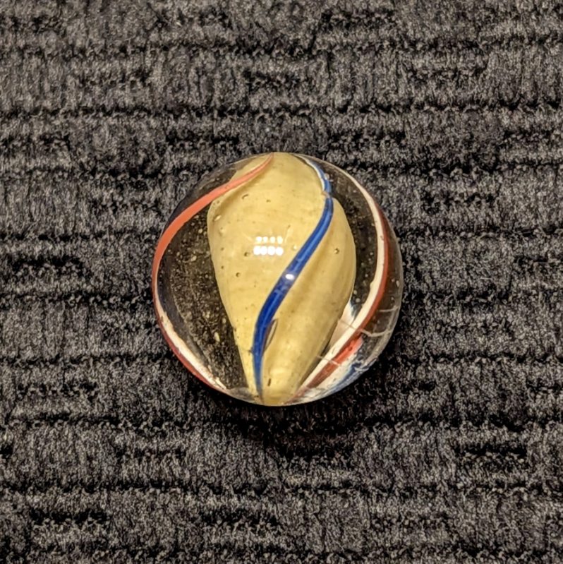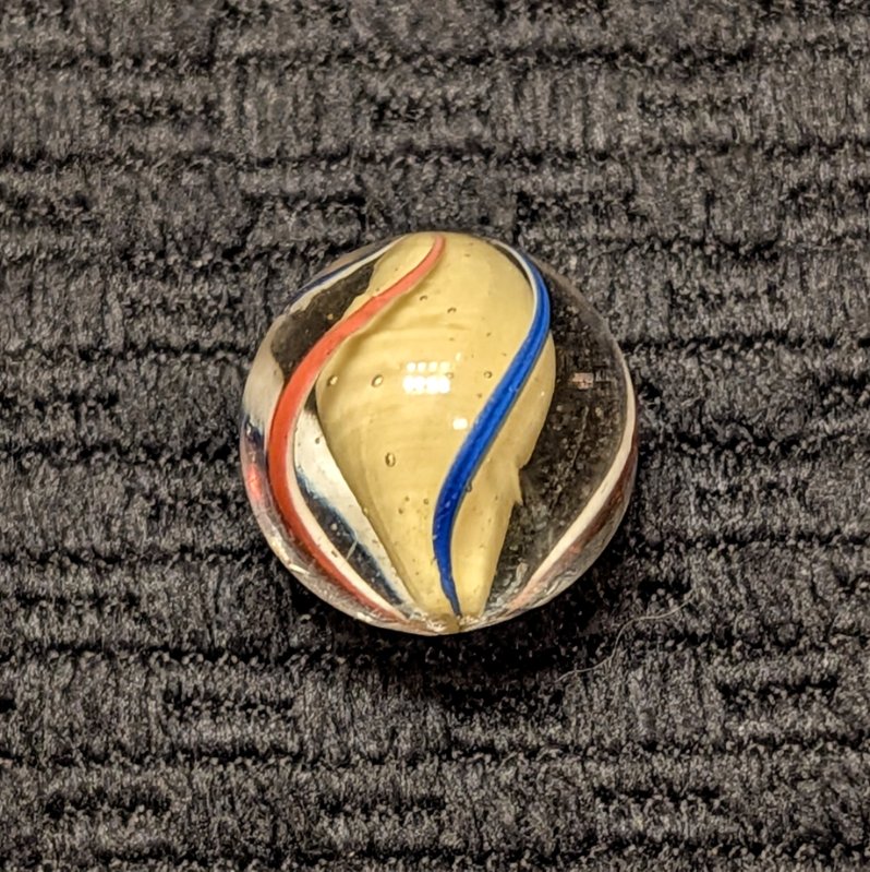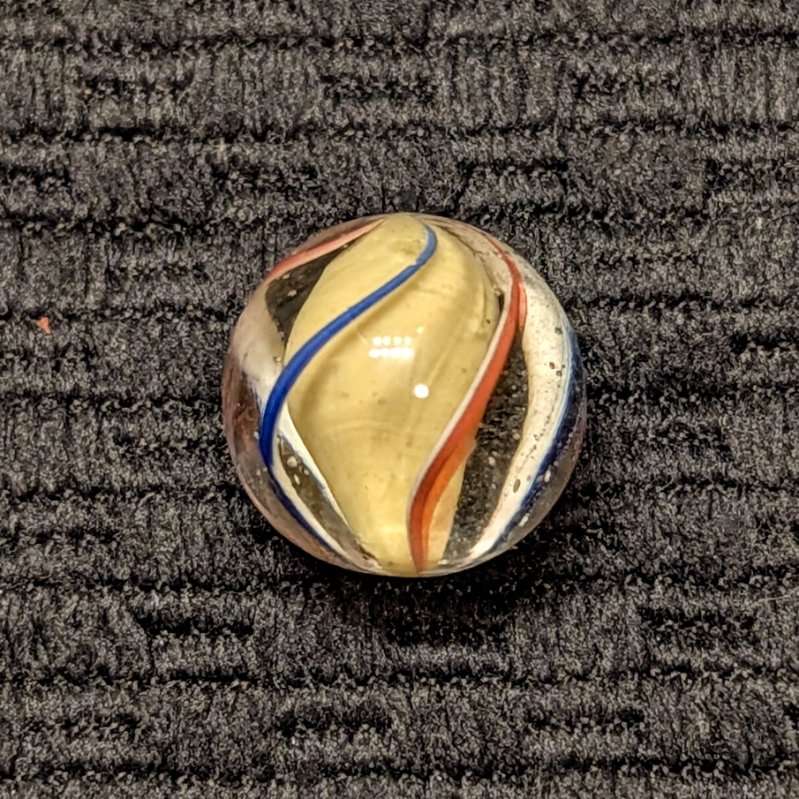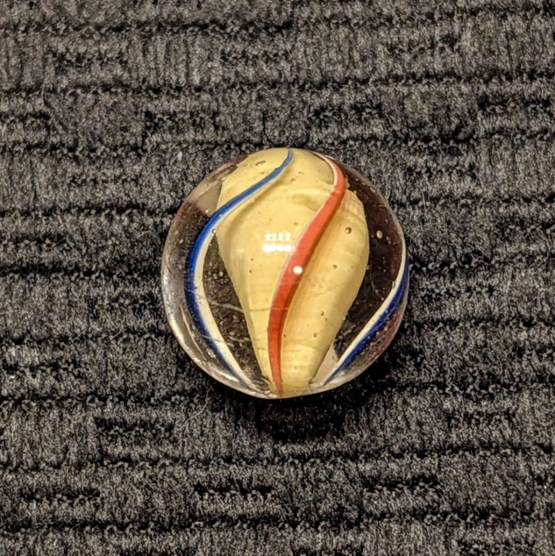 Nice Unusual Saffron Yellow Color Solid Core Swirl with narrow opposed Blue/White and 2 Red/White ribbons. Early faceted pontil dates this to circa 1850-1880. Wet mint original surface.