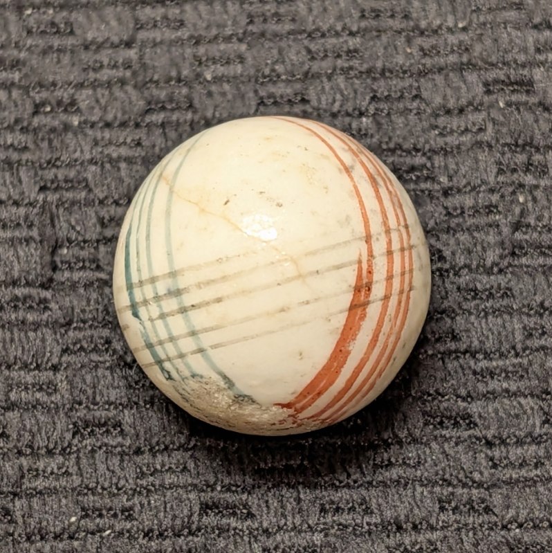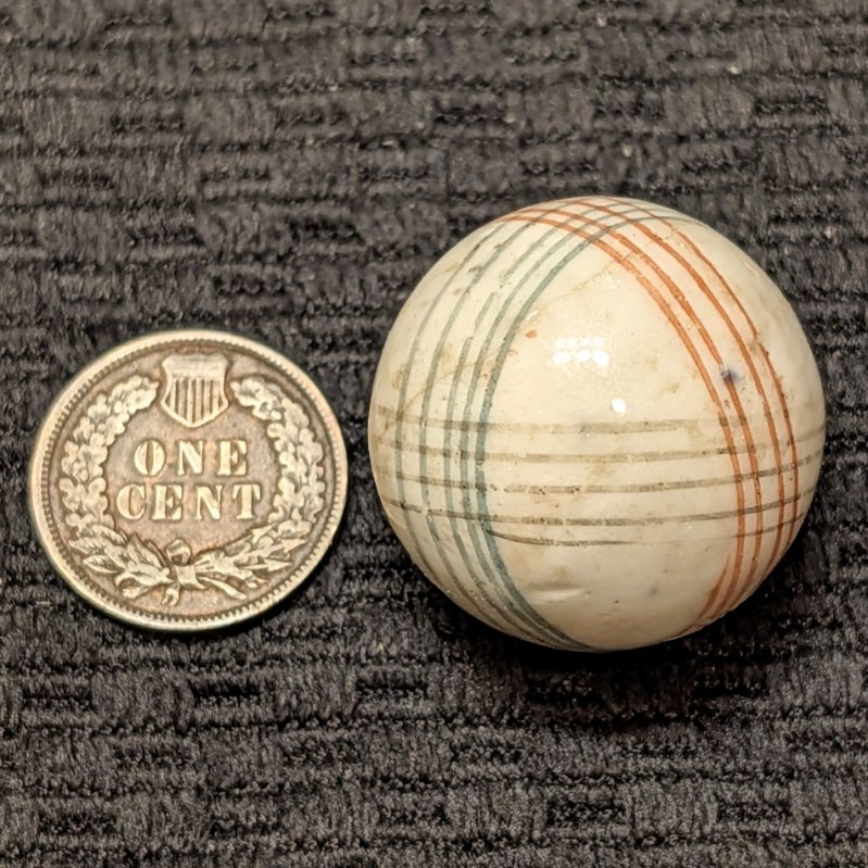 Unusually Big Over 1″ Glazed China w/ 3 color 3 spirals at different crisscrossing angles. Slight crack. Wet Mint-.  Coin for size comparison, not included.