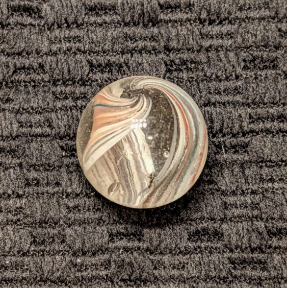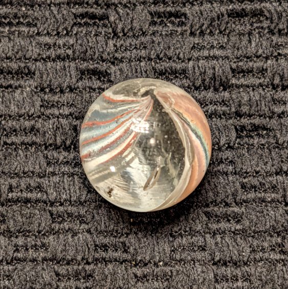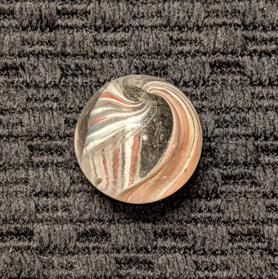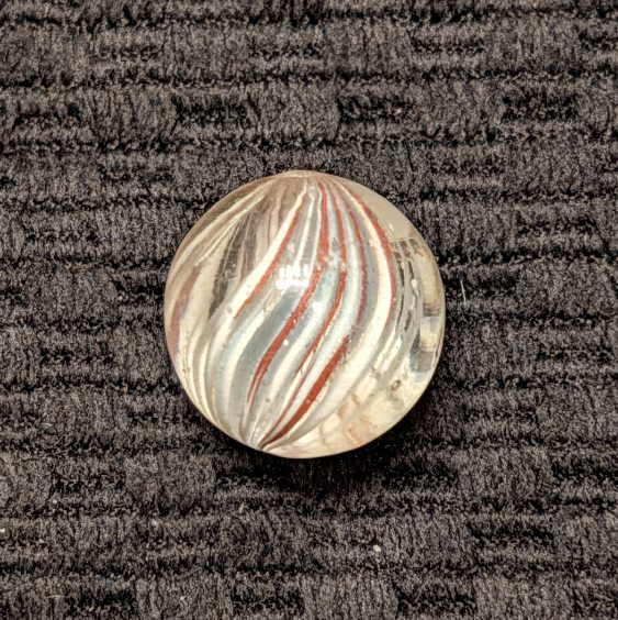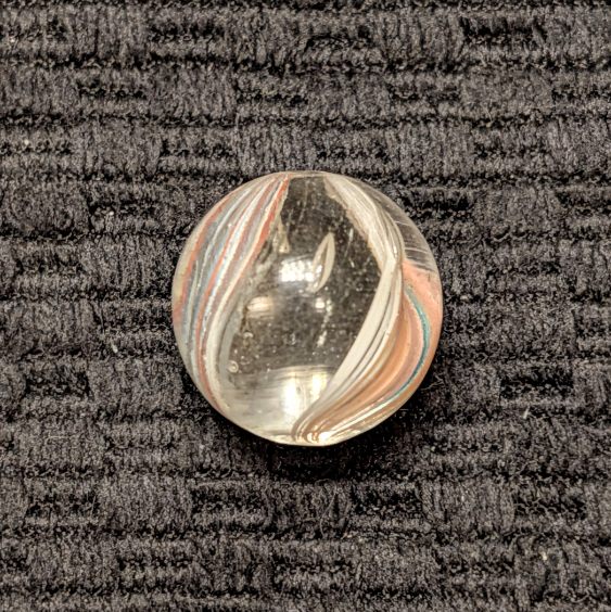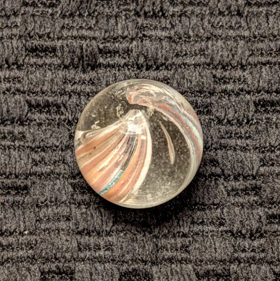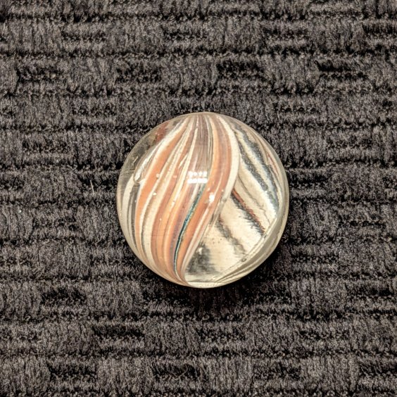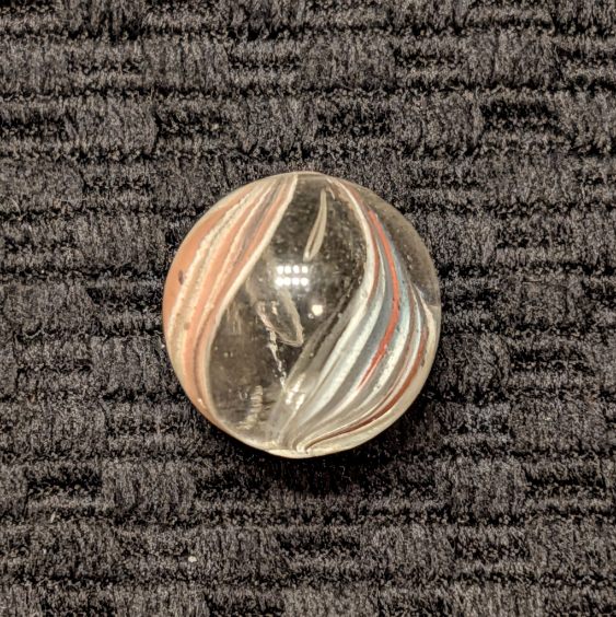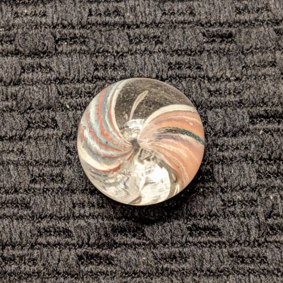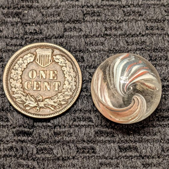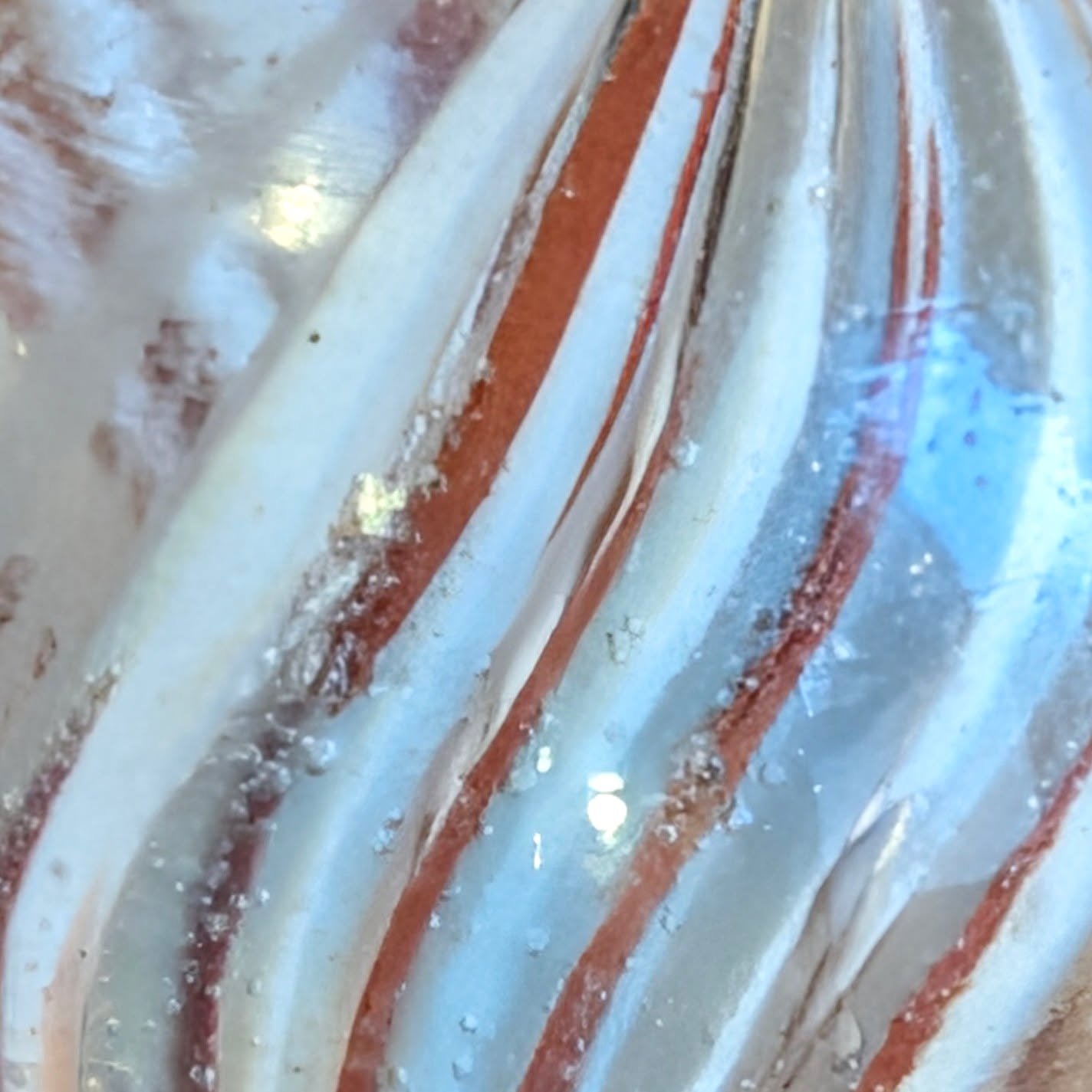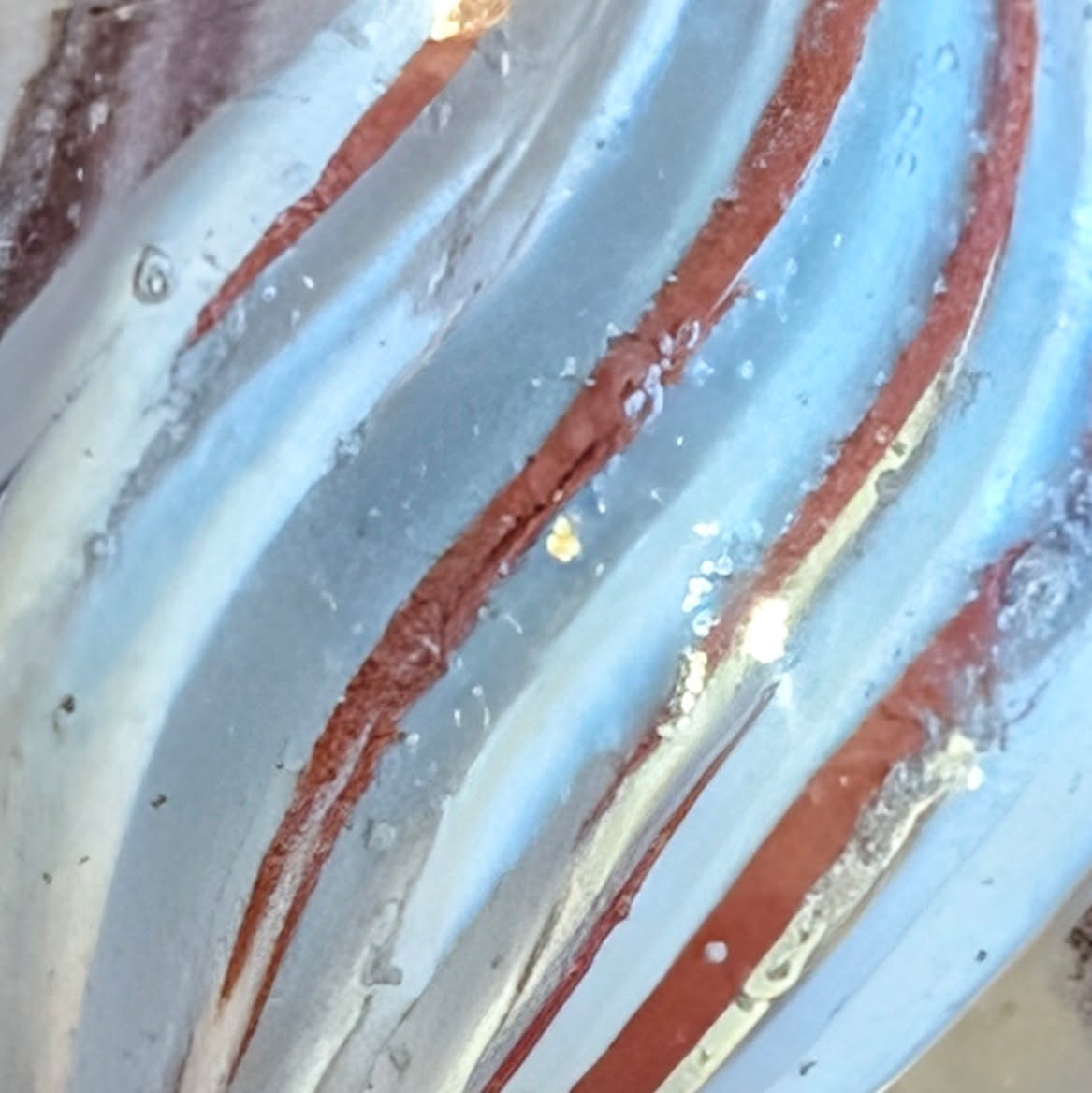 Very Rare Double Ribbon Onionskin w/ an Oxblood, Blue, White & Mica Onionskin Razor Ribbon and an opposed Pink & Blue over White Onionskin Razor Ribbon, and open panels between them. This is one of the rarest and seldom seen type of onionskin ever made that breaks the rules of onionskins, as highlighted in YouTube’s Keepers of the Marbles Onionskin Series (video 6). Very early period, circa 1850 and shortly after. Faceted pontil. Wet Mint. Coin not included. Here’s a chance to own a true museum quality rarity. From my personal collection.