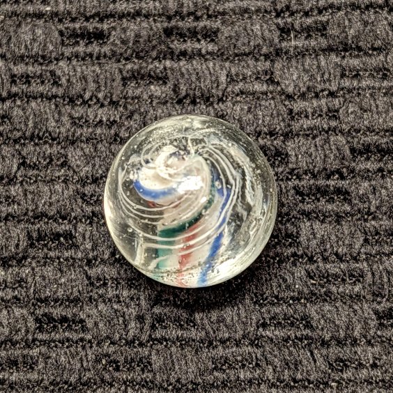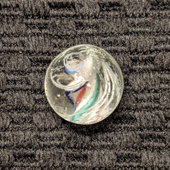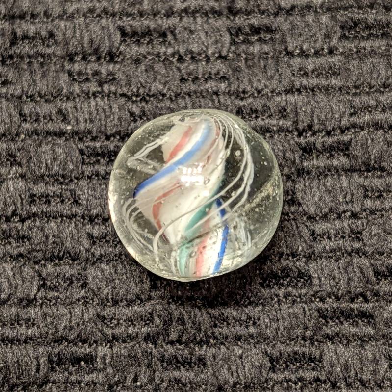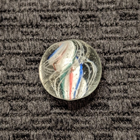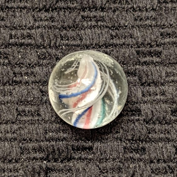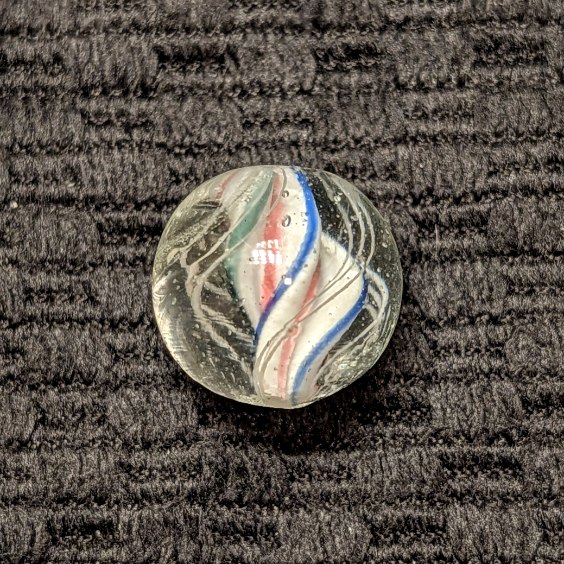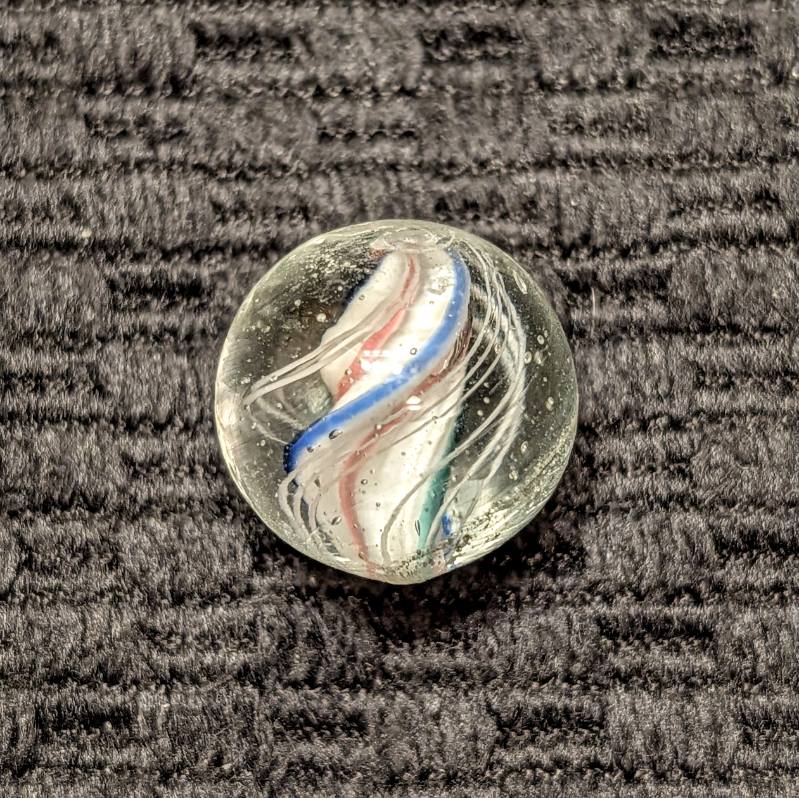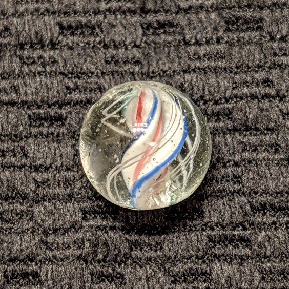 Rare Strong Left-Twist & Deeply Triple-Ridged Solid Core Swirl of White Base with Red Stripes in the Deep Valley and Pointed Ridges Trimmed in Blue and Green. 3 Sets of Closely Spaced Triple White Outer Threads. A Very Hard-to-Find Variety that has Become Extremely-Hard-to-Find Because of the Strong Counter-Clockwise Left Twist! Wet Mint.