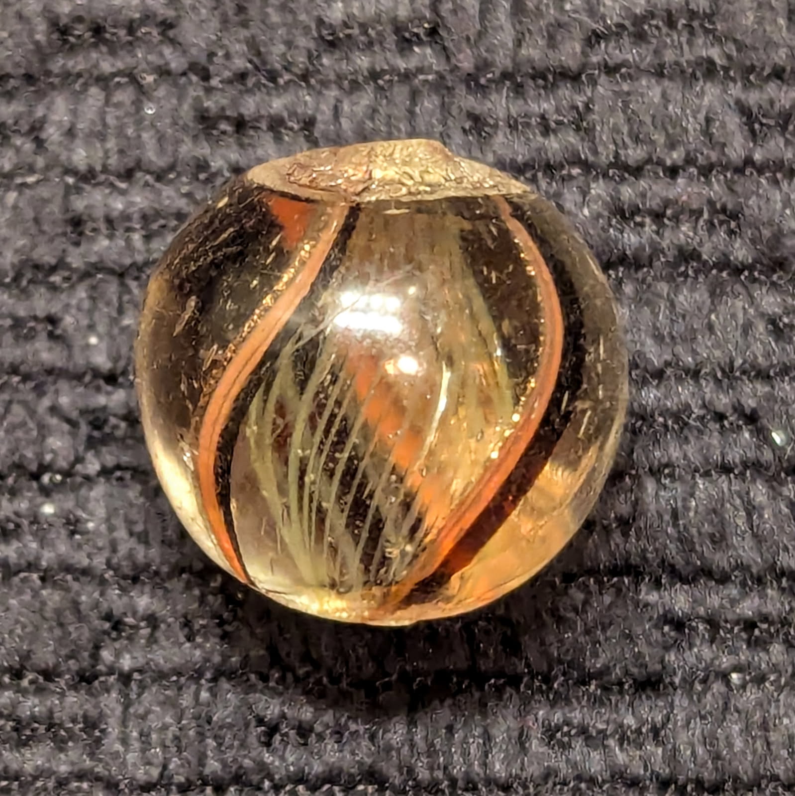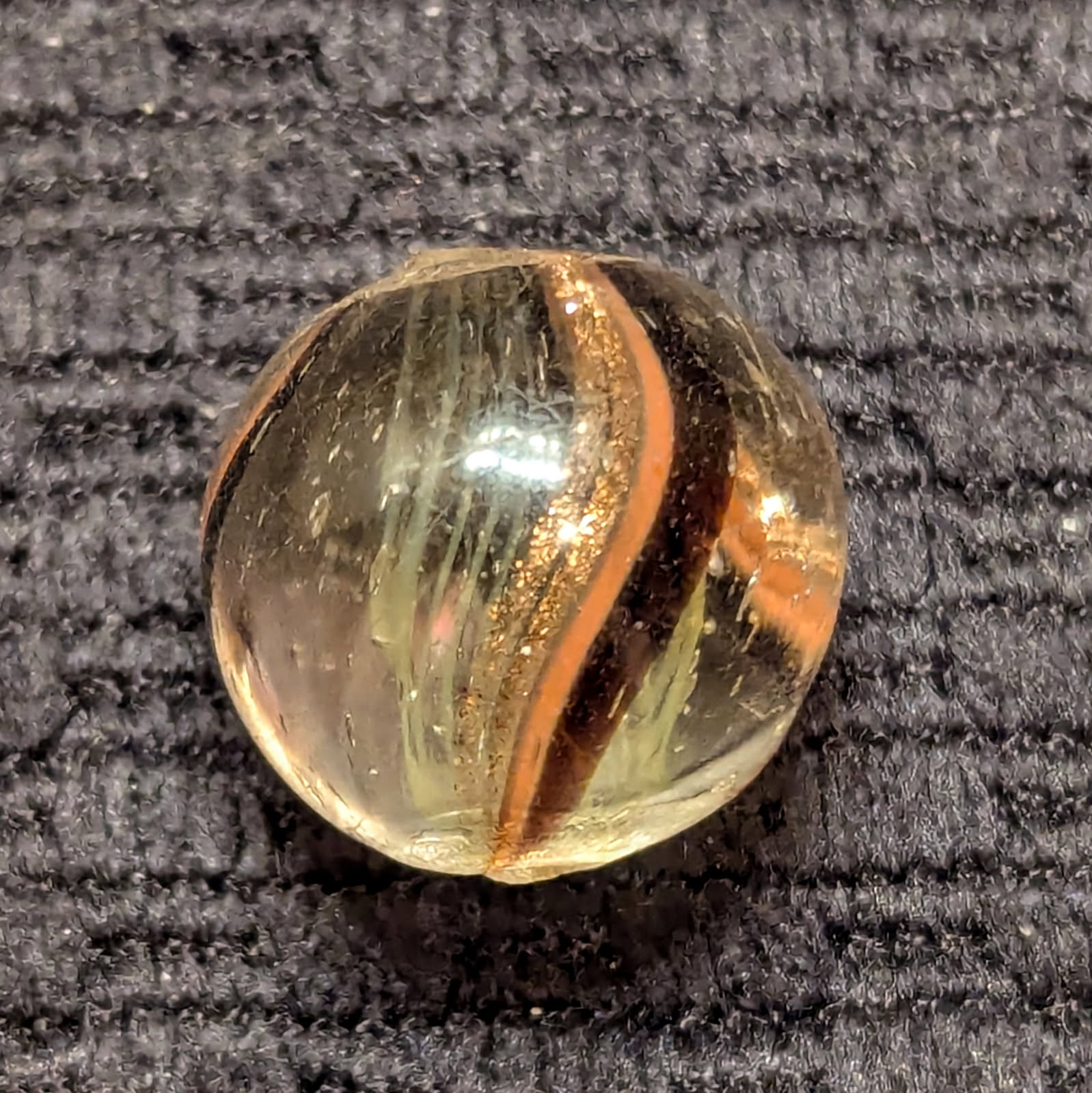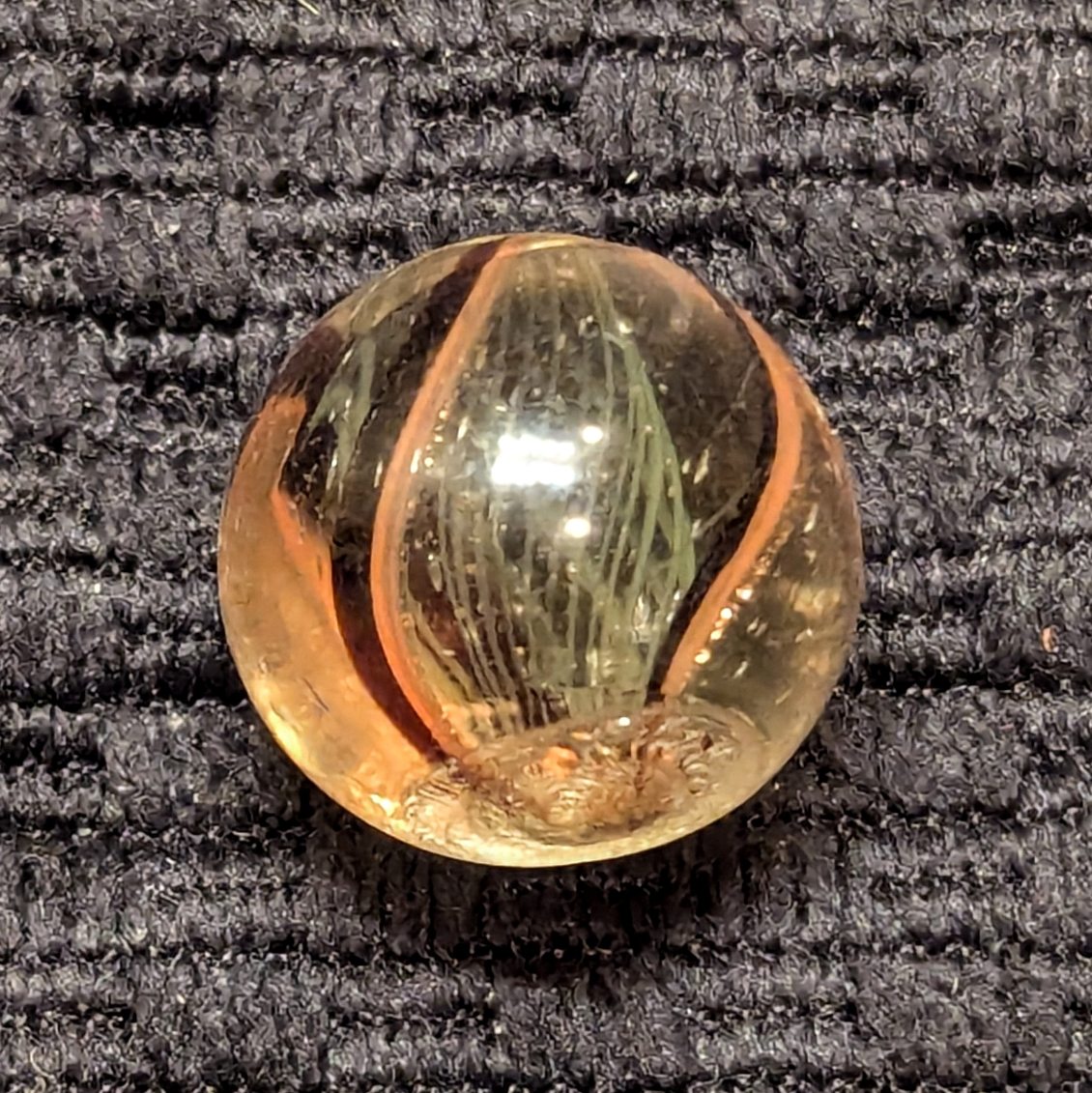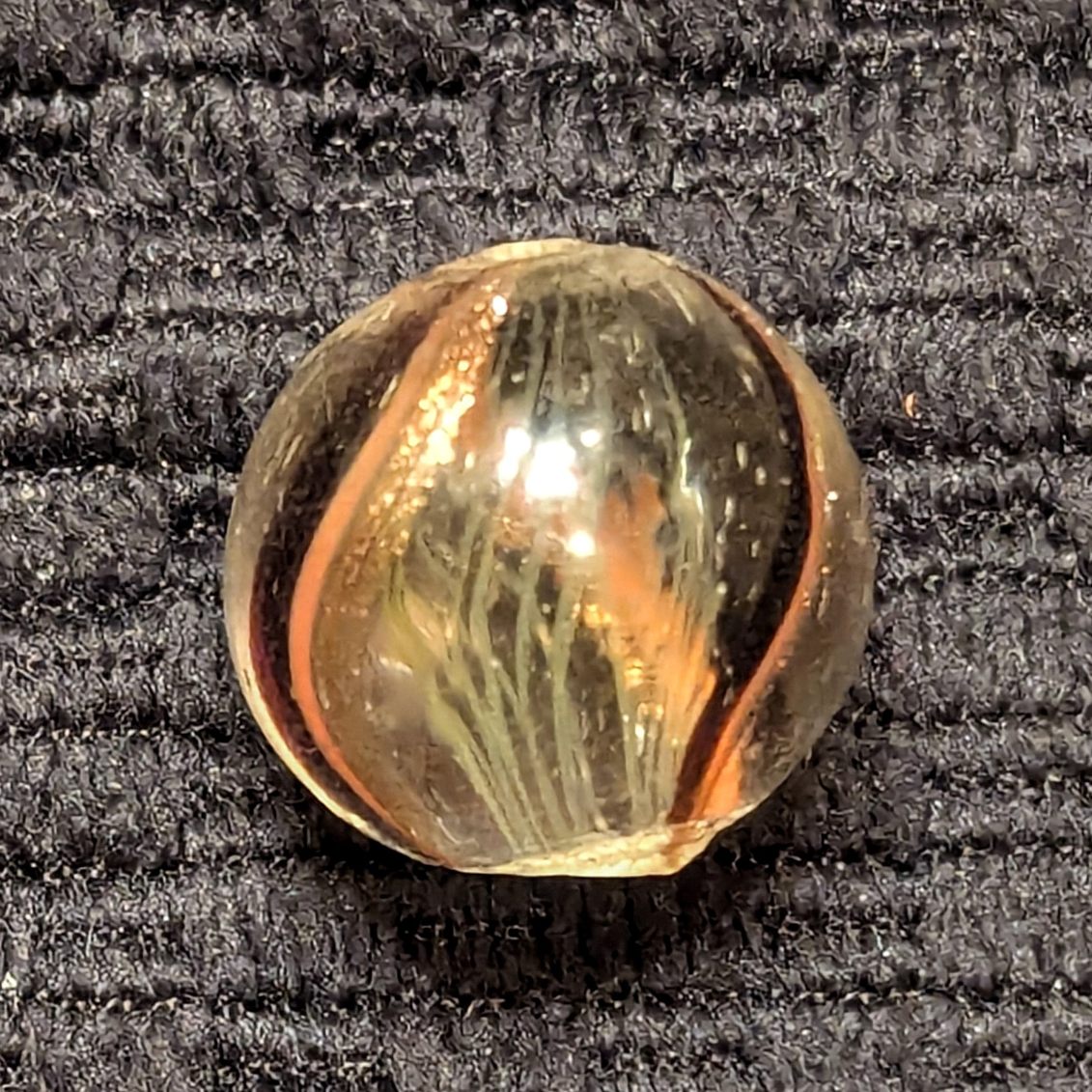 Very Rare Yellow Latticino Core Swirl w/ 3 Lutz Bands! Each outer band contains red, transparent jelly purple, and lutz! This is almost unheard of! Mint and original.