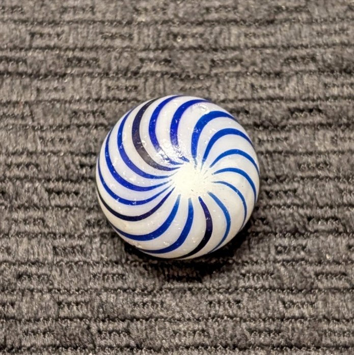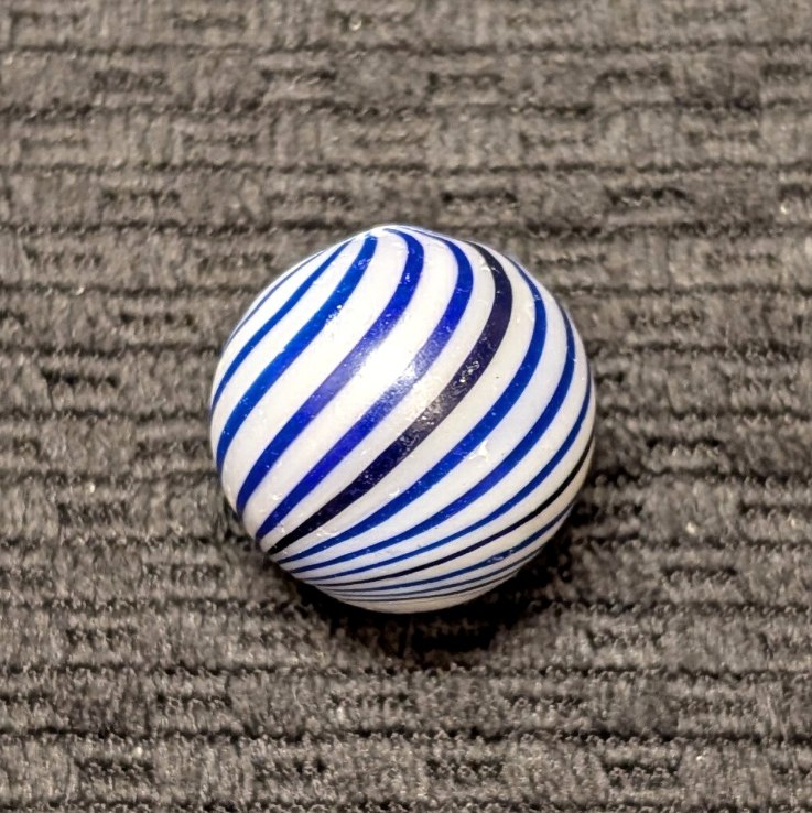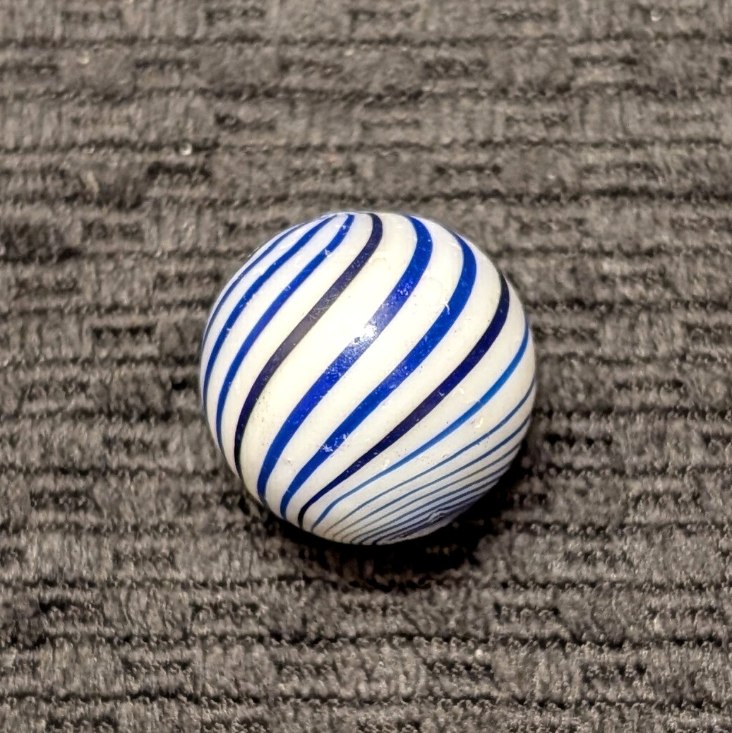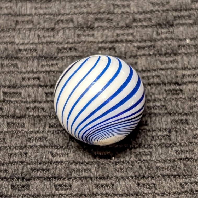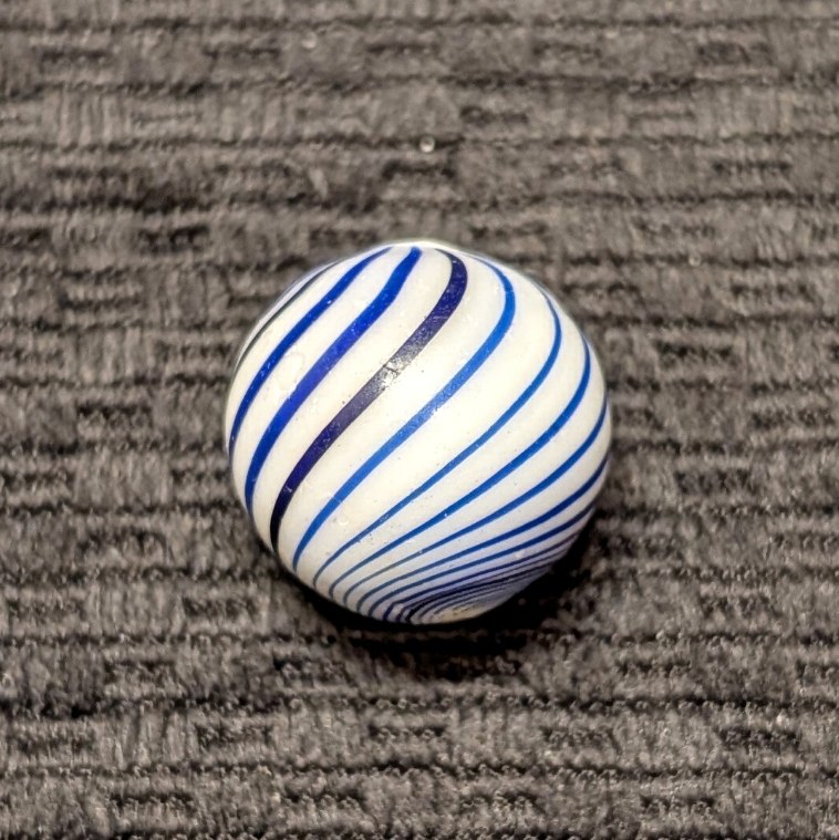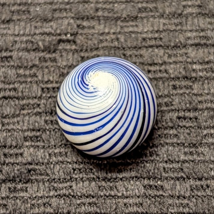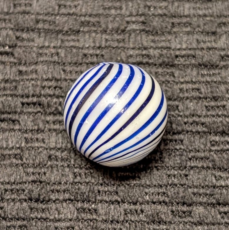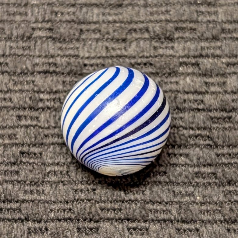 VHTF Big Clambroth Over 13/16″ Rarely Seen this Large. There are 16 Evenly Spaced Bold Blue Lines so strong, that some even look Black! Symmetrical spacing and attractive spin at the pontil. Very minor handling.