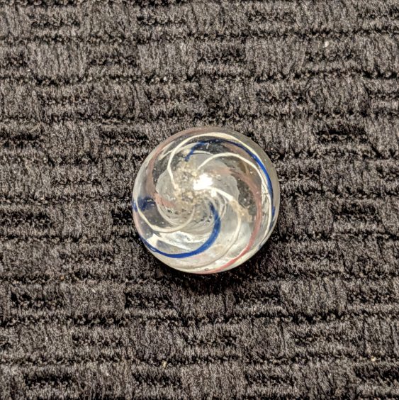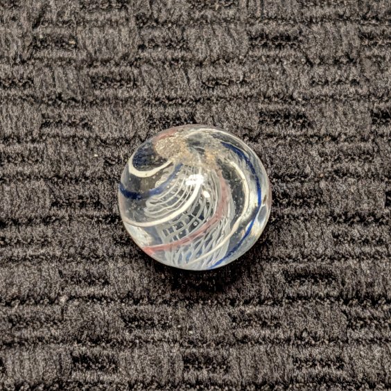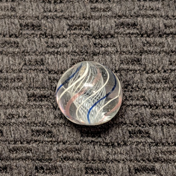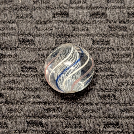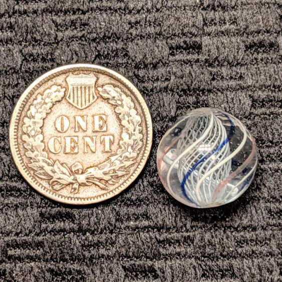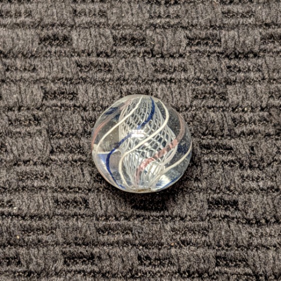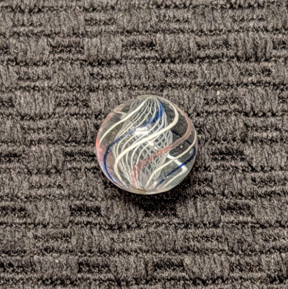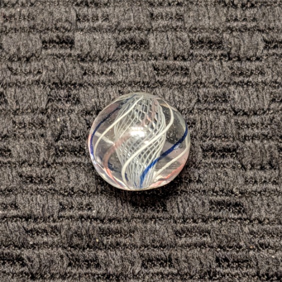 Extremely Well Made 1/2″ Peewee White Latticino with a cage of 8 outer evenly spaced lines of repeating white, transparent blue, white, transparent pink, etc. Wet Mint. Coin for size comparison purposes, not included.