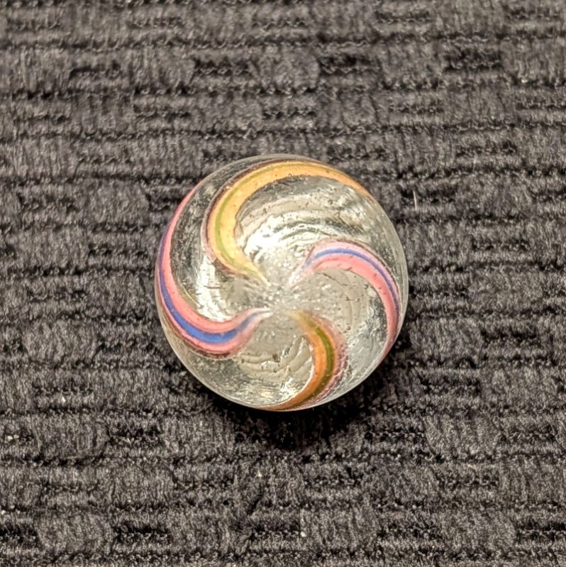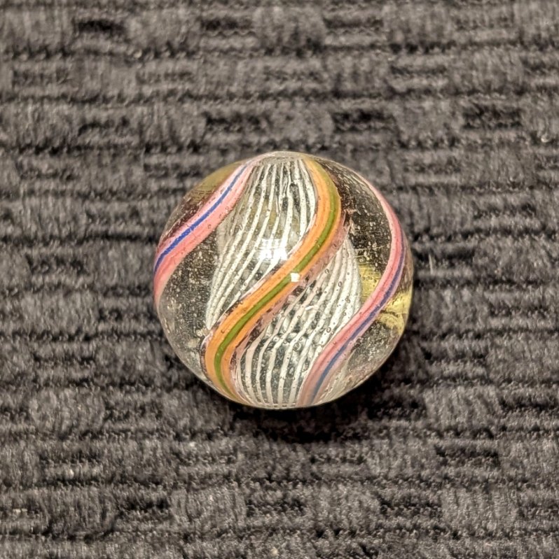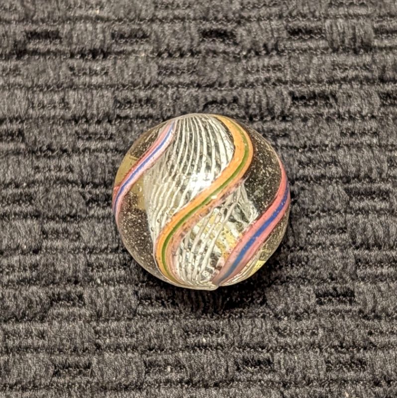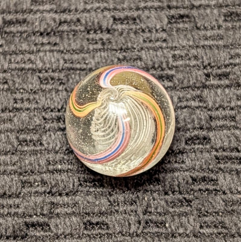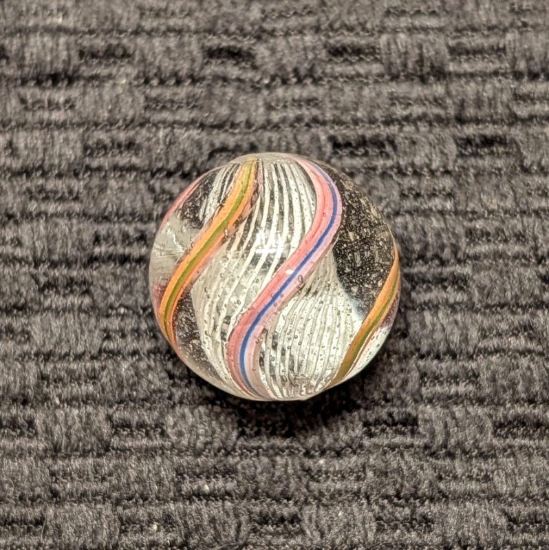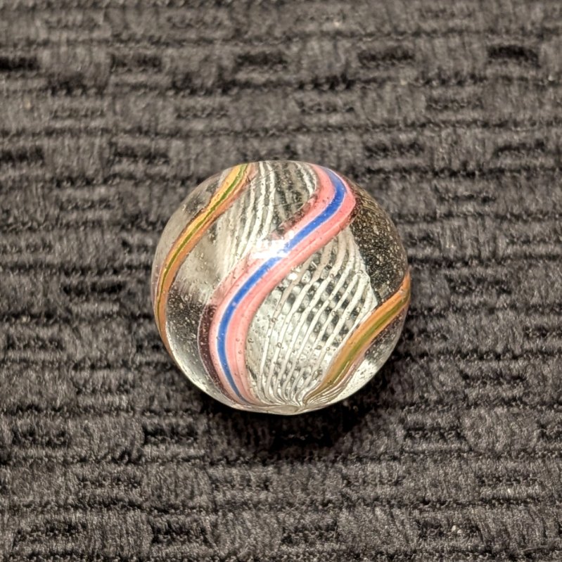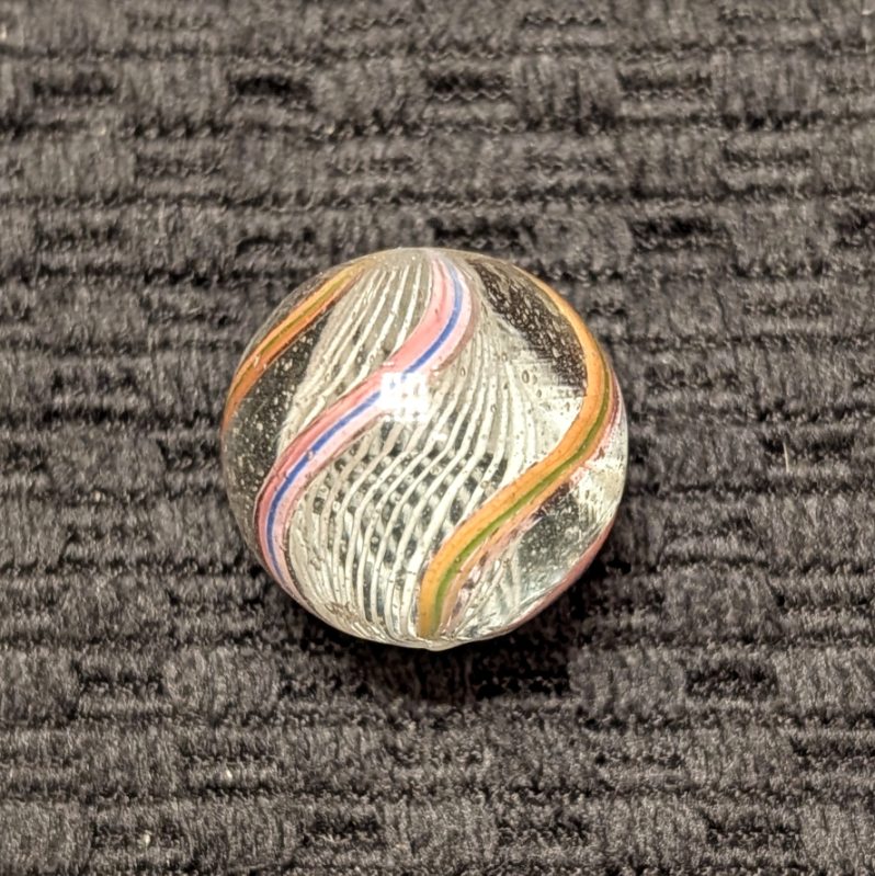 Nice White 3/4″ Latticino with Colorful Striped Ribbons. Only a tiny flea near the pontil on an otherwise wet mint surface.