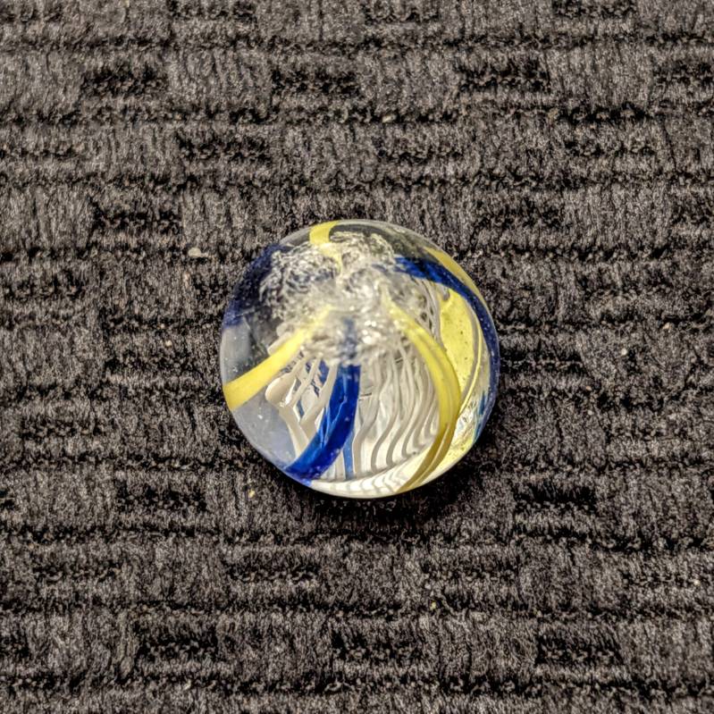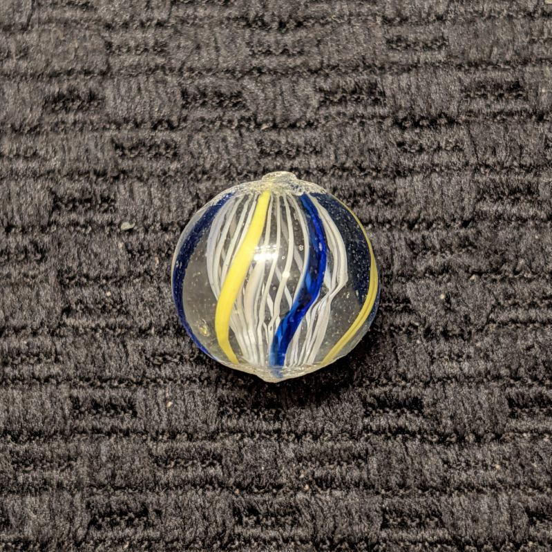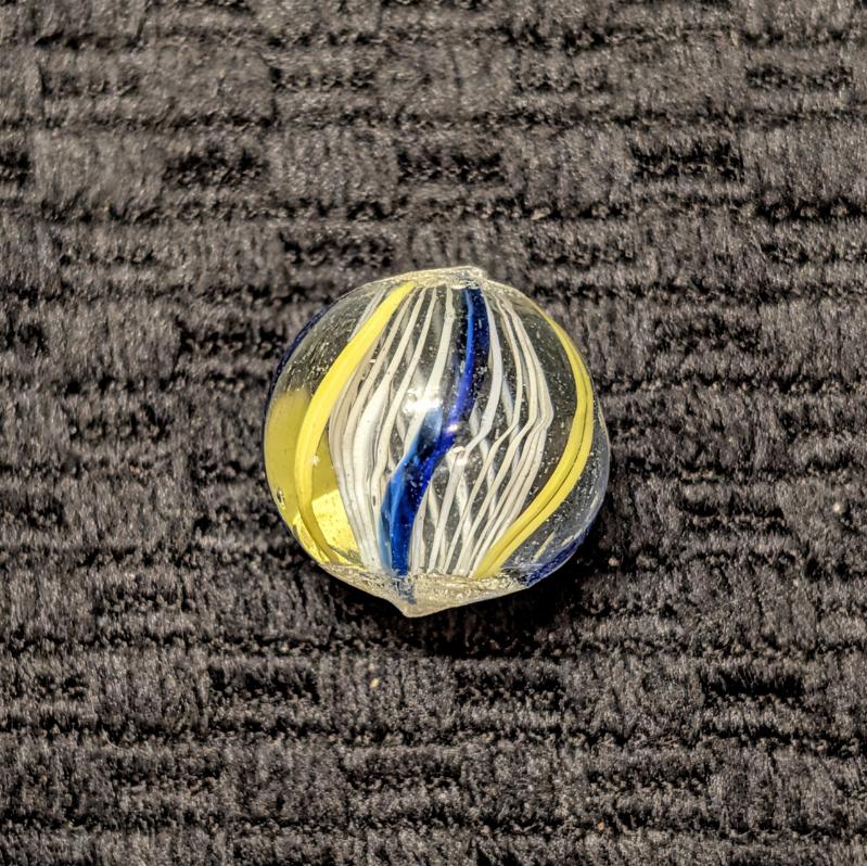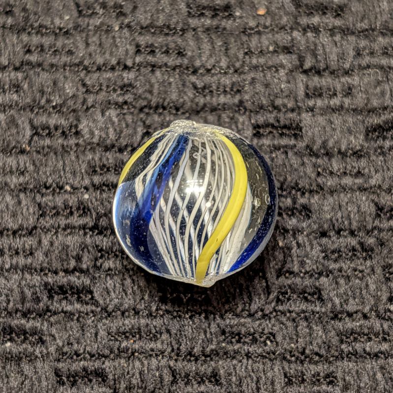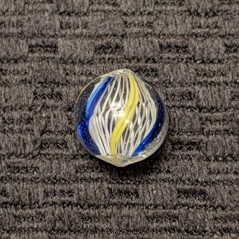 White Latticino w/ 6 Outer Ribbons of Alternating Yellow & Transparent Blue, an attractive contrast. Prominent pontils, cold roll and a tiny fleabite. Shiny Wet Mint-.  Free to a young collector age 16 or less, or a new collector under 1yr.