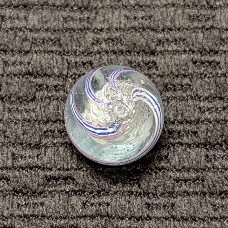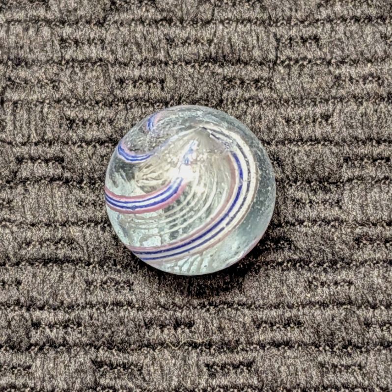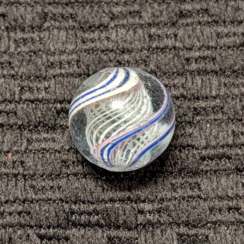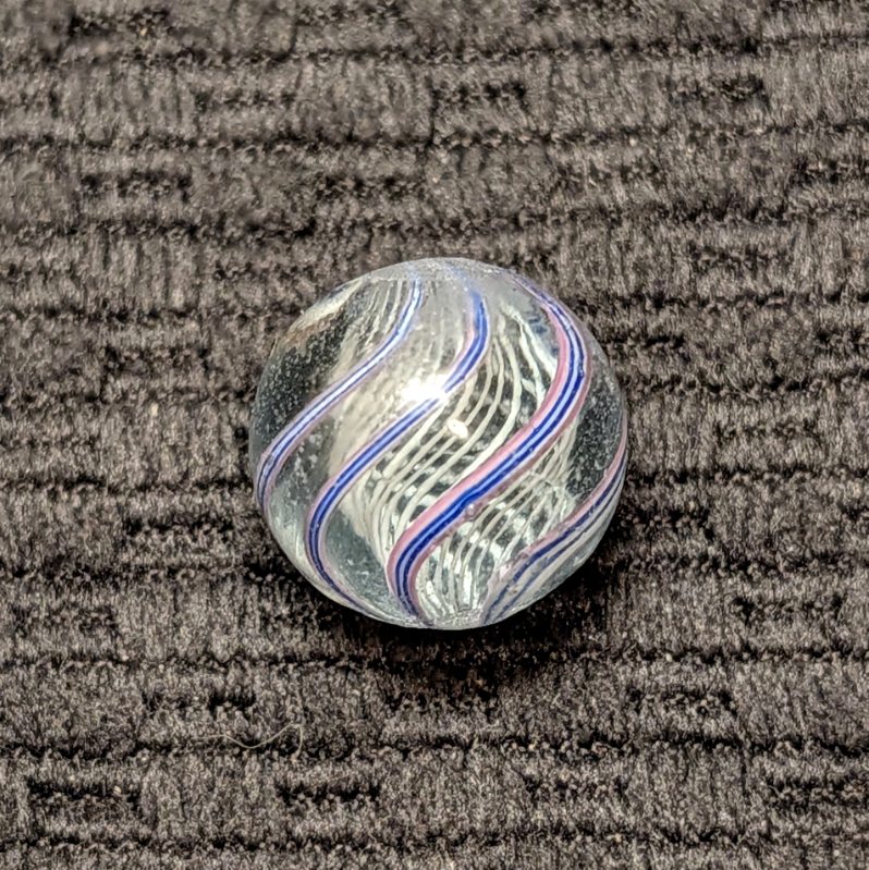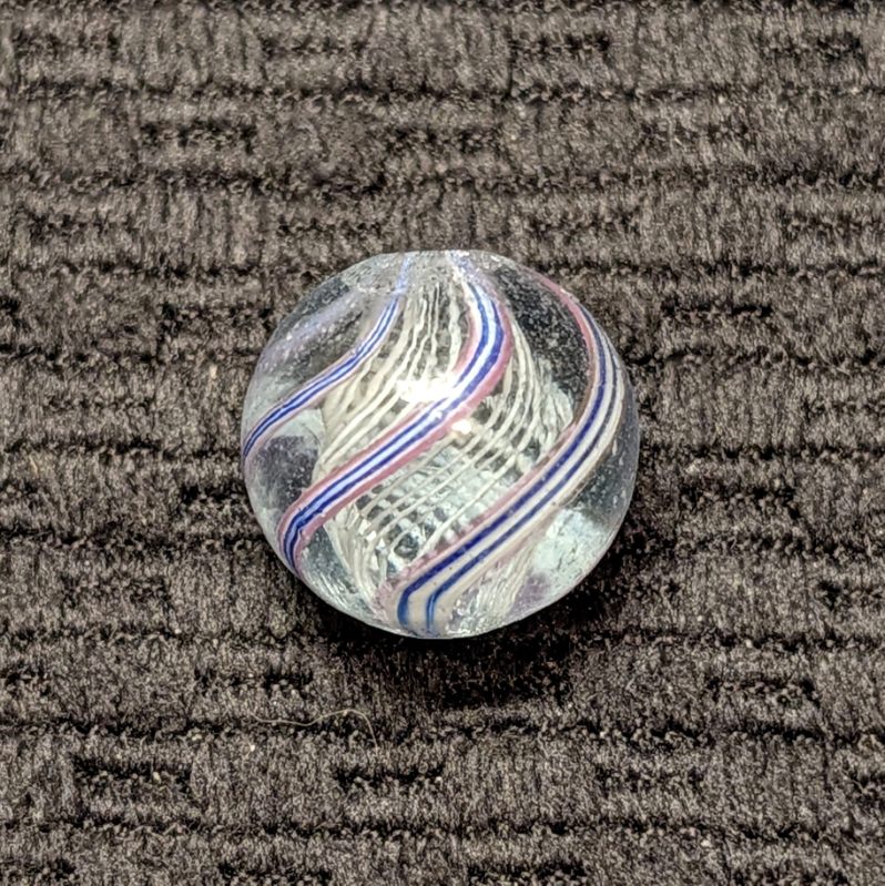 White Latticino Swirl in Light Blue Tinted Glass w/ Striped Red-White-Blue Ribbons. Mint original surface.