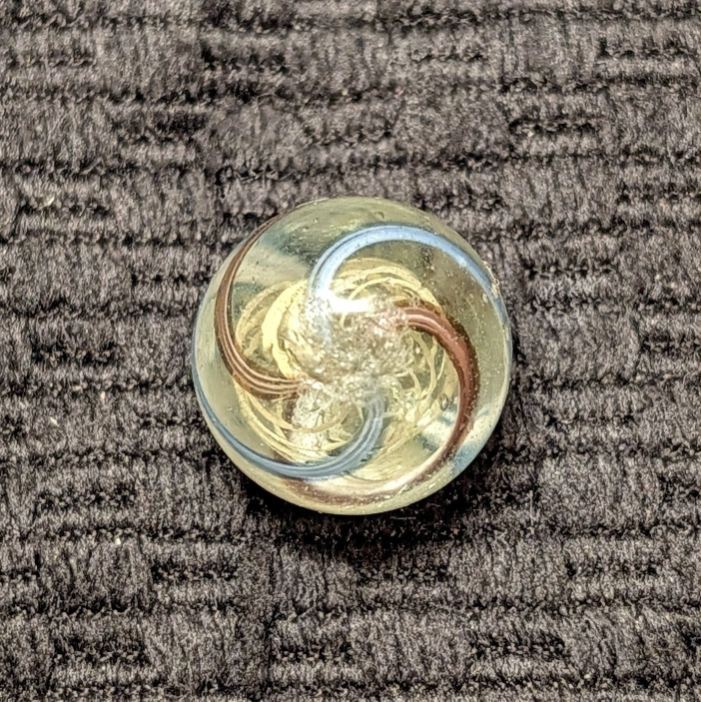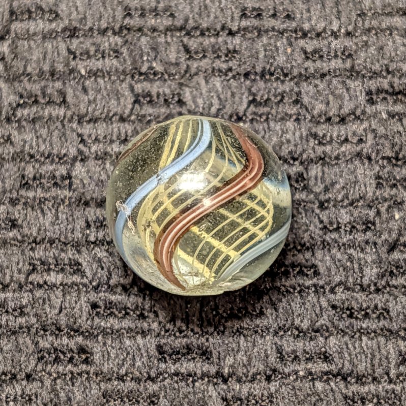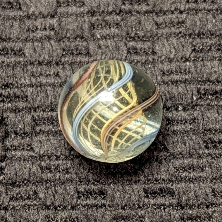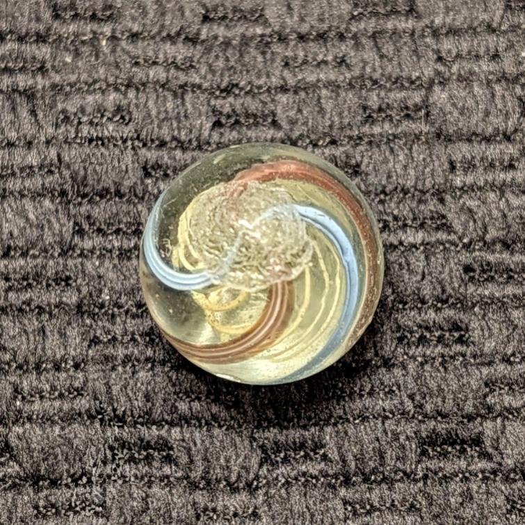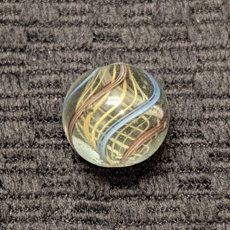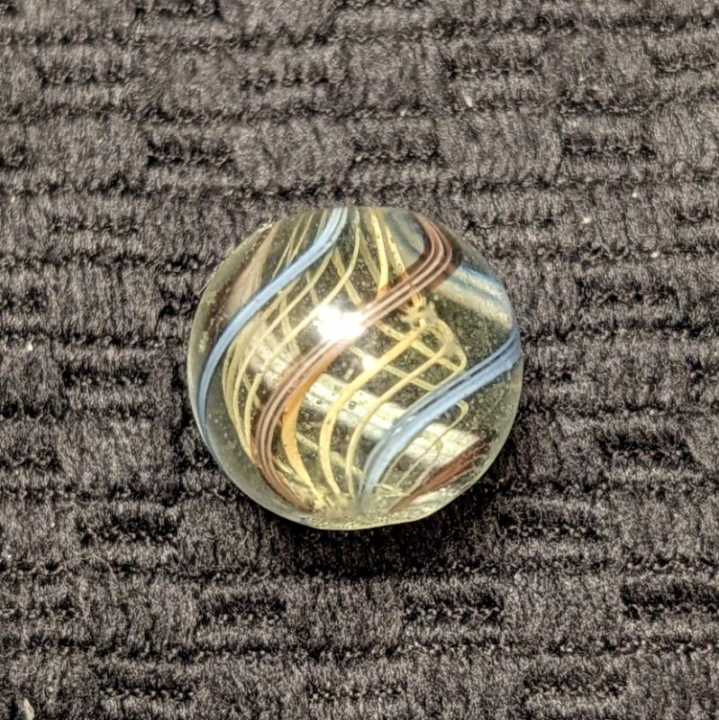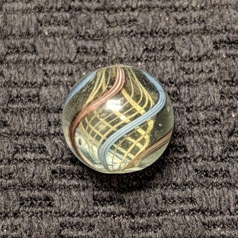 A Sweet Yellow Latticino Swirl with Transparent Blue & Uncommon Purple Ribbons (a HTF color!) w/ White Stripes. Shiny surface with a couple pin pricks, maybe as-mades.